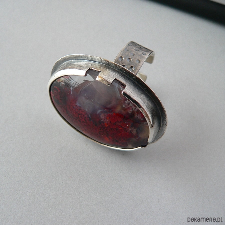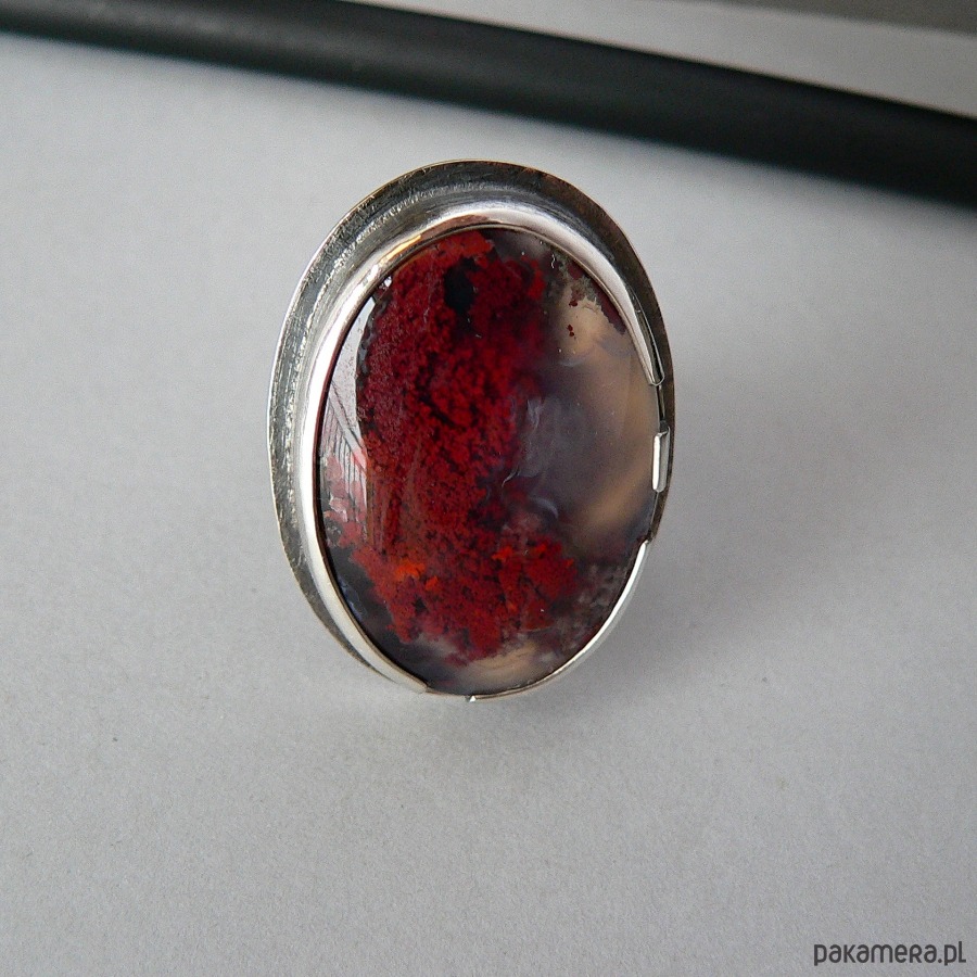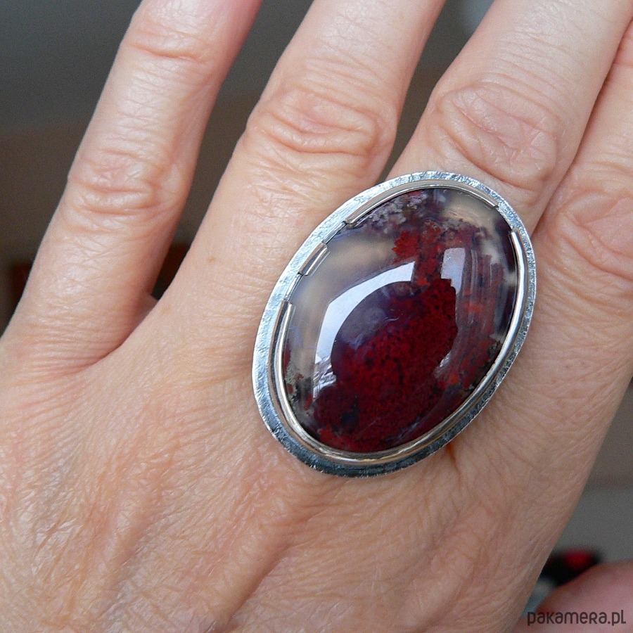 Pierścień wykonany ze srebra i wyjątkowej urody agatu mszystego . Kamień pochodzi z indonezji, charakteryzuje się inkluzjami przypominającymi mech, w zielonym (chloryt) lub bordowym kolorze ( tlenek żelaza).Wymiary kamienia- 3,4/2,4 cm Srebro kute, oksydowane i polerowane. Szerokość obrączki- 0,7 cm Rozmiar regulowany, przy zakupie proszę podać noszony rozmiar, ustawię obrączkę. Mimo sporych rozmiarów pierścień nie jest bardzo ciężki.