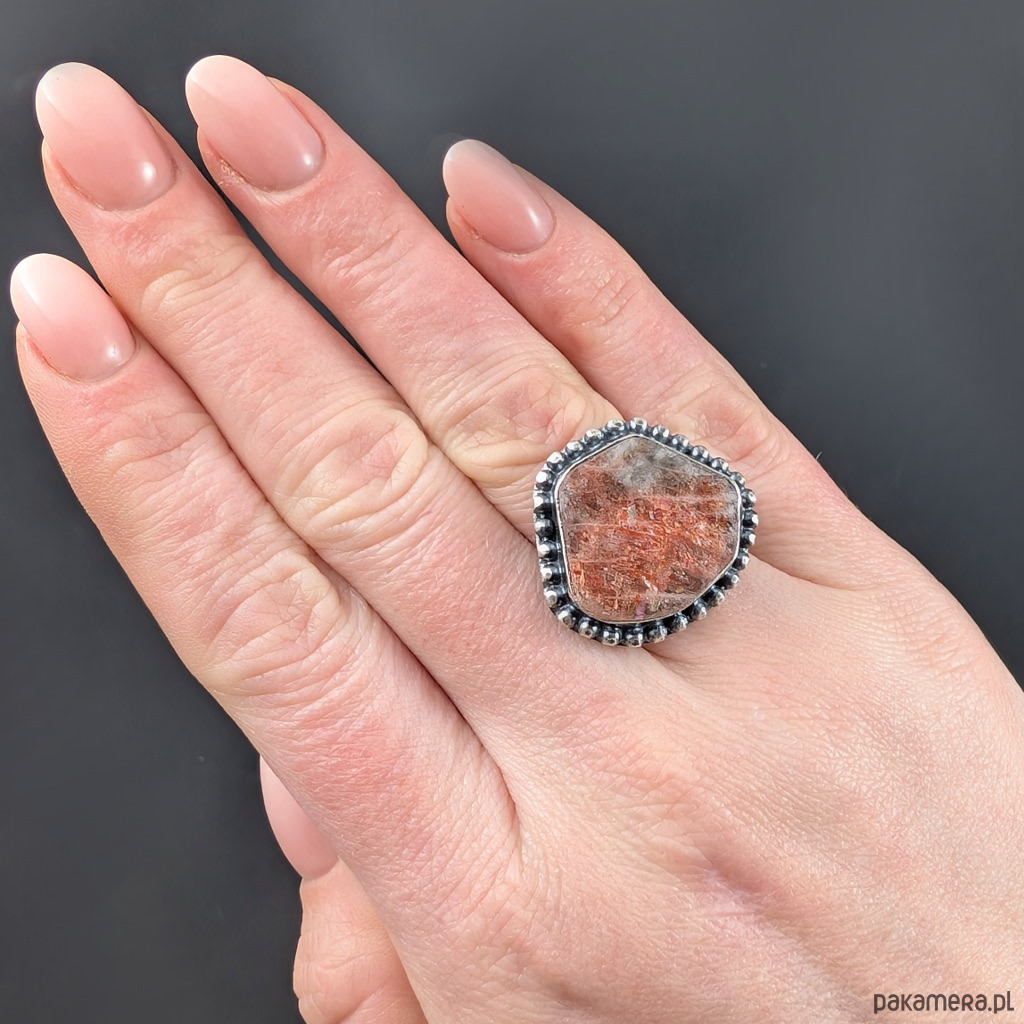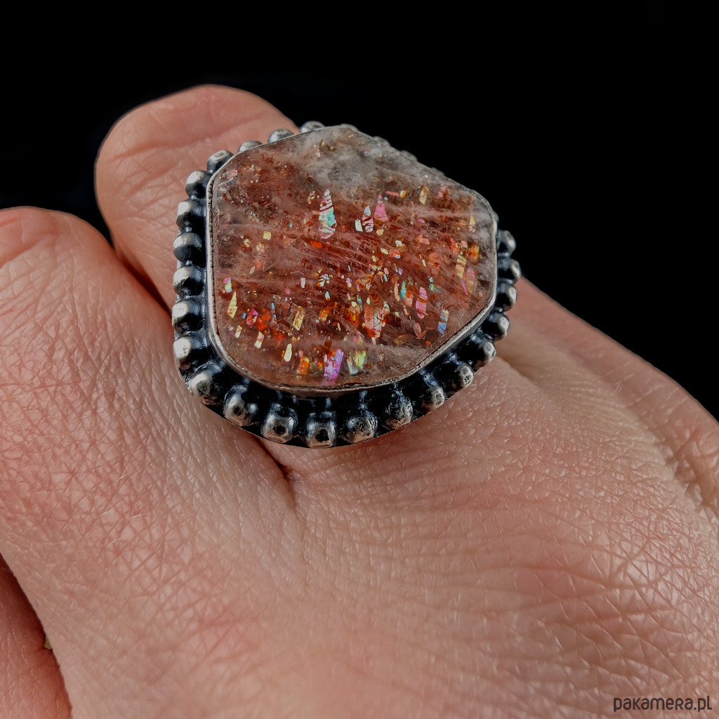 Niezwykle mienią się w słońcu i świetle maleńkimi różowo-czerwonawymi drobinami. Kamień ma oprawę 26 x 23 mm. Rozmiar jubilerski obrączki 12, mogę powiększyć na max 13. Waga 11 g. Srebro skąpane w oksydzie. Zostanie wysłany w ozdobne pudełeczko.