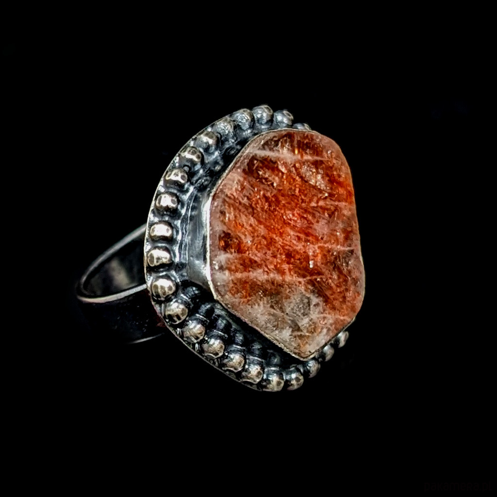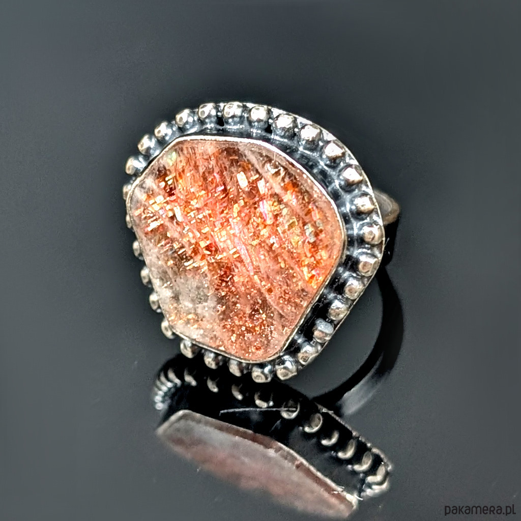 Pierścień wykonany z oksydowanego srebra próby 925. Gładką, klasyczną obrączkę ( 5 mm szerokości) zdobi wyjątkowy okaz kamienia słonecznego zwanego inaczej skaleniem awenturynowym. Rzadki minerał wykazujący tzw.efekt awenturyzacji w postaci maleńkich mieniących się wrostów- łusek innych minerałów, np.hematytu.