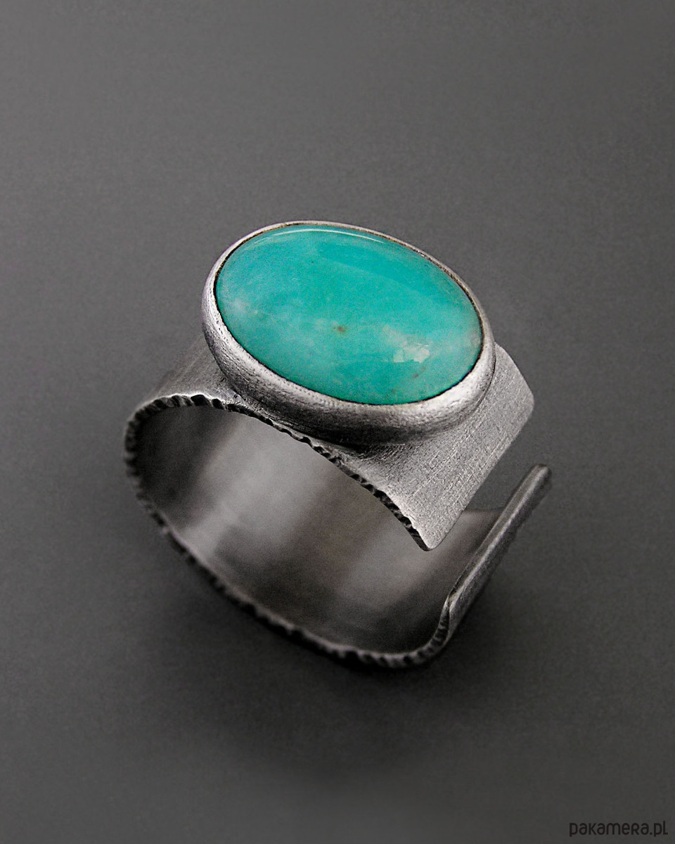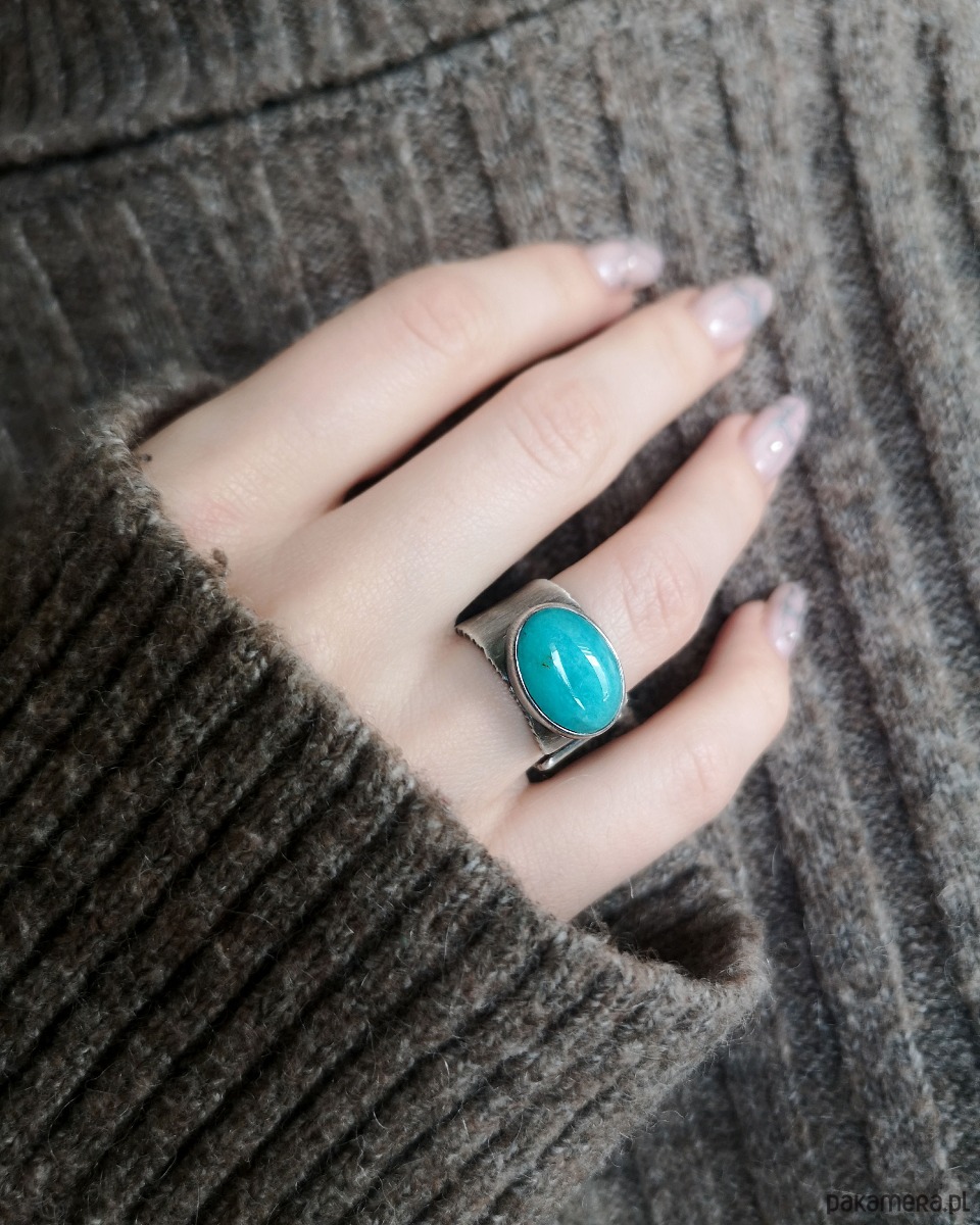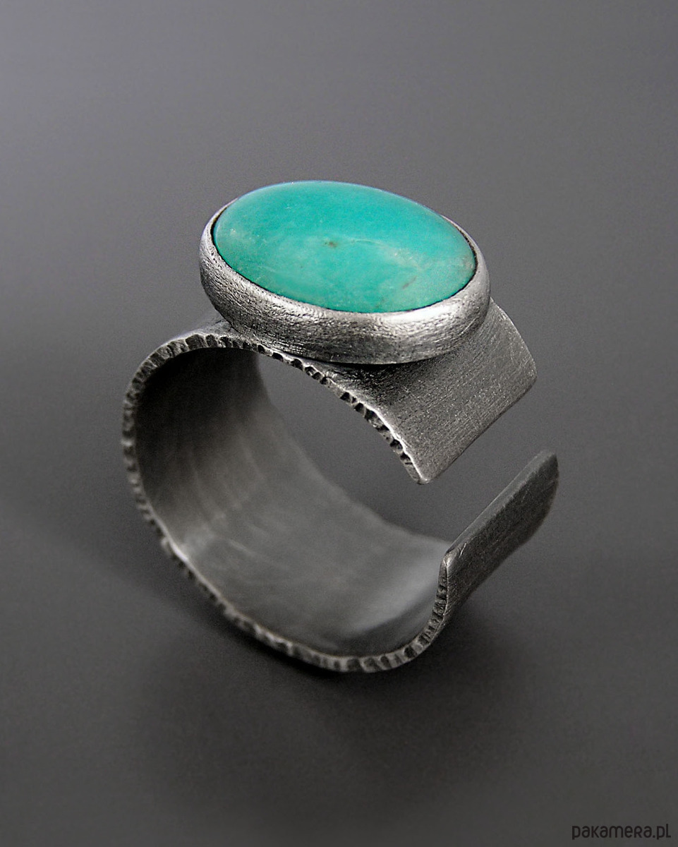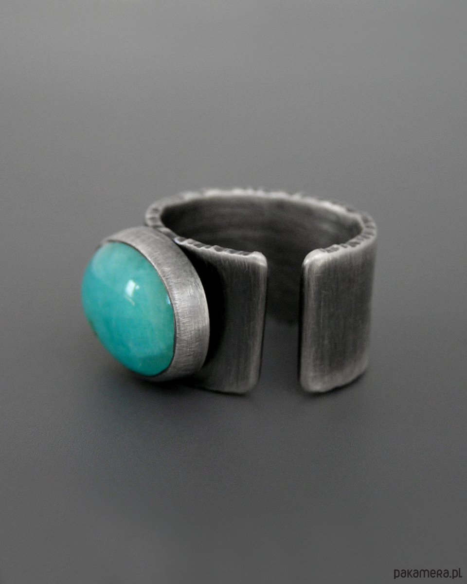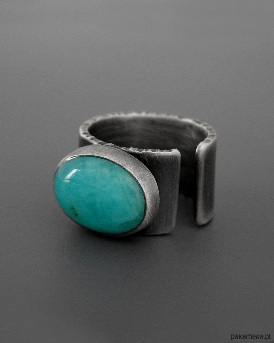 Unikatowy surowy pierścionek z Amazonitem- wykonany ze srebra 925. Patynowany i szczotkowany.