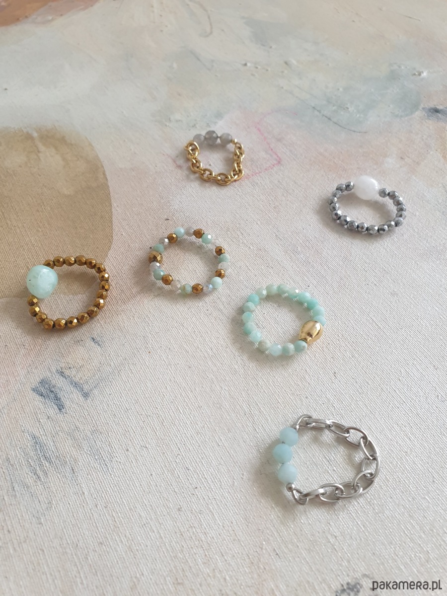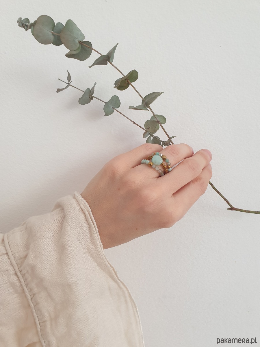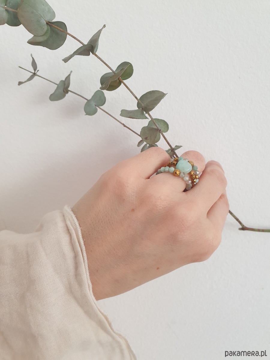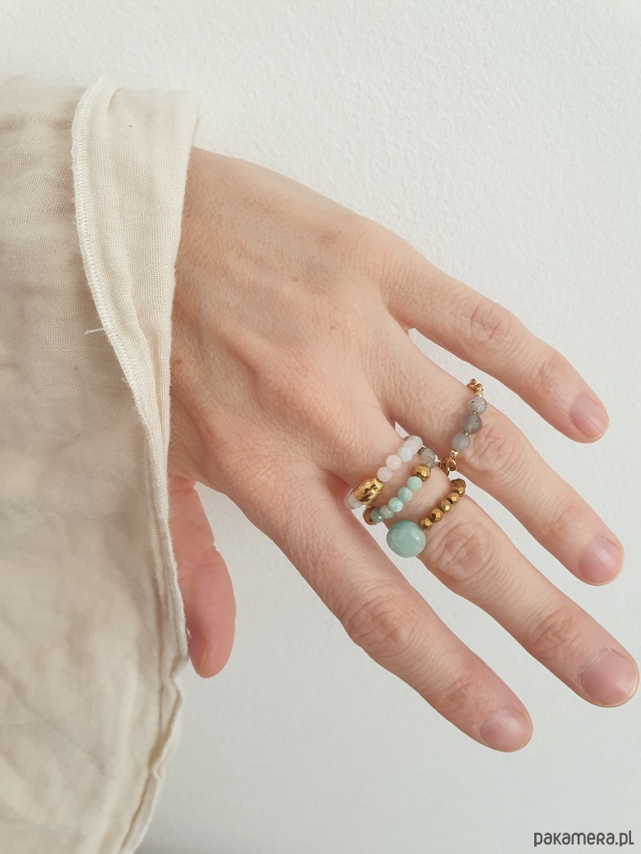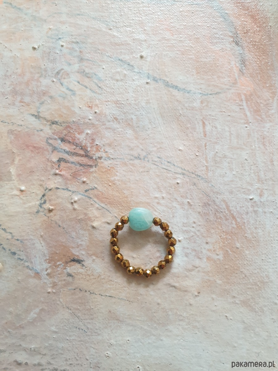 Pierścionek w pastelowych kolorach, tworzony z kamieni naturalnych, nawleczonych na elastyczną gumkę jubilerską (najmocniejsza na rynku gumka Ninja cord, wolna od latexu) W tym pierścionku kamienie: amazonit i złoty hematyt. Pojedyncze egzemplarze ze względu na unikatowość kamieni, możemy powtórzyć wzór podobny w zależności od tego jakie kamienie będziemy mieć na stanie.