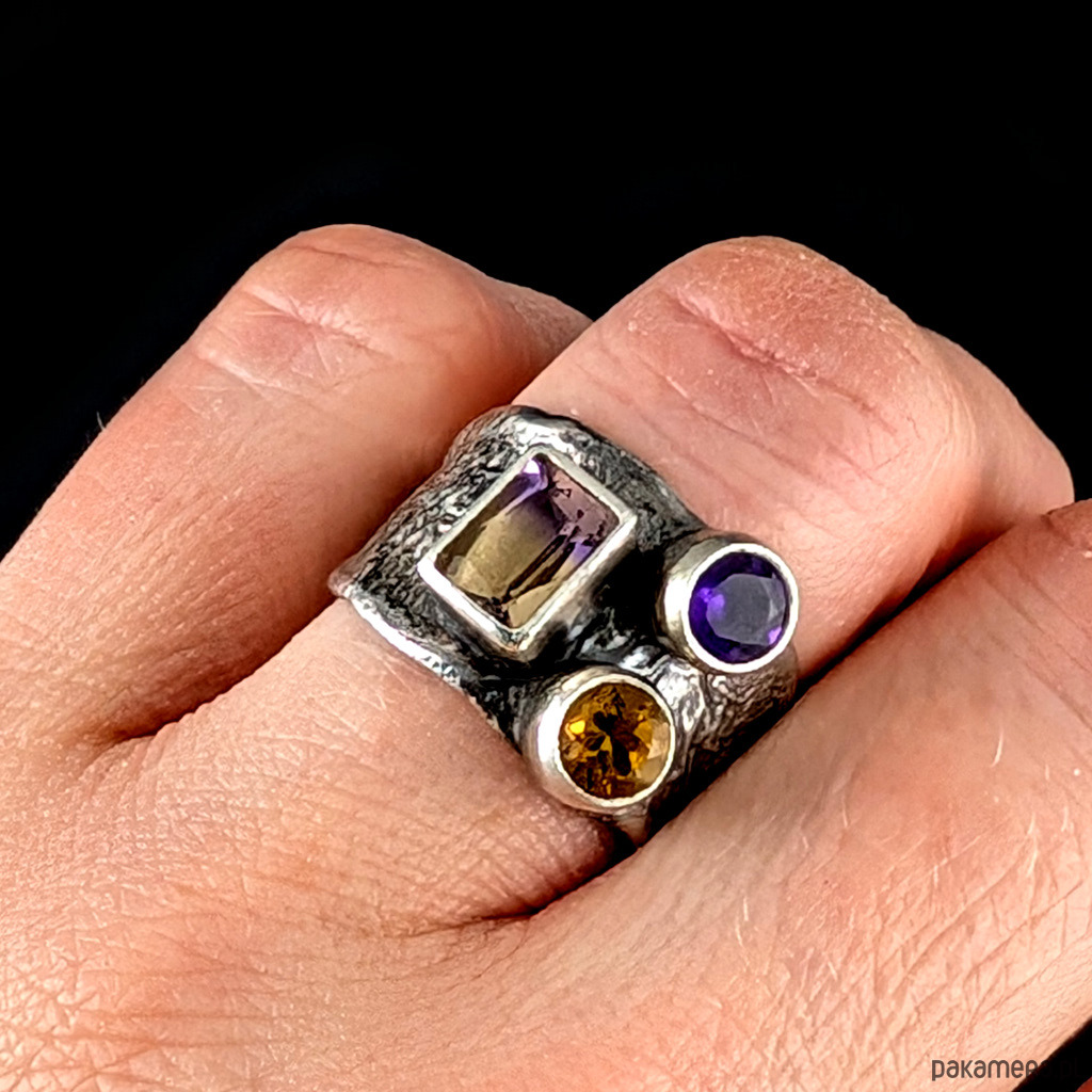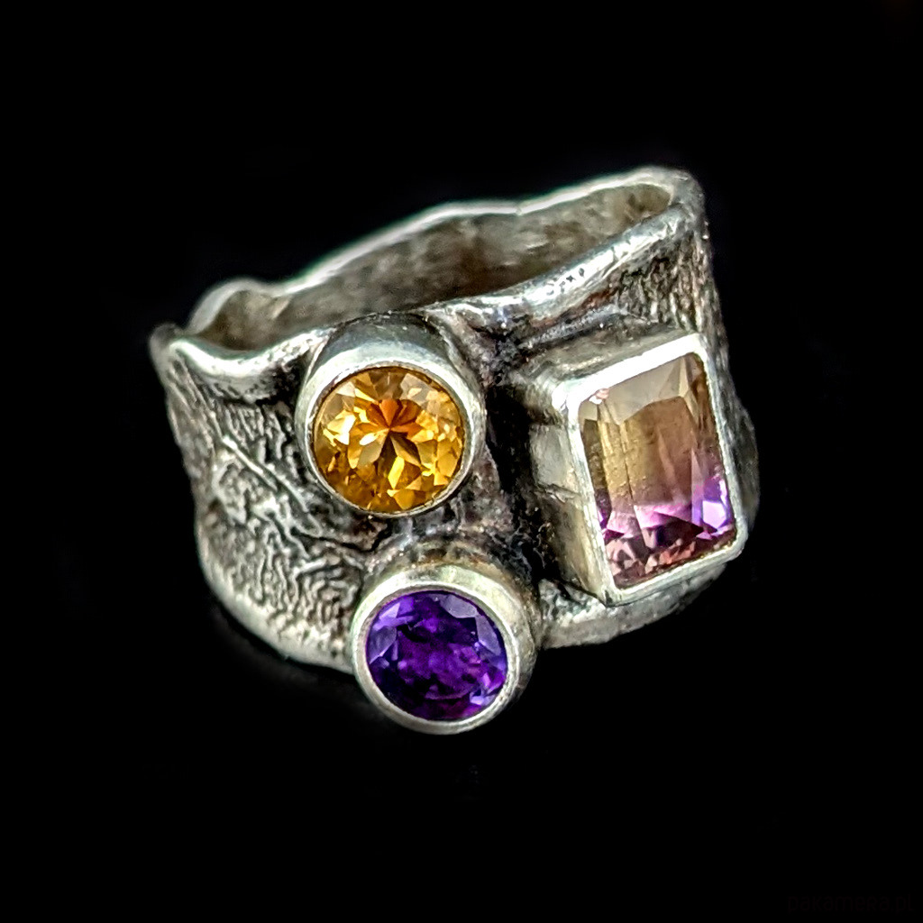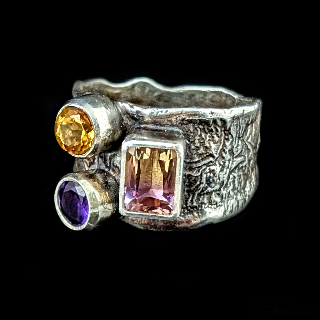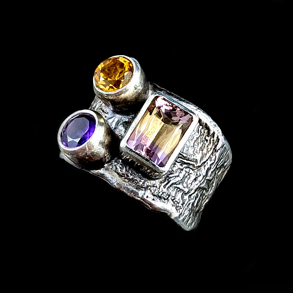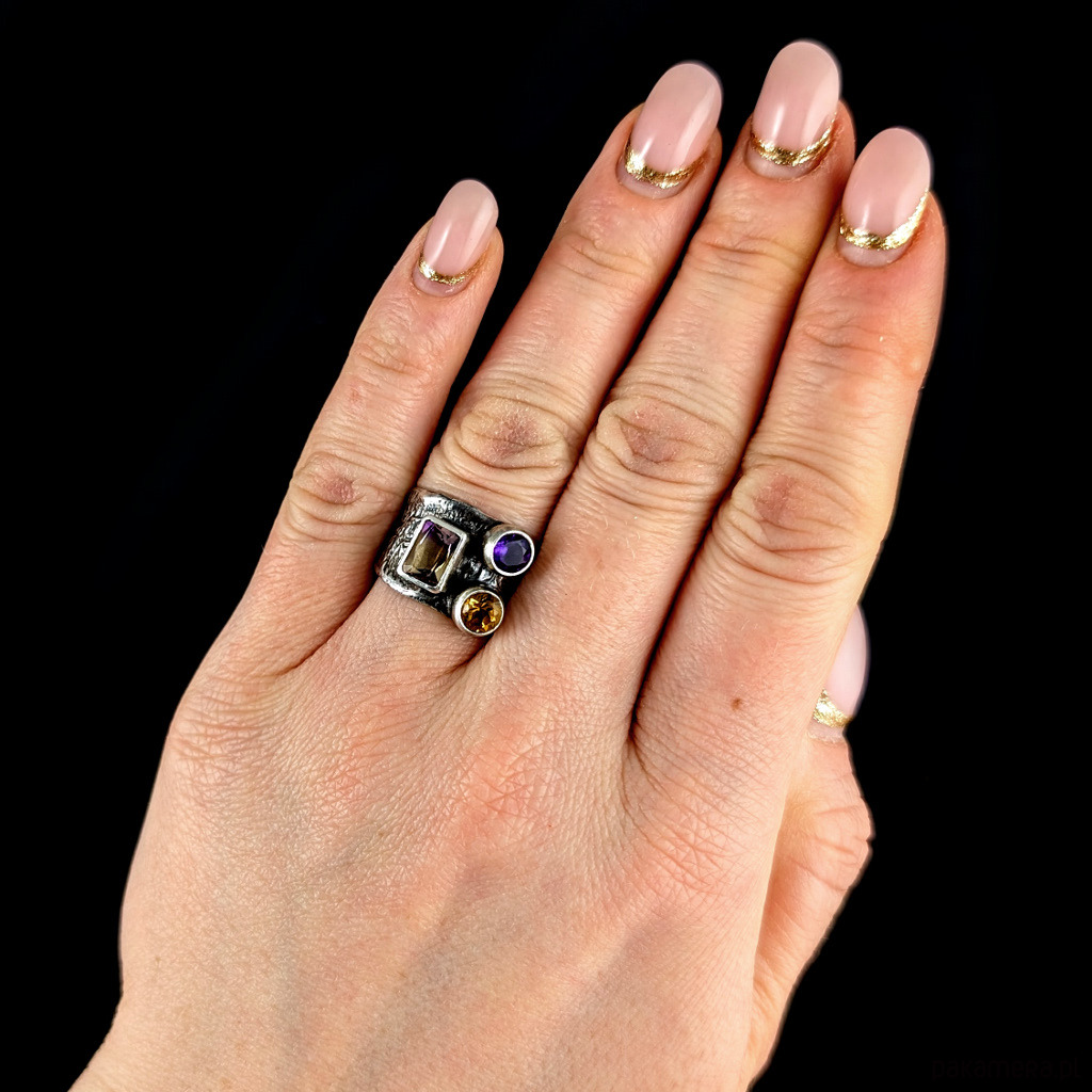 Pierścień wykonany z oksydowanego i przetartego srebra próby 925 oraz pięknego ametrynu najwyższej jakości. Ten minerał to odmiana kwarcu, będąca połączeniem ametystu i cytrynu, okaz bardzo przejrzysty, szlifowany, co wspaniale podkreśla stopniowane odcienie kamienia w barwach miodu i wrzosu. Wymiary oprawy 8 x 7 mm. Kompozycję dopełniają fasetowane cytryn oraz ametyst. Rozmiar jubilerski 17, bez możliwości zmiany, waga 7,8 g. Obrączka szeroka na max 14 mm. Pierścień zostanie wysłany w ozdobnym pudełeczku.