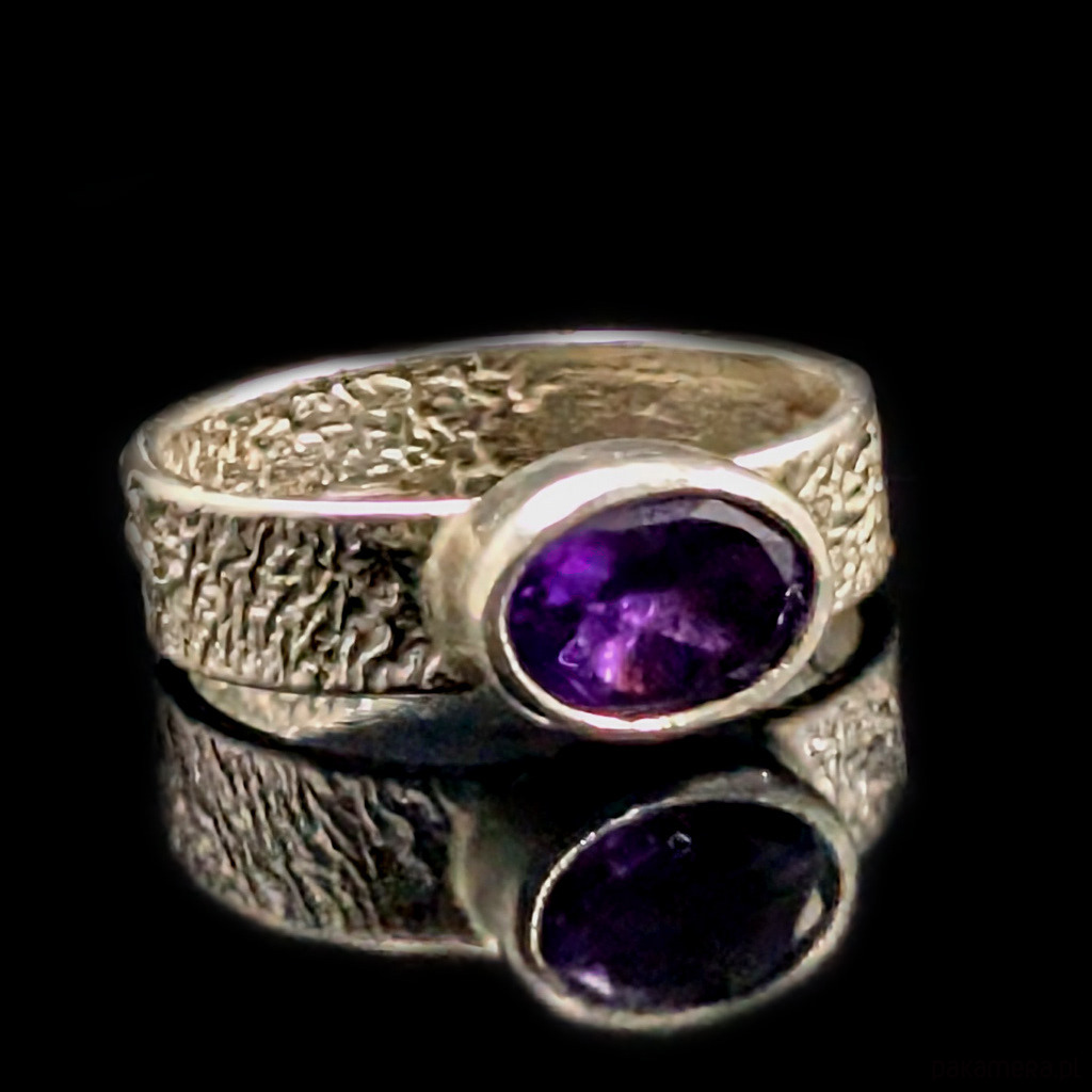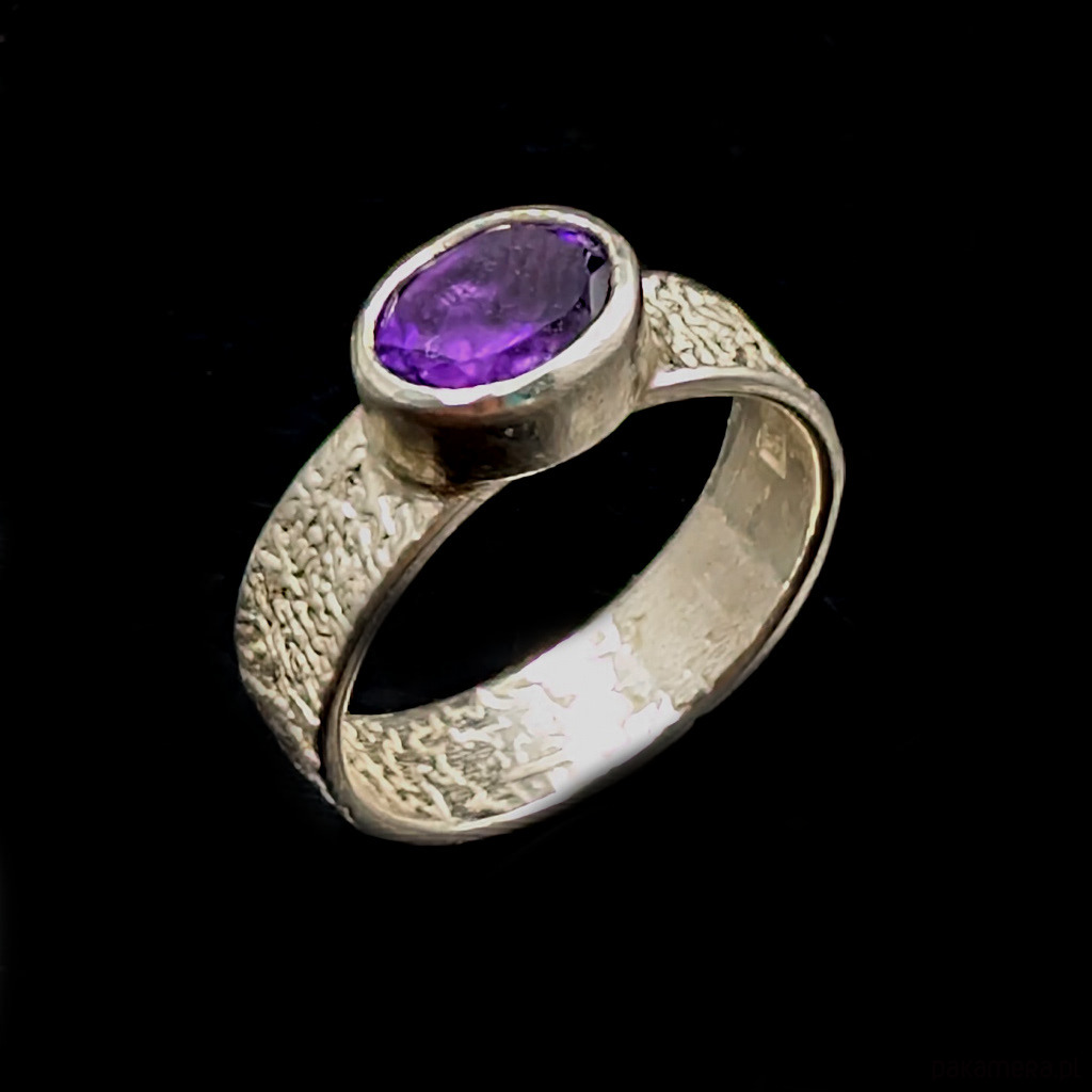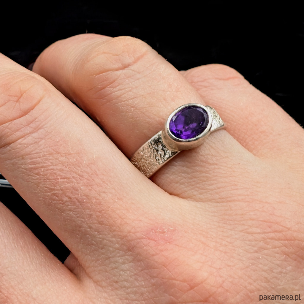 W srebrną, fakturowaną obrączkę oprawiony został piękny fasetowany ametyst o wymiarach 9 x 7 mm. Szerokość obrączki 5 mm. Rozmiar jubilerski dostępny 16 i 24, proszę npaisać jaki wysłać. Waga 4 g. Pierścionek zostanie zapakowany w ozdobne pudełeczko.