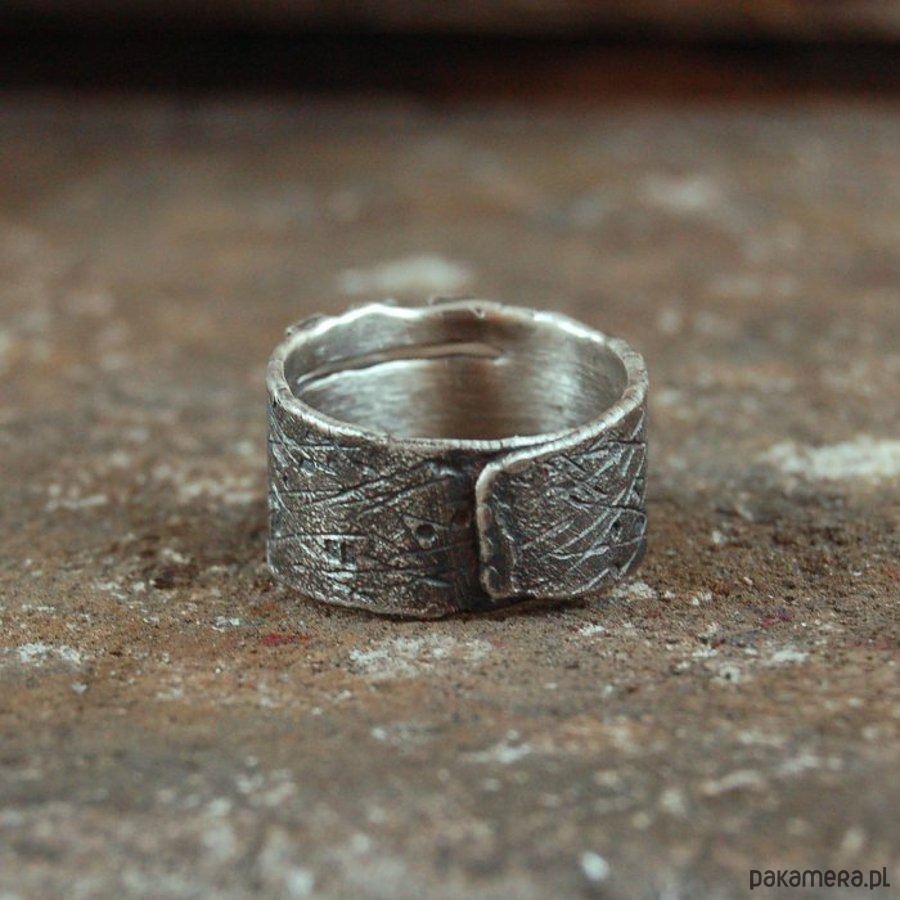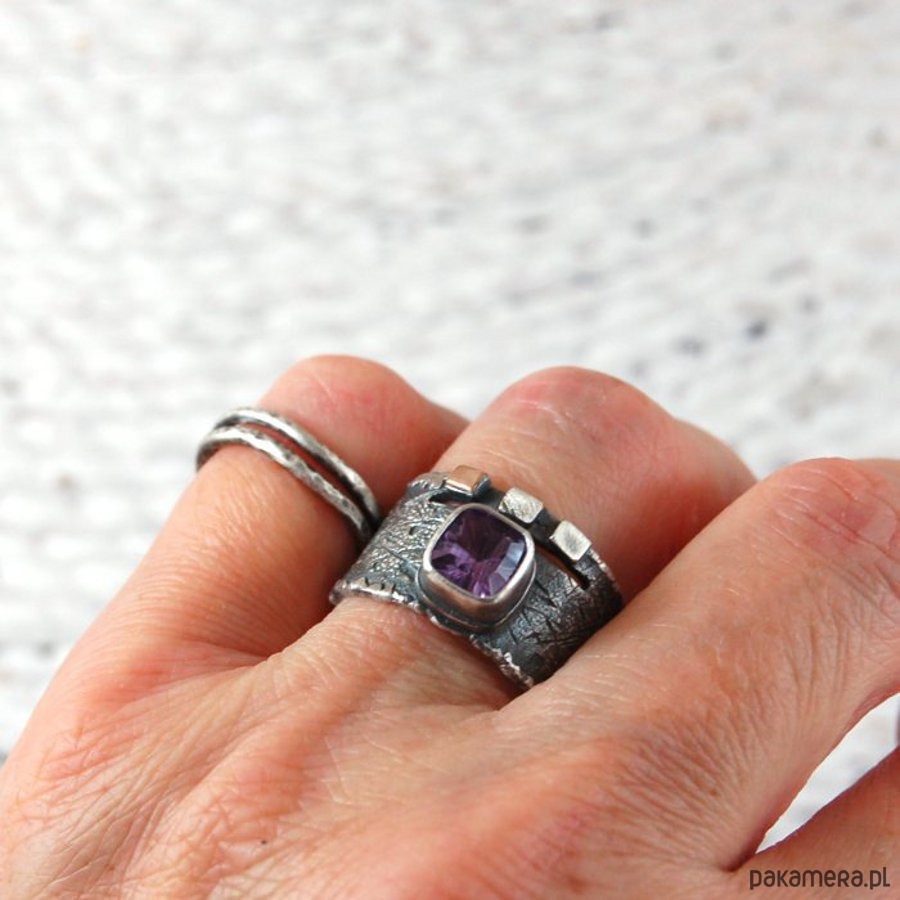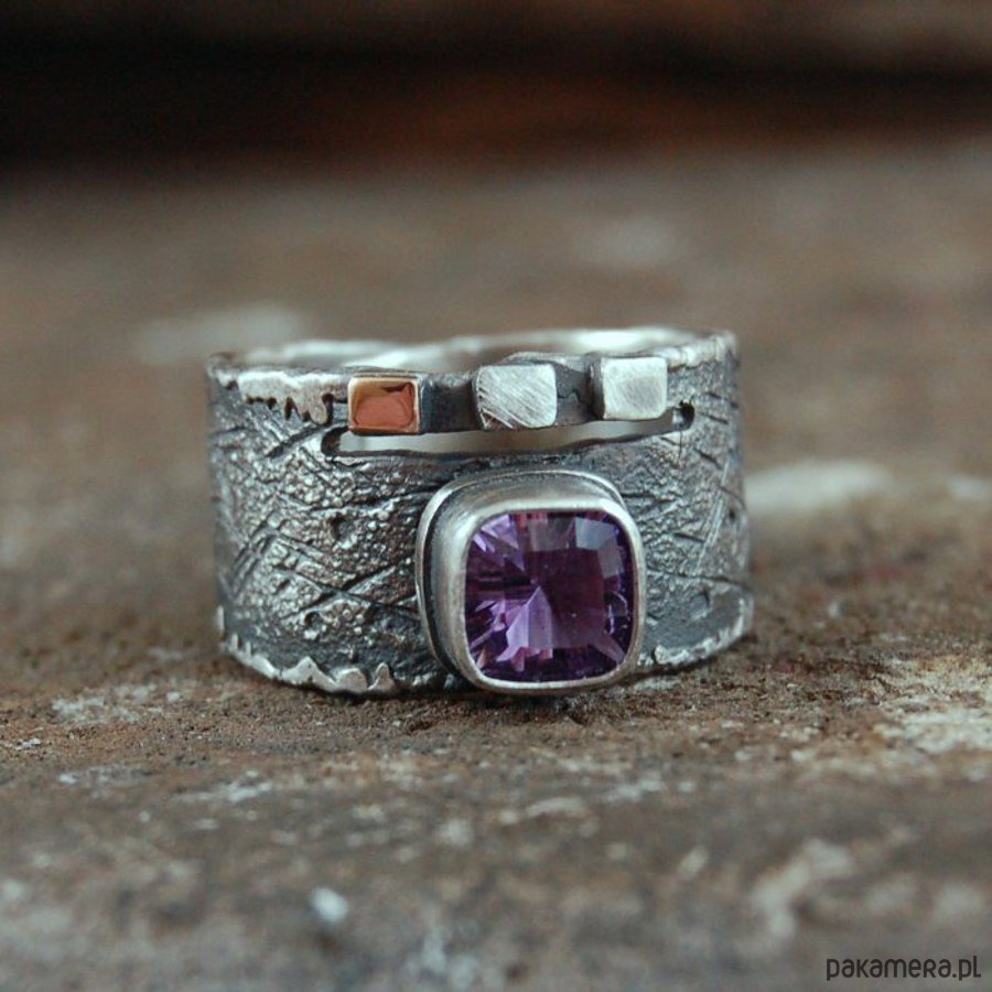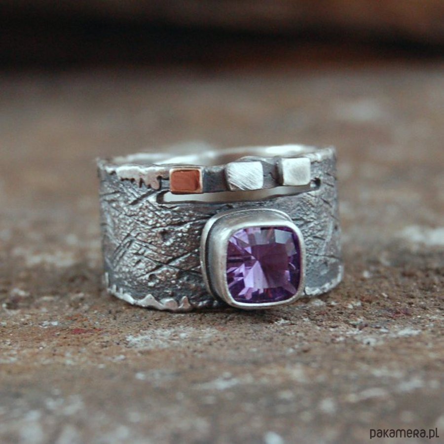 Pierścionek ze srebra, złota próby 585 i ametystu. Srebro oksydowane. Wielkość kamienia 0,6 x 0,6 cm, szerokość obrączki ok. 1,3 cm, rozmiar regulowany. Przy zamówieniu proszę o podanie rozmiaru, pierścionek zostanie ustawiony.