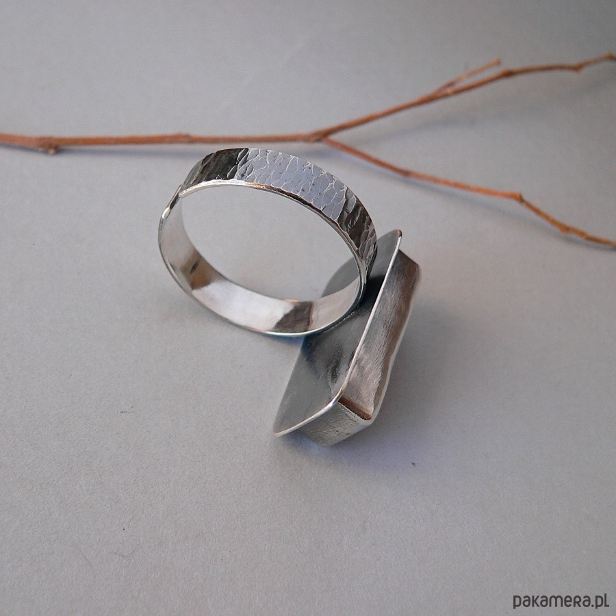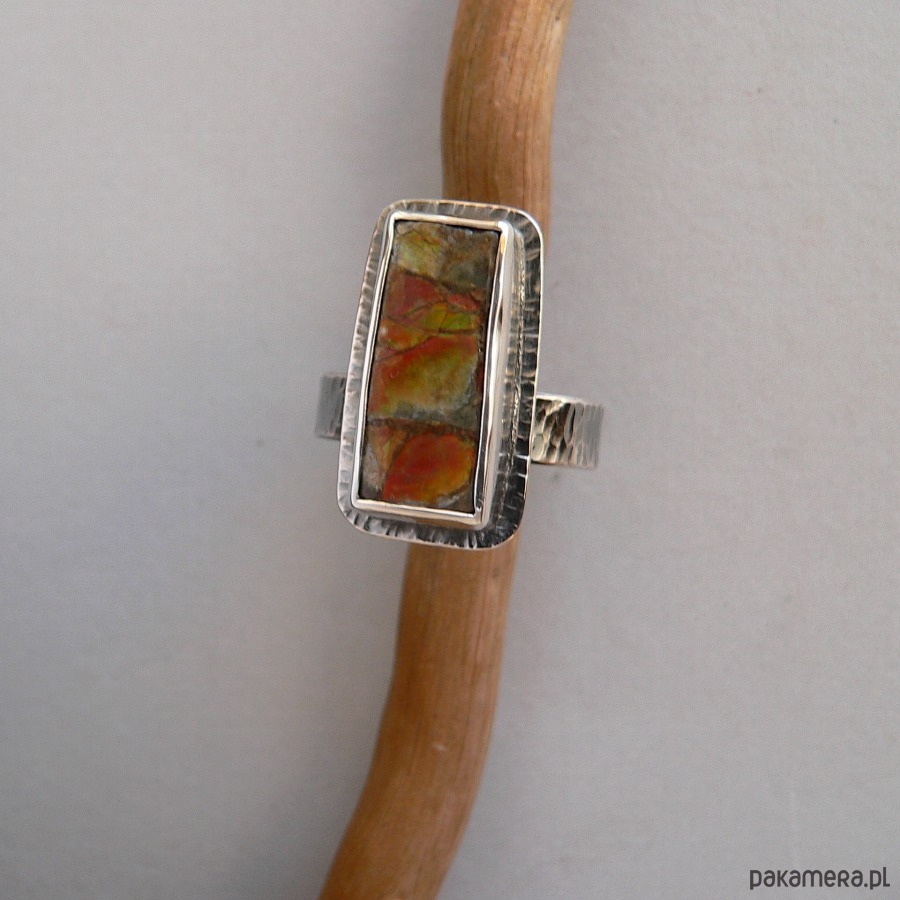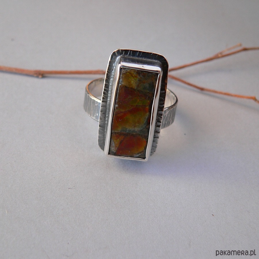 Pierścionek wykonany ze srebra i ammolitu ognistego. Wymiary nieregularnego kamienia 11/23 mm, Wymiary frontu- 2,7/1,5 cm Srebro oksydowane, detale polerowane. Minerał czerwono-zielony, ukryte barwy kamienia ujawniają się w zależności od kąta padania światła. Rozmiar regulowany, przy zakupie proszę o podanie noszonego rozmiaru, ustawię obrączkę.