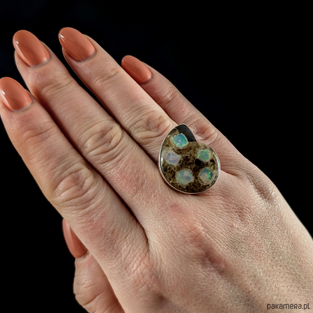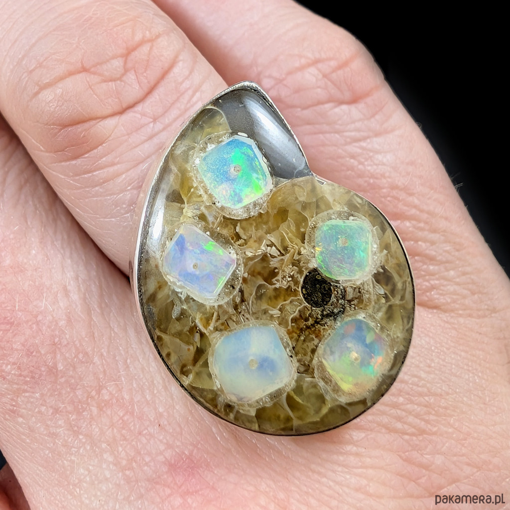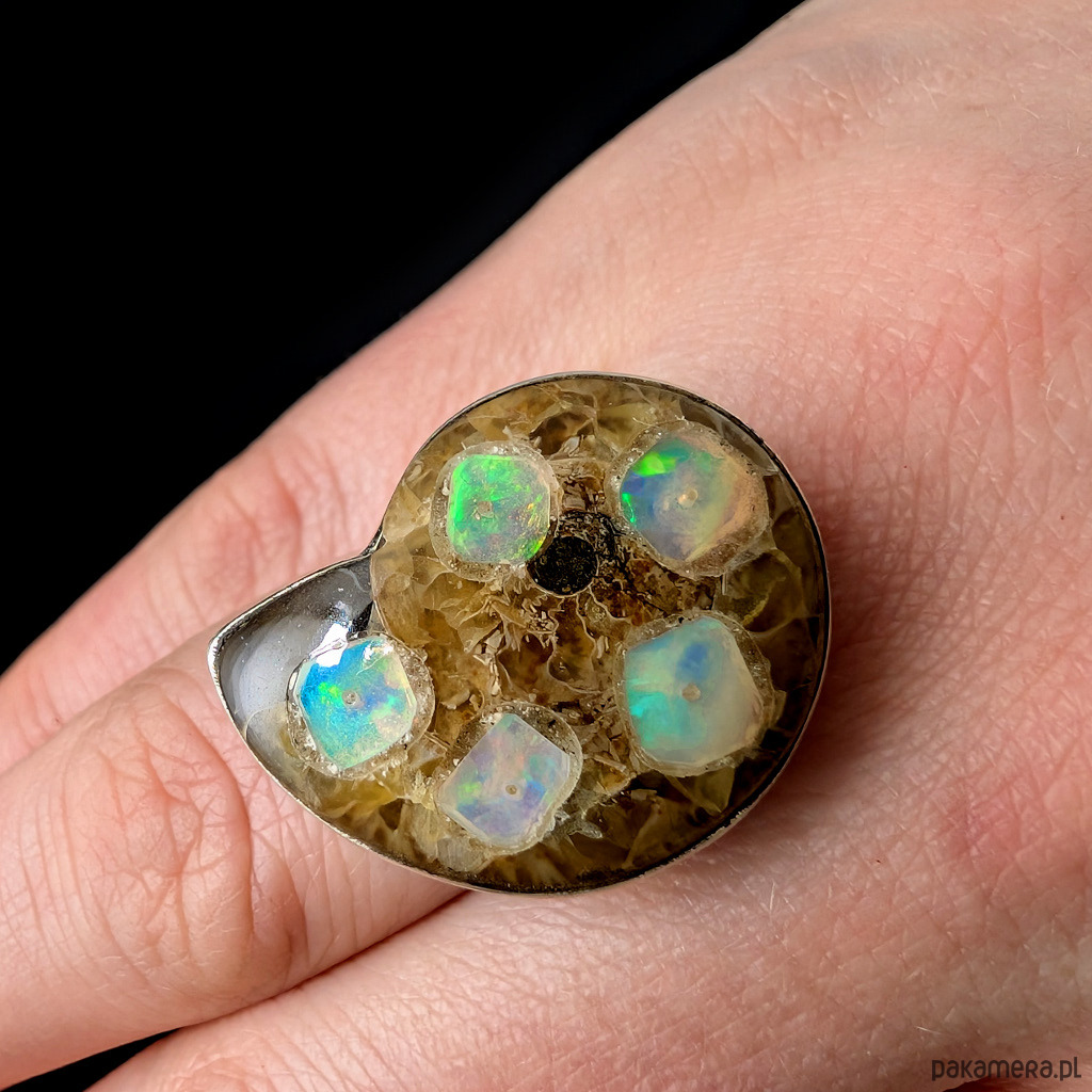 Zjawiskowy pierścień zapierający dech, wykonany ze srebra próby 925. Okazały amonit inkrustowany szlachetnym opalem etiopskim. Wymiary oprawy 26 x 21 mm, rozmiar jubilerski 14. Waga 9,8 g. Polecam, jest niezwykły. Wykonany przez dostawcę kamieni. Zapakowany w ozdobne pudełeczko.