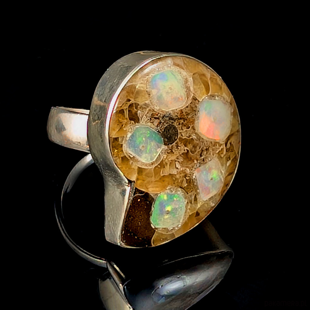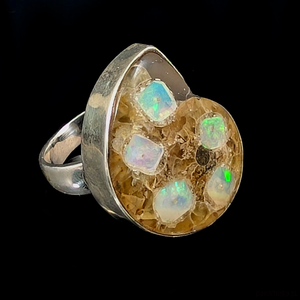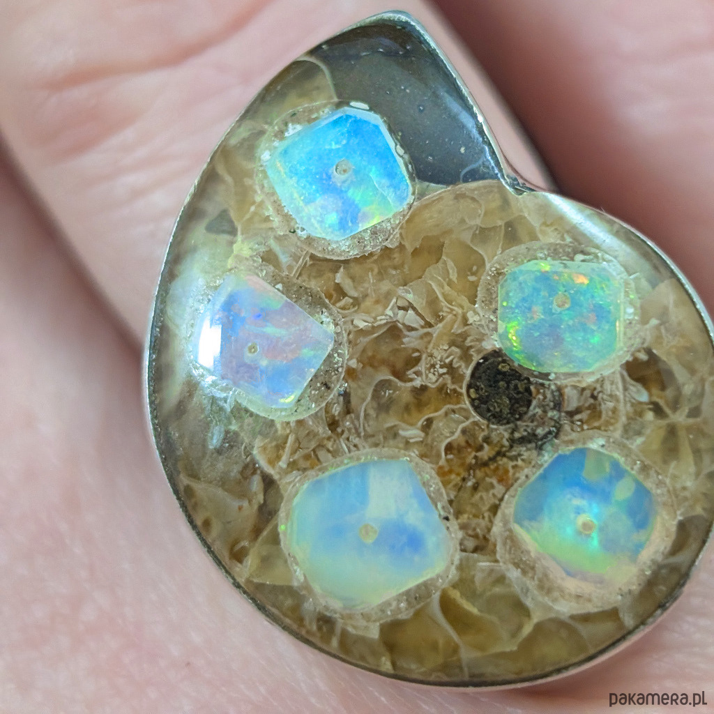 Zjawiskowy pierścień zapierający dech, wykonany ze srebra próby 925. Okazały amonit inkrustowany szlachetnym opalem etiopskim. Wymiary oprawy 26 x 21 mm, rozmiar jubilerski 14. Waga 9,8 g. Polecam, jest niezwykły. Wykonany przez dostawcę kamieni. Zapakowany w ozdobne pudełeczko.