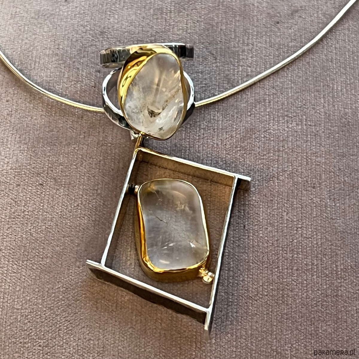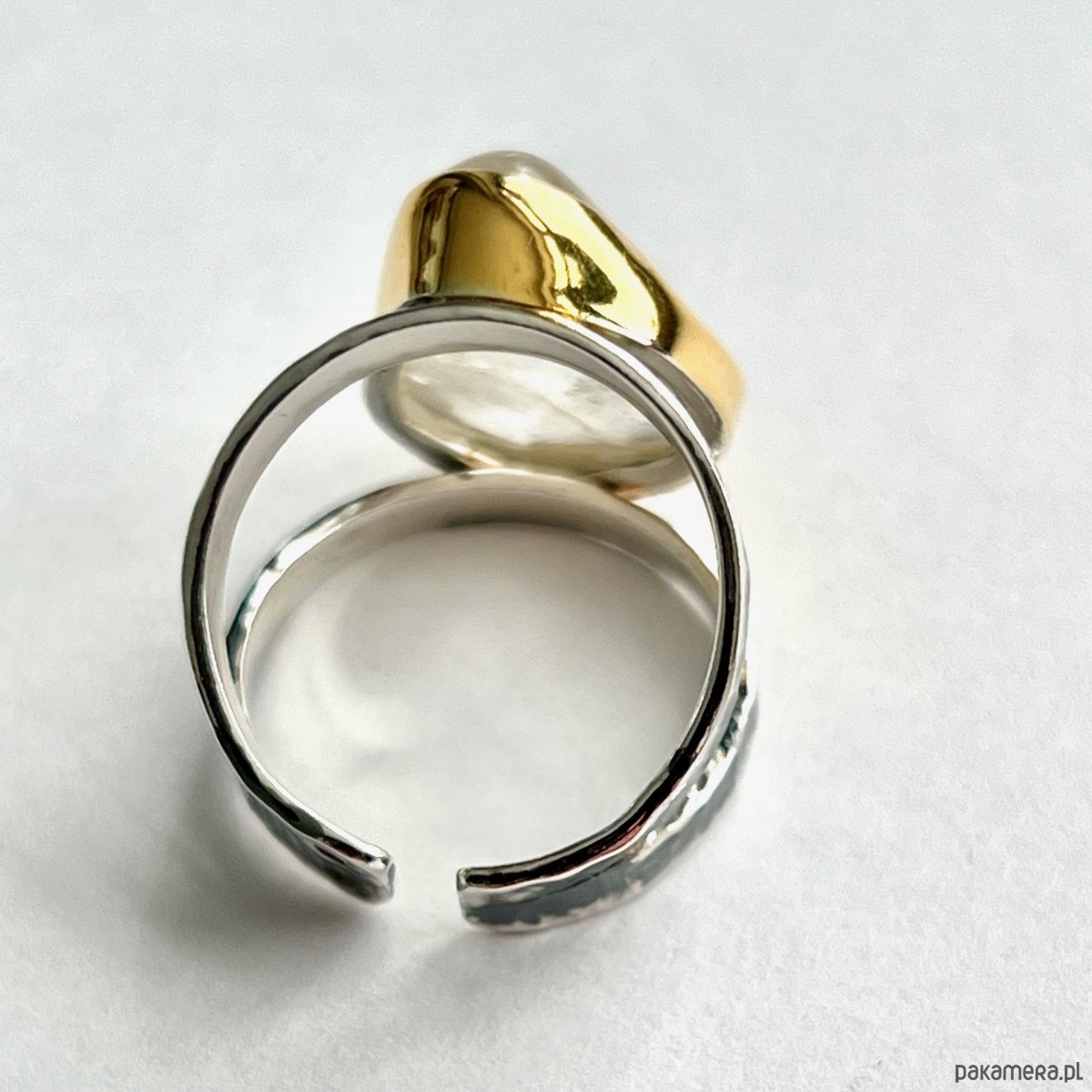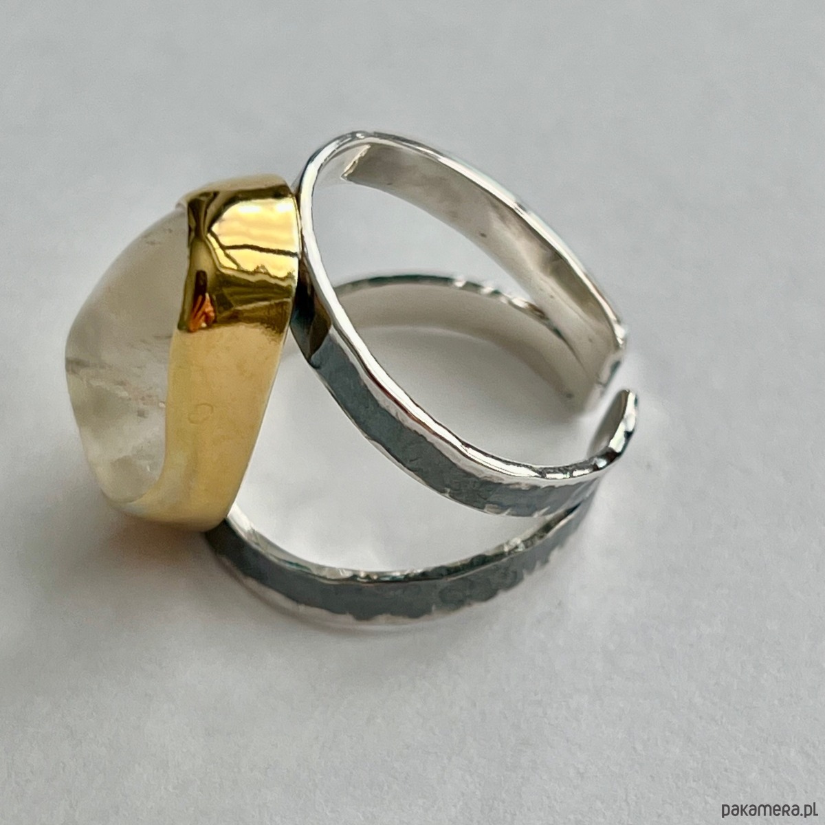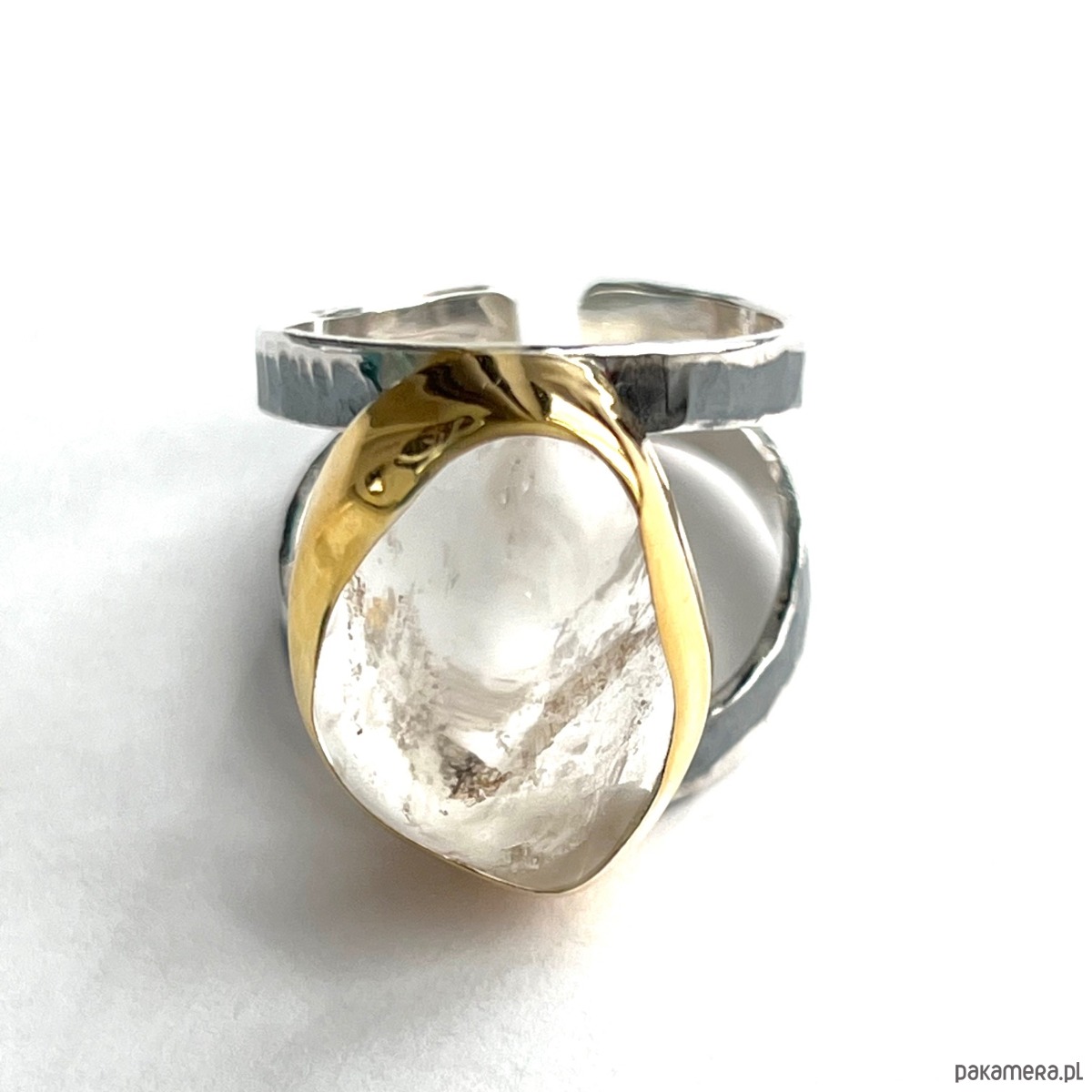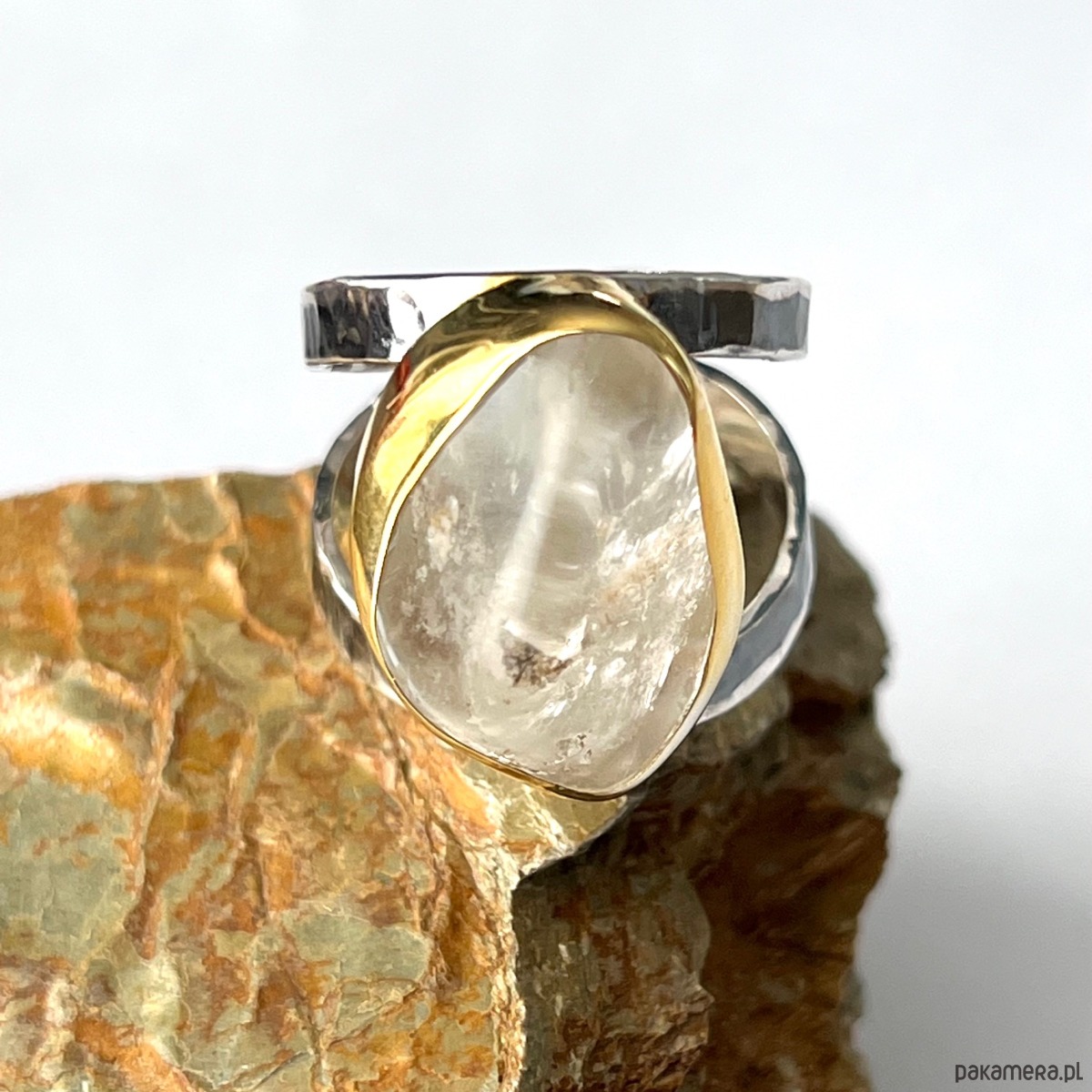 Unikatowy pierścionek srebrny z kryształem górskim w srebrze i złocie.