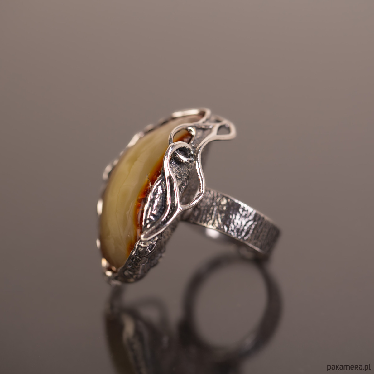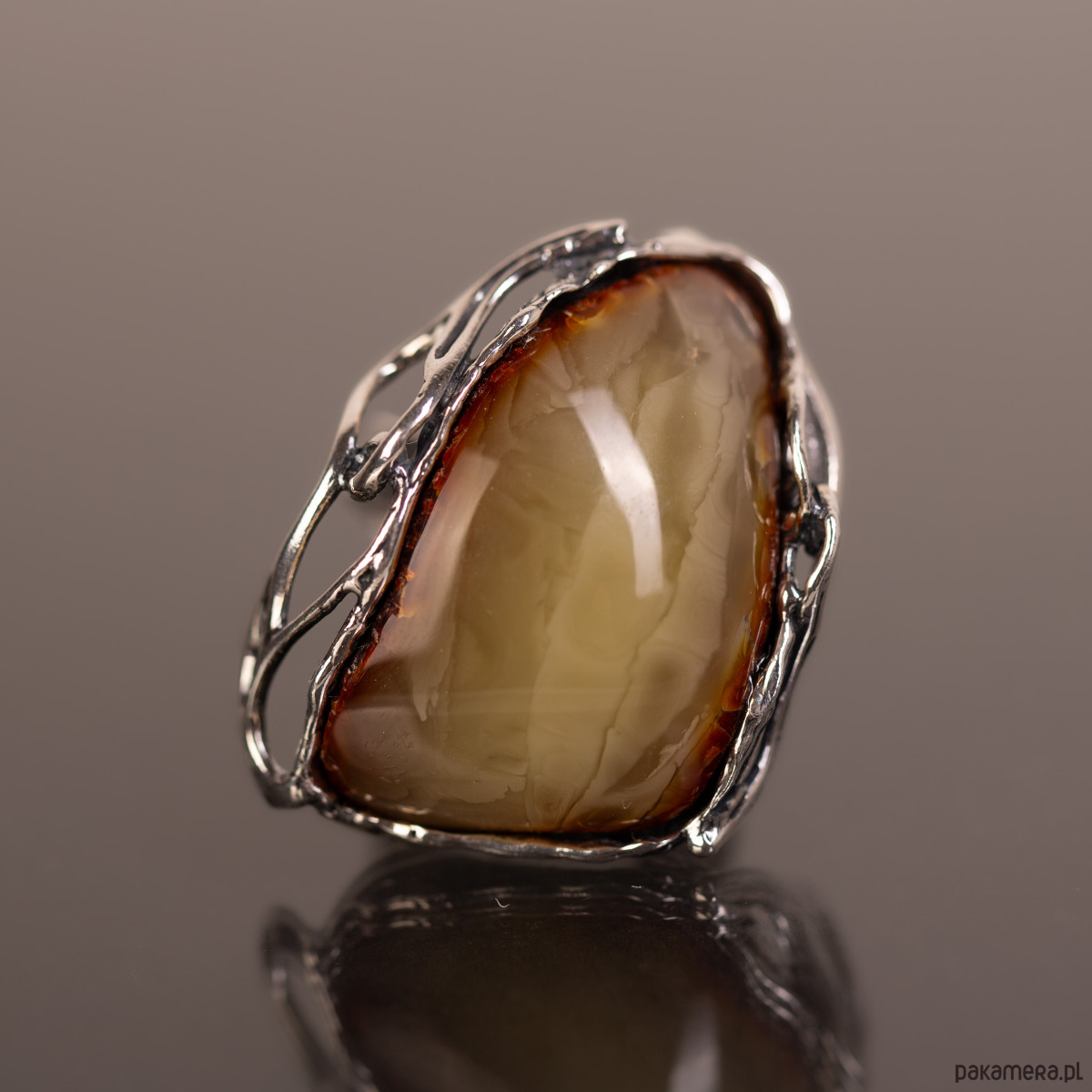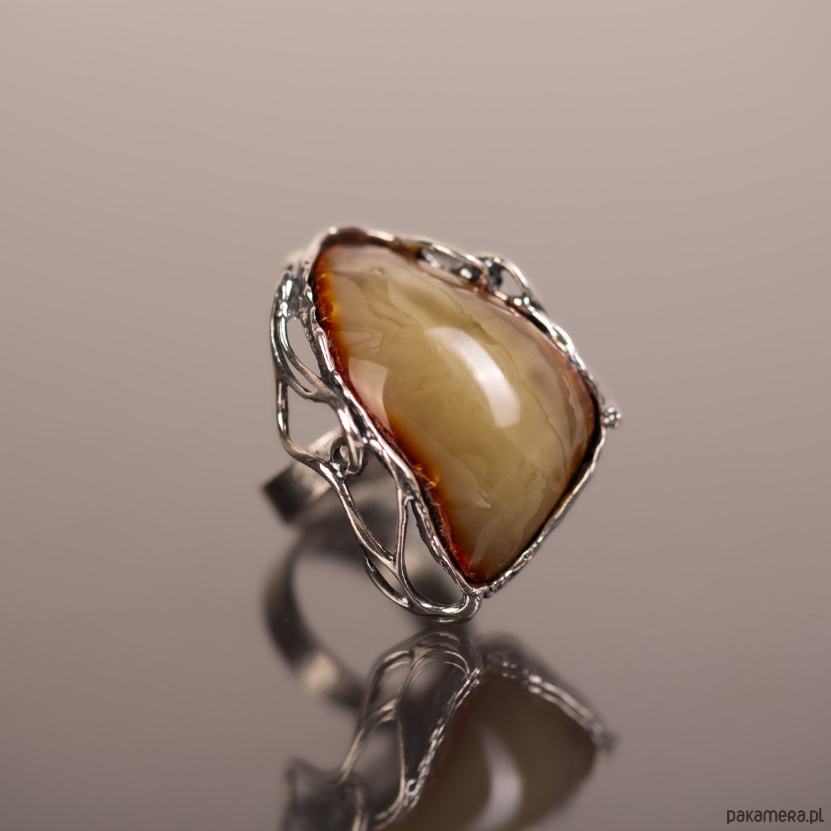 Pierścionek z naturalnym bursztynem bałtyckim o rzadkim, mleczno-miodowym odcieniu, oprawionym w ażurowe srebro. Unikatowa, lekka wizualnie konstrukcja oprawy kontrastuje z solidną bryłą kamienia, tworząc biżuterię o artystycznym i nowoczesnym charakterze. Regulowana obrączka zapewnia pełną swobodę dopasowania i codzienny komfort.