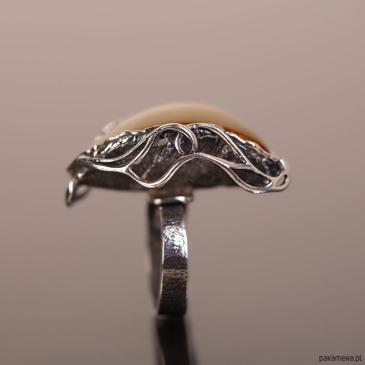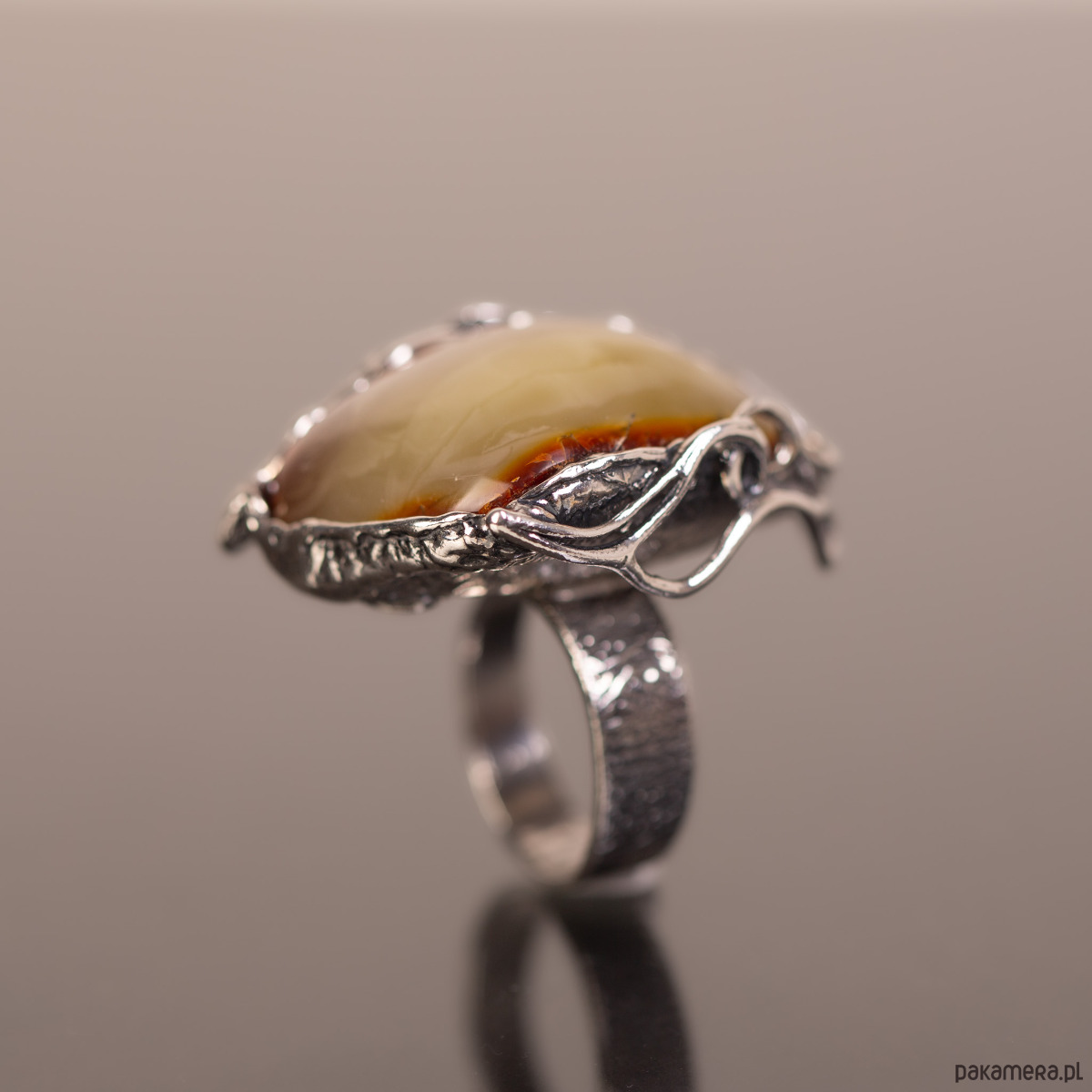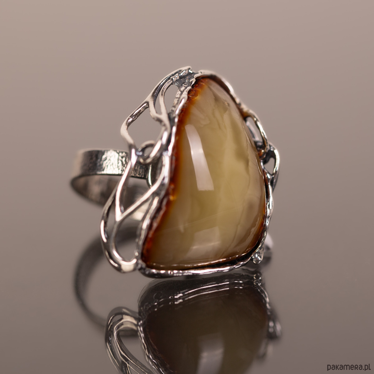 Pierścionek z naturalnym bursztynem bałtyckim o rzadkim, mleczno-miodowym odcieniu, oprawionym w ażurowe srebro. Unikatowa, lekka wizualnie konstrukcja oprawy kontrastuje z solidną bryłą kamienia, tworząc biżuterię o artystycznym i nowoczesnym charakterze. Regulowana obrączka zapewnia pełną swobodę dopasowania i codzienny komfort.