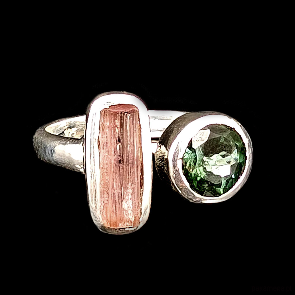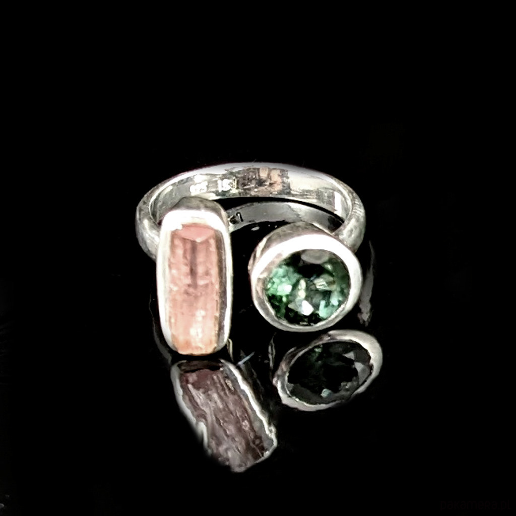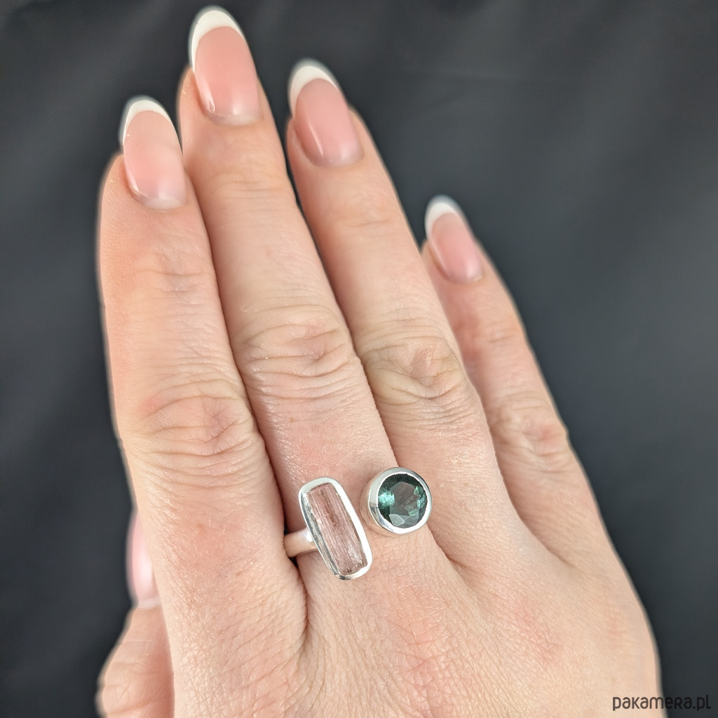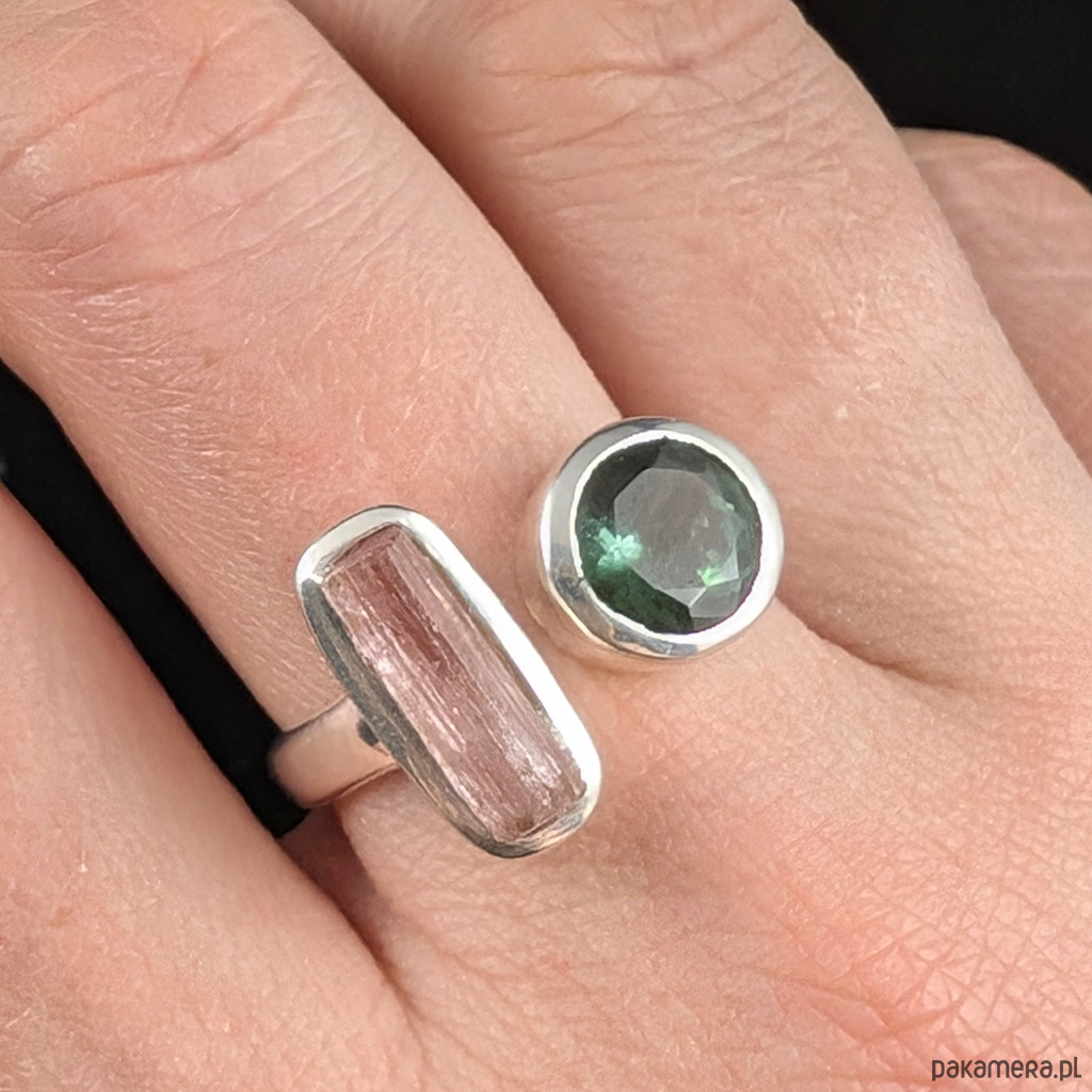 Przepiękne turmaliny o barwie truskawkowej i morskiej. Wymiary kamieni w oprawie srebra pr 925 15 x 6 mm i średnicy 10 mm. Rozmiar jubilerski mogę dopasować w zakresie 18-21 Waga 7g. Pierścionek zapakowany w ozdobne pudeleczko. Wykonany przez dostawcę kamieni.