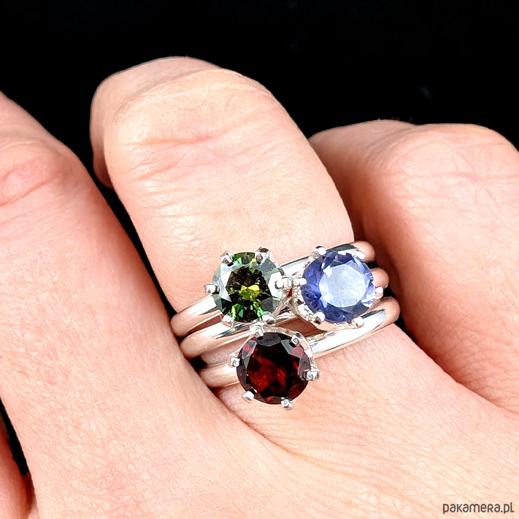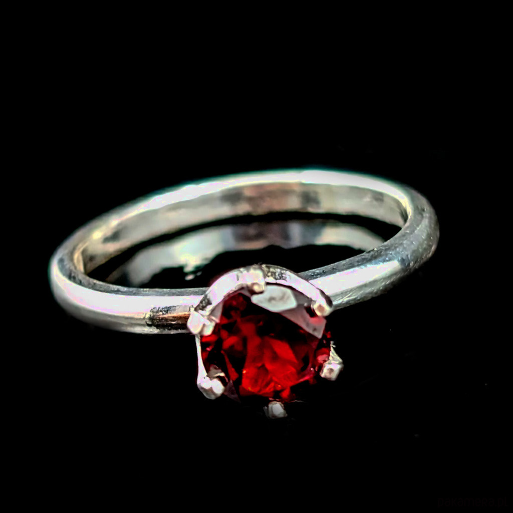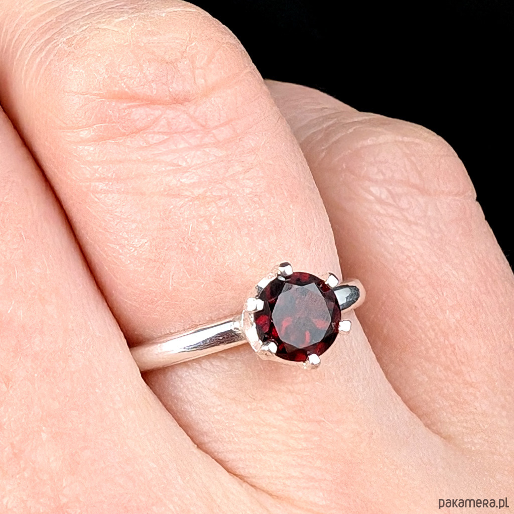 Granat w oprawie srebra próby 925. Oprawa srebra polerowana na błysk. Średnica elementu 7 mm. Waga 2,22 g.Rozmiar jubilerski 13. Można zamówić inny rozmiar.