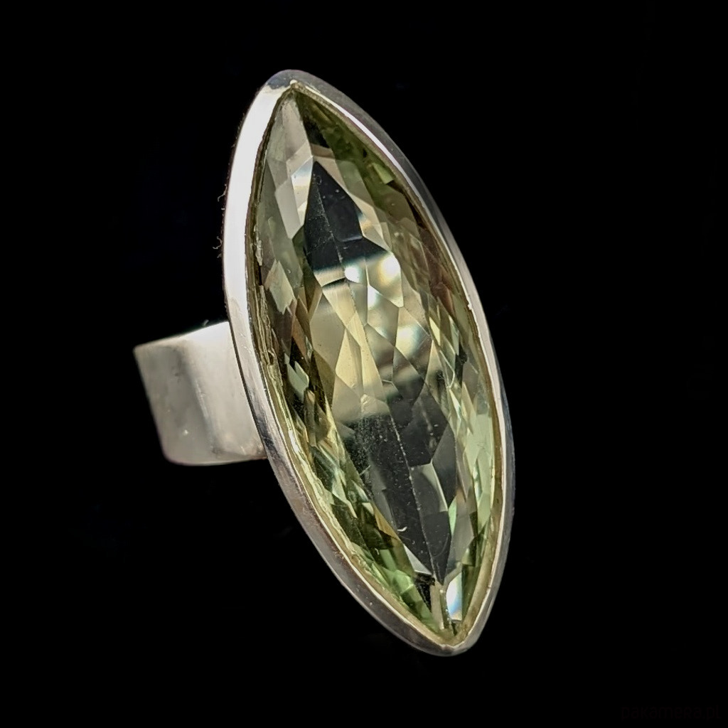 Bardzo okazały pierścień wykonany ze srebra próby 925 oraz zielonego kryształu ametystu o precyzyjnym, pieknym szlifie. Przepiękny okaz. Wymiary oprawy kamienia 36 x 15 mm. Rozmiar jubilerski 19,mogę powiększyć na max 21. Waga 19 g. Wykonany przez dostawcę kamieni. Pierścień zostanie wysłany w ozdobnym pudełeczku. Polecam z piękną zawieszką do kompletu.