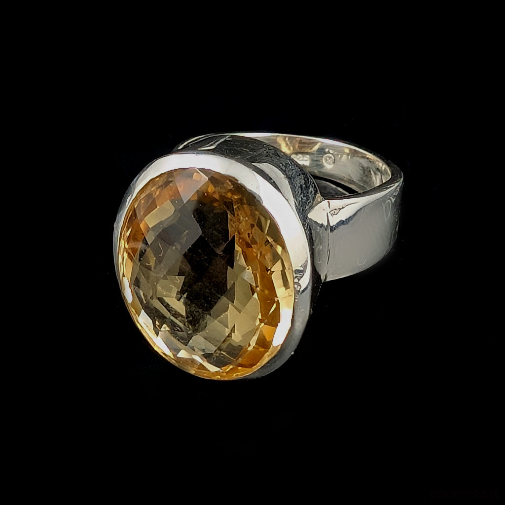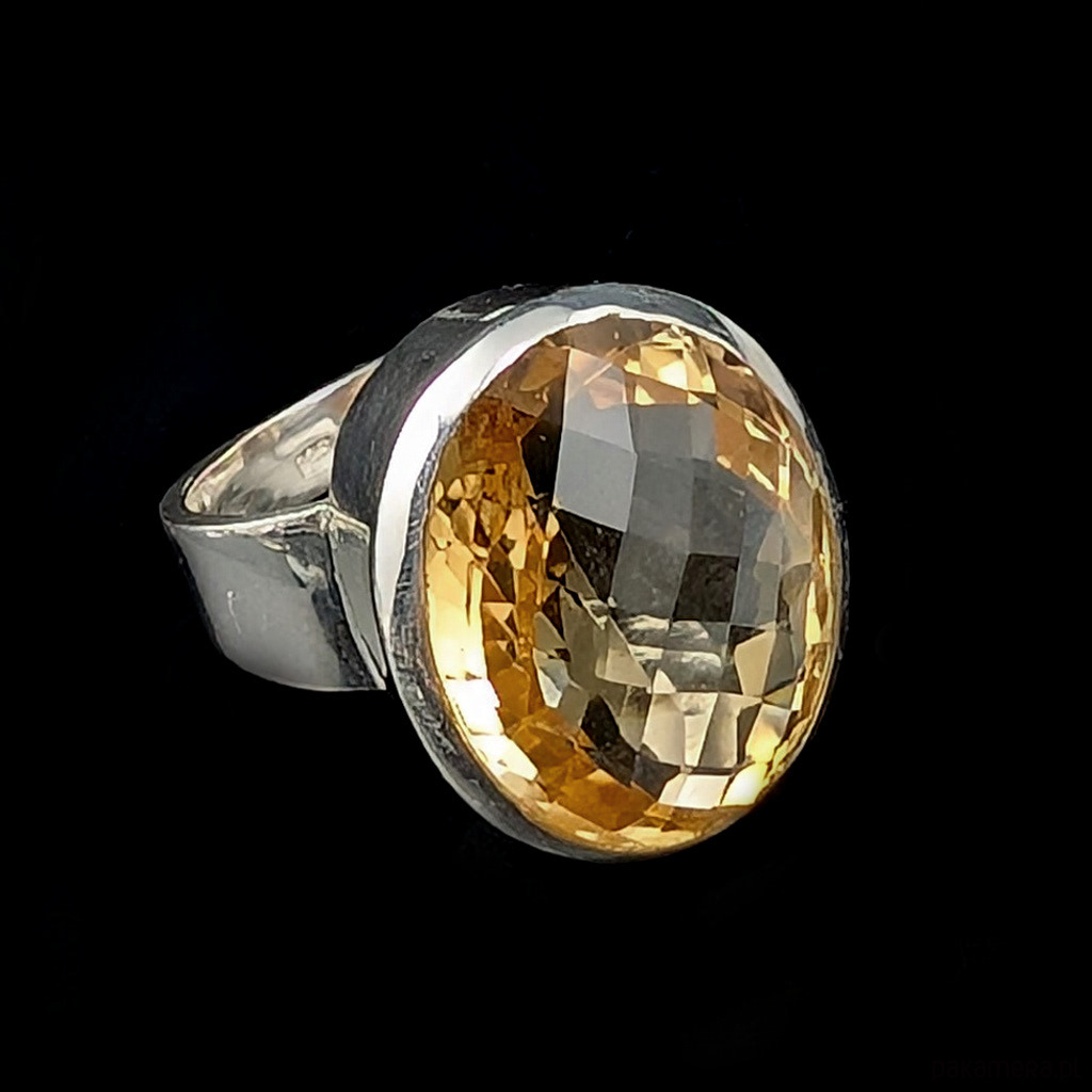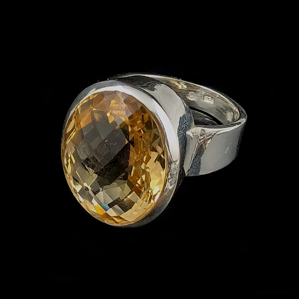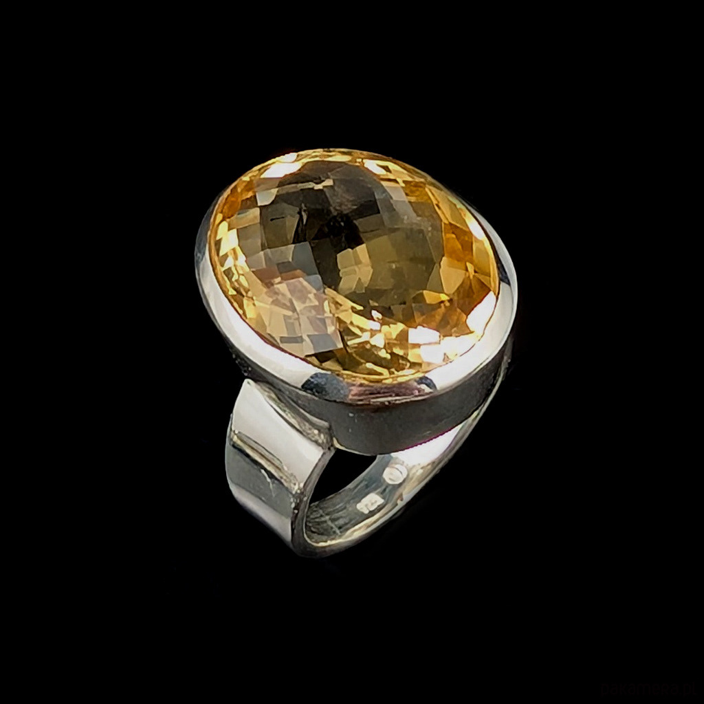 Kobiecy pierścień wykonany ze srebra pr.9 25 oraz pięknego cytrynu z precyzyjnym szlifem. Wymiary oprawy kamienia 23 x 17 mm. Rozmiar jubilerski 21 bez możliwości zmiany rozmiaru. Waga 16,3 grama. Wykonany przez dostawcę kamieni. Pierścionek zapakowany w ozdobne pudełeczko.