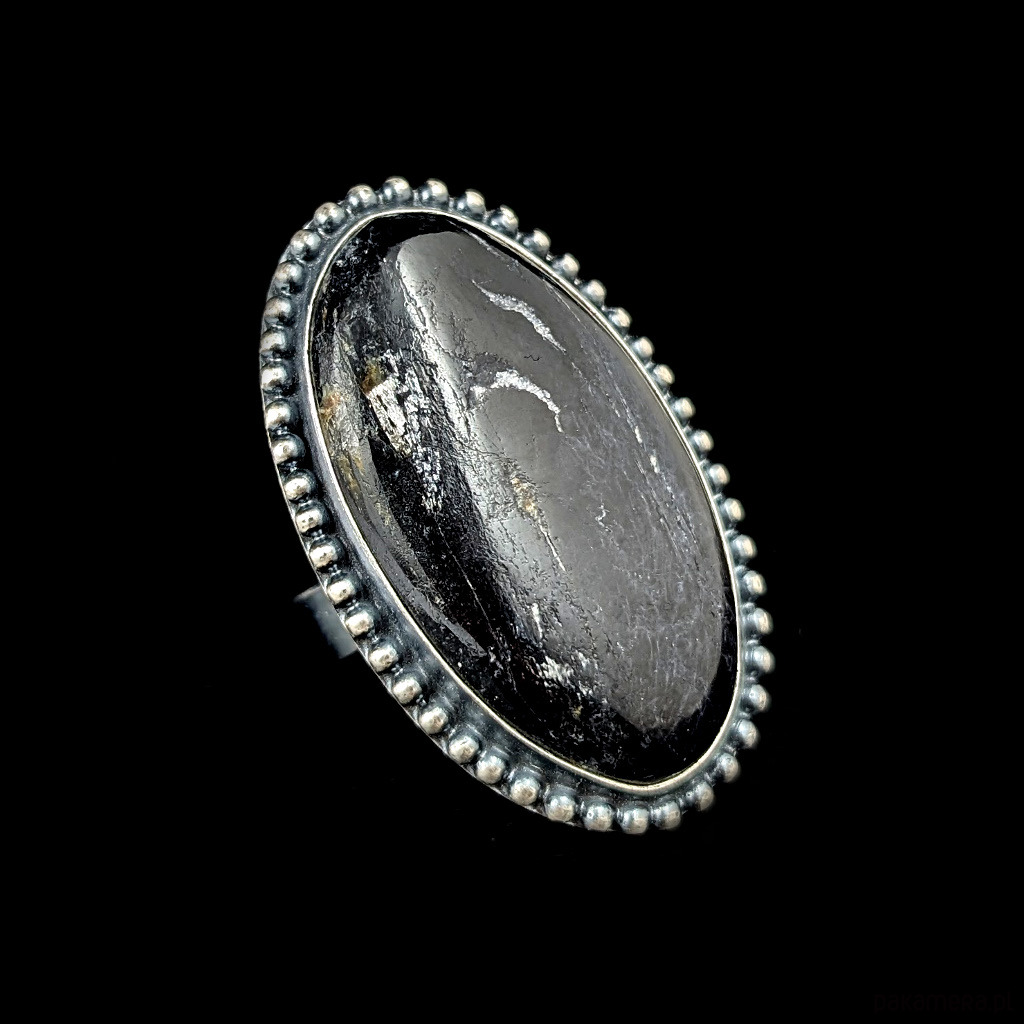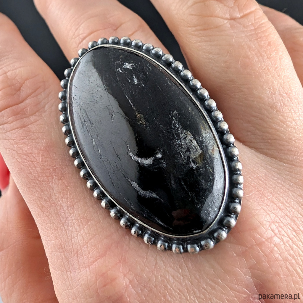 Pierścień z oprawionym w oksydowane srebro o pr. 925 czarnym turmalinem. Wymiary oprawy kamienia 45 x 28 mm. Szerokość obrączki 5 mm. Rozmiar jubilerski 20, mogę powiększyć na max 24. Pierścień waży 25 gramów, zostanie wysłany w ozdobnym pudełeczku.