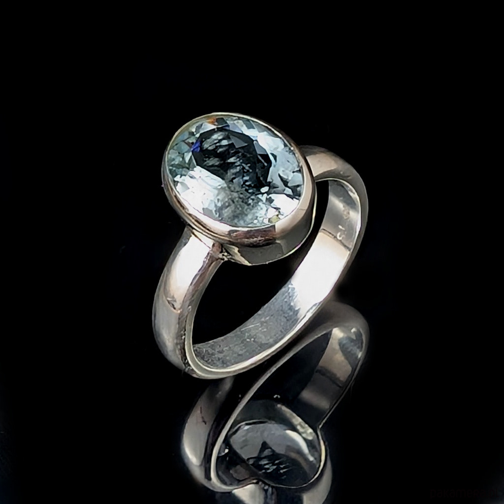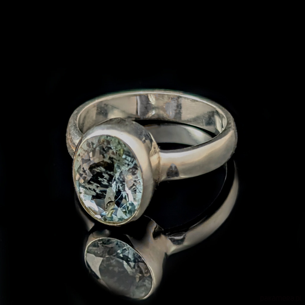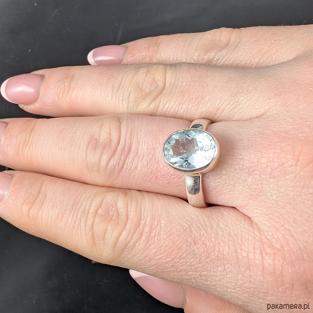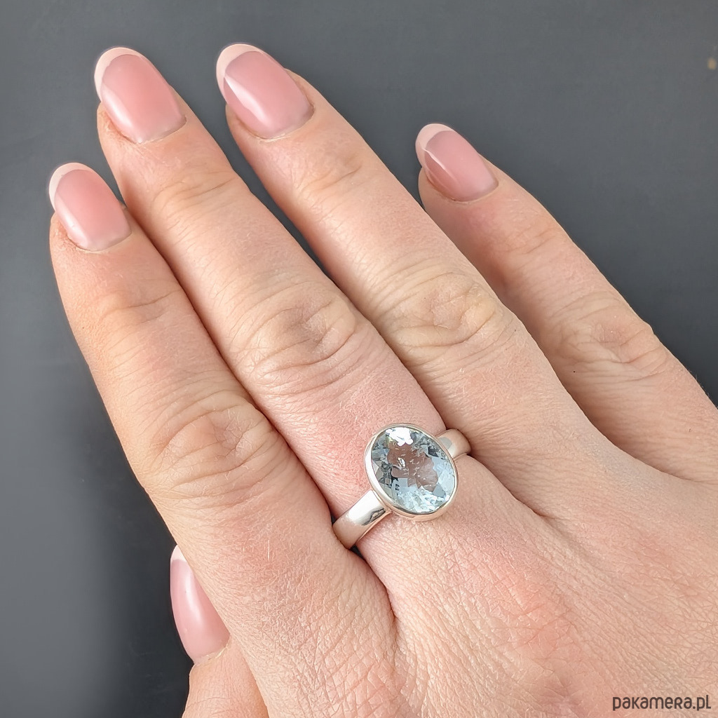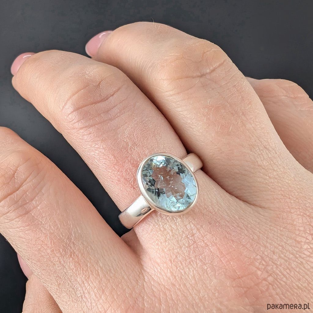 Pierścień z oprawionym w srebro próby 925 pięknym, dostojnym akwamarynem. Szerokość obrączki 4 mm. Okazały, niezwykle przejrzysty kamień o precyzyjnym szlifie ma oprawę 12 x 10 mm. Rozmiar jubilerski 19. Polecam, jest przepiękny. Oprawa z tyłu otwarta co potęguje przejrzystość kamienia. Waga 5 gramów. Wykonany przez dostawcę kamieni. Pierścień zapakowany zostanie w ozdobne pudełeczko.
