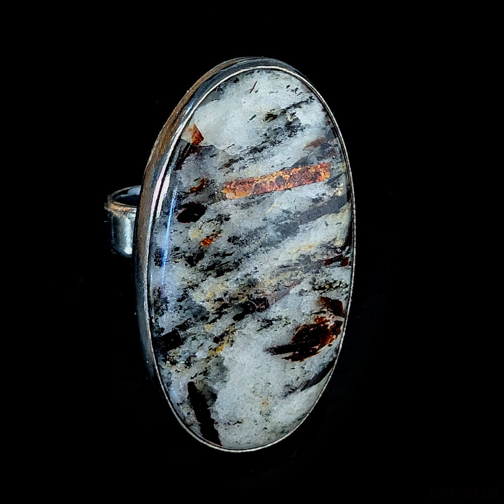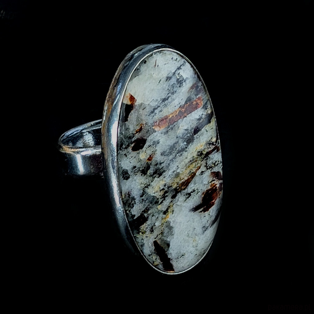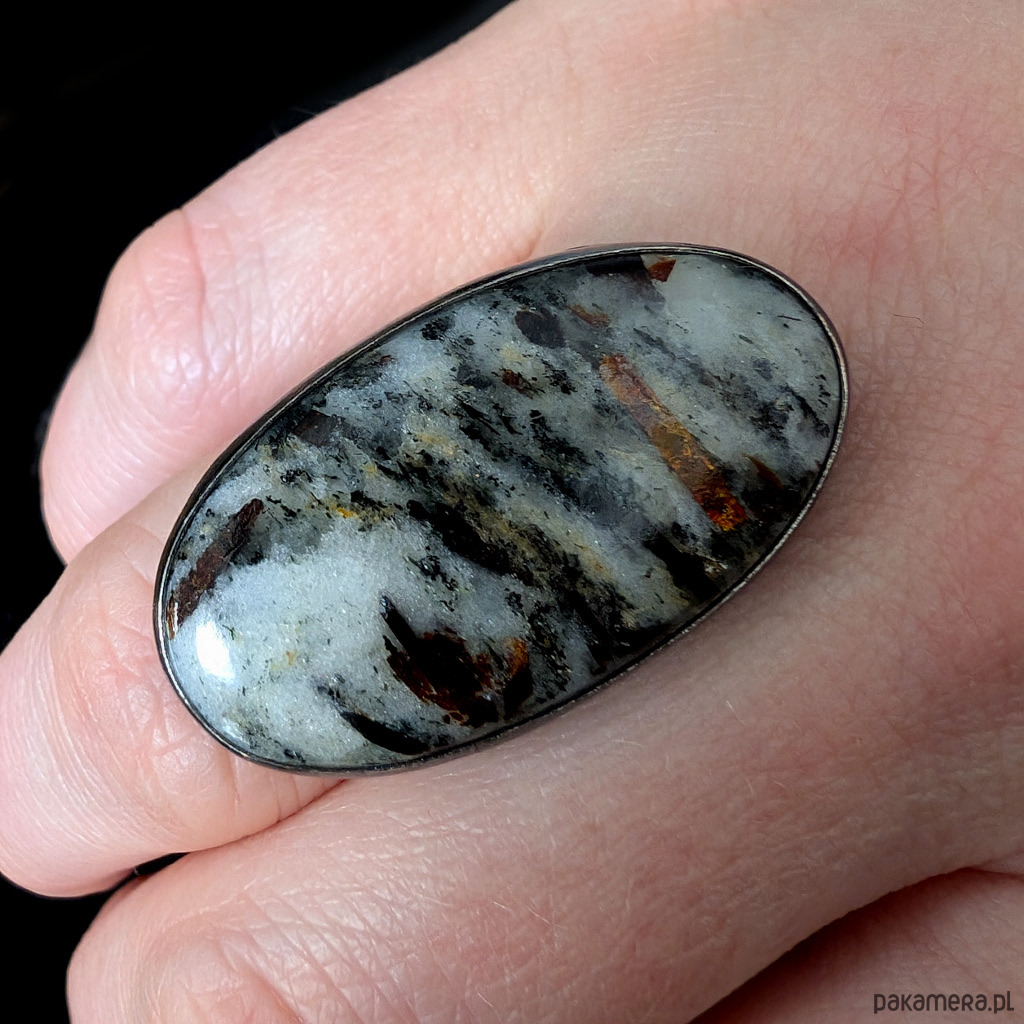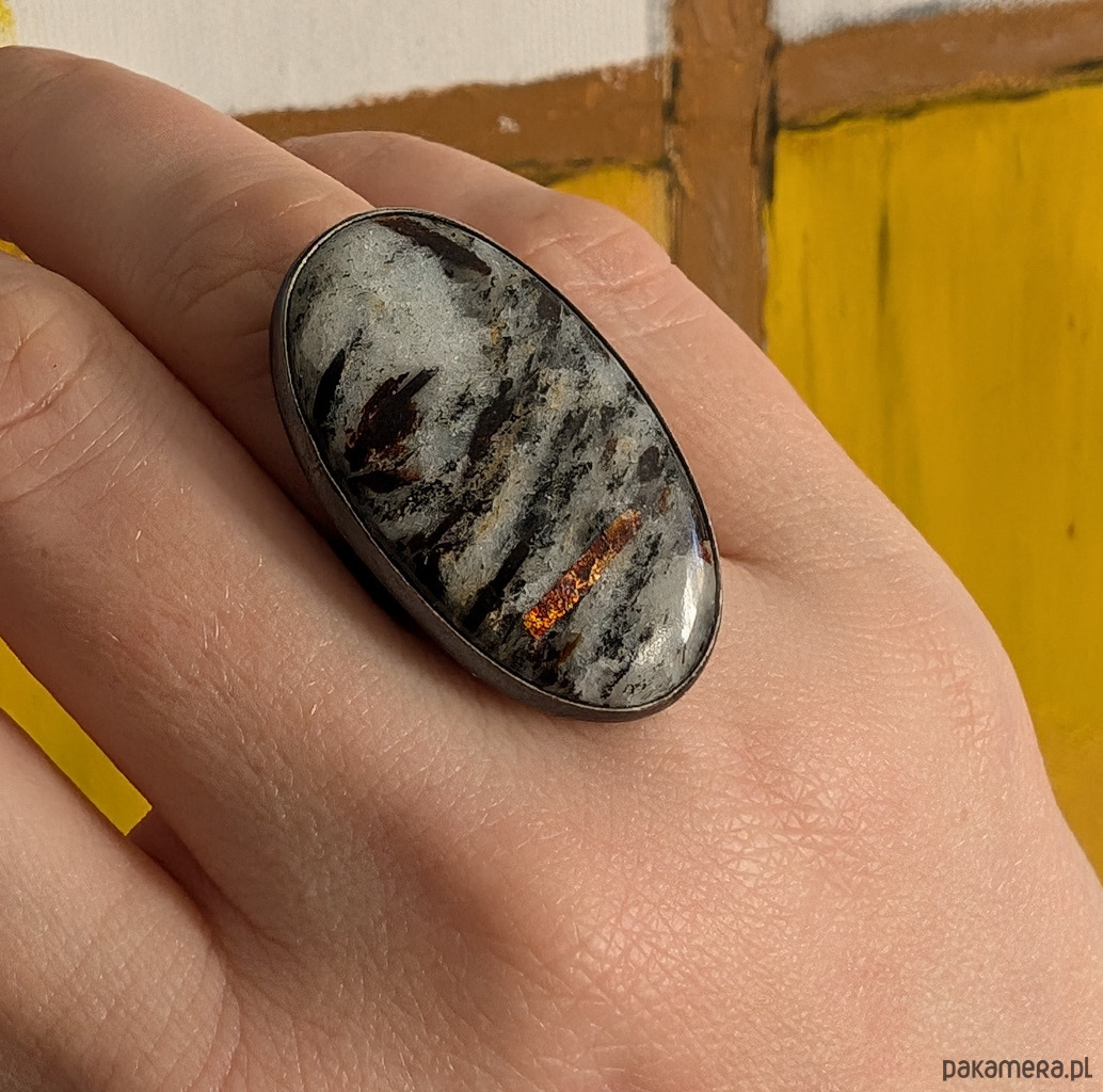 Zjawiskowy astrofilit oprawiony w srebro pr. 925, oksydowane. Waga 13 gramów. Wymiary całej oprawy 35 x 20 mm. Rozmiar jubilerski regulowany w szerokim zakresie. Powierzchnia kamienia o ciekawej strukturze, miejscami ze złocistymi igłami minerałów. Niezwykłe zjawisko,nie do ukazania na zdjęciu. Polecam!