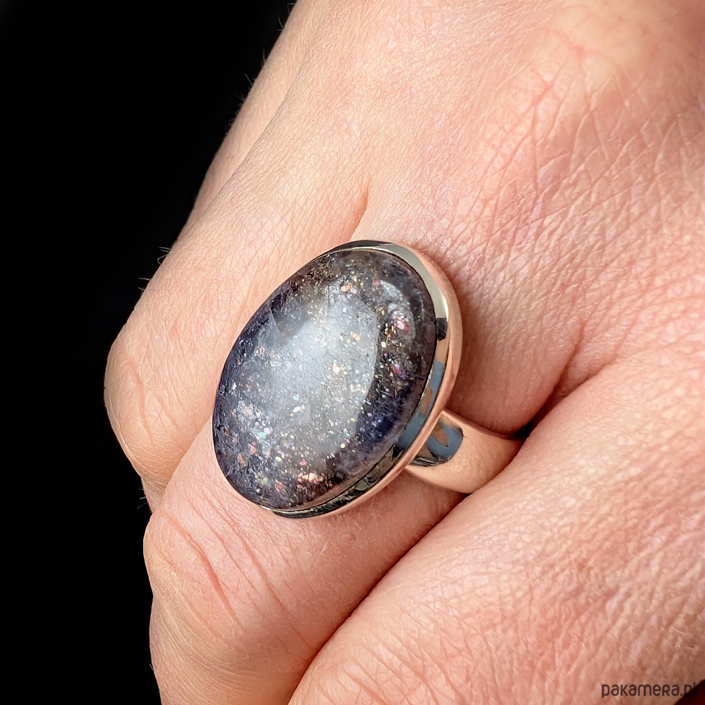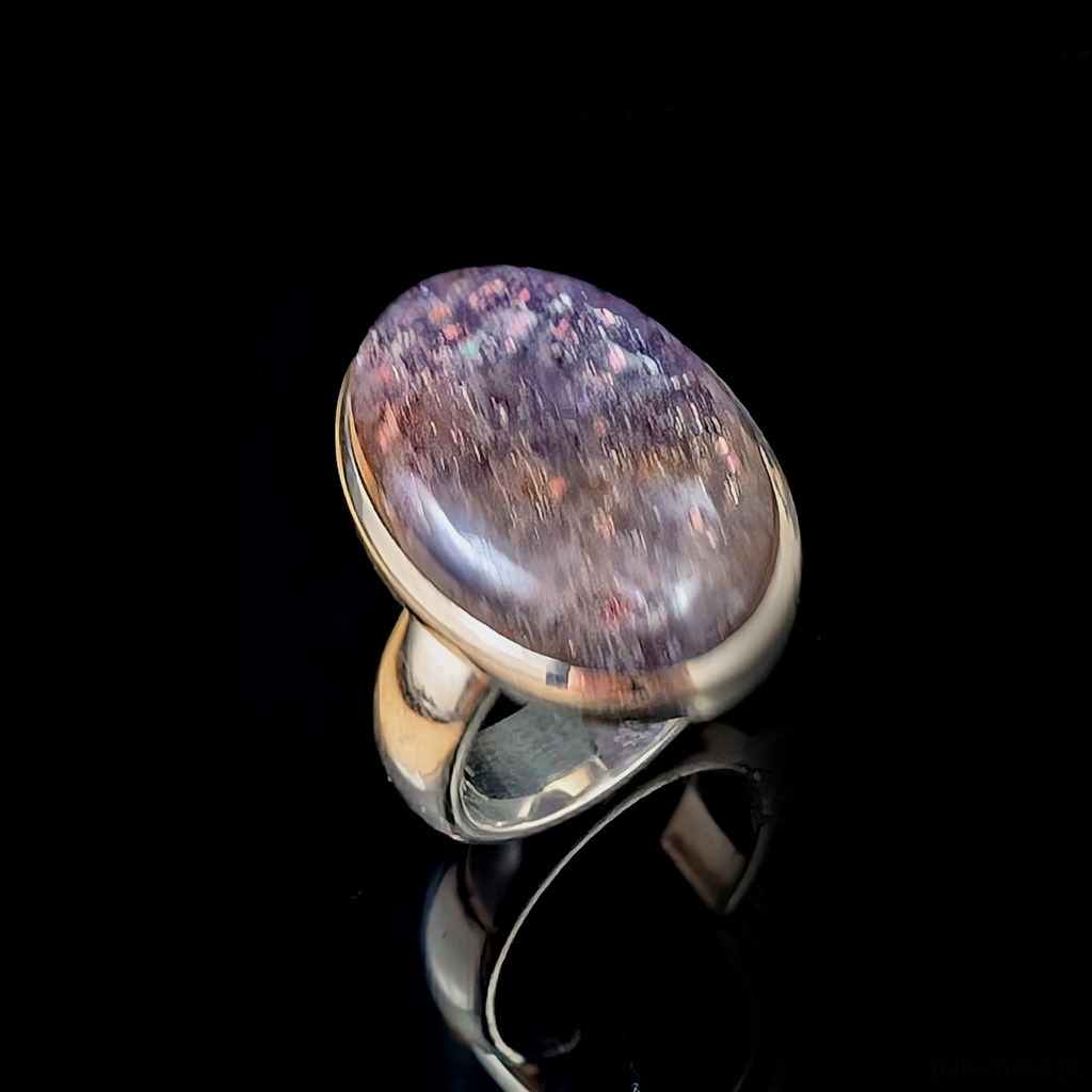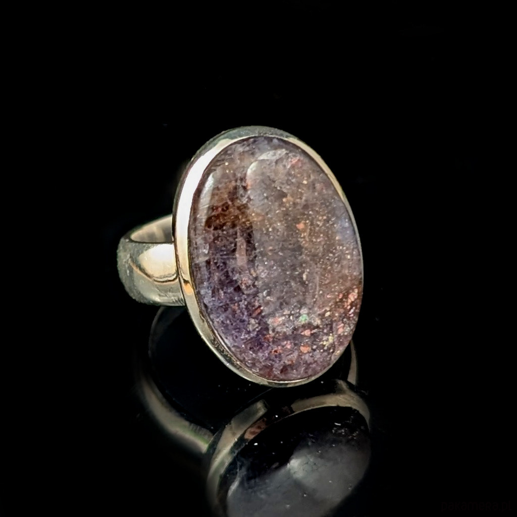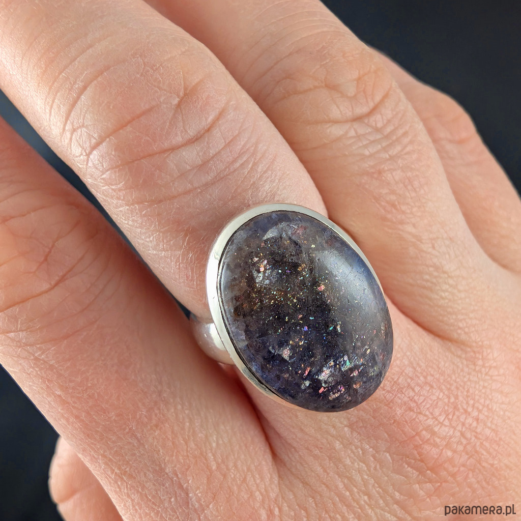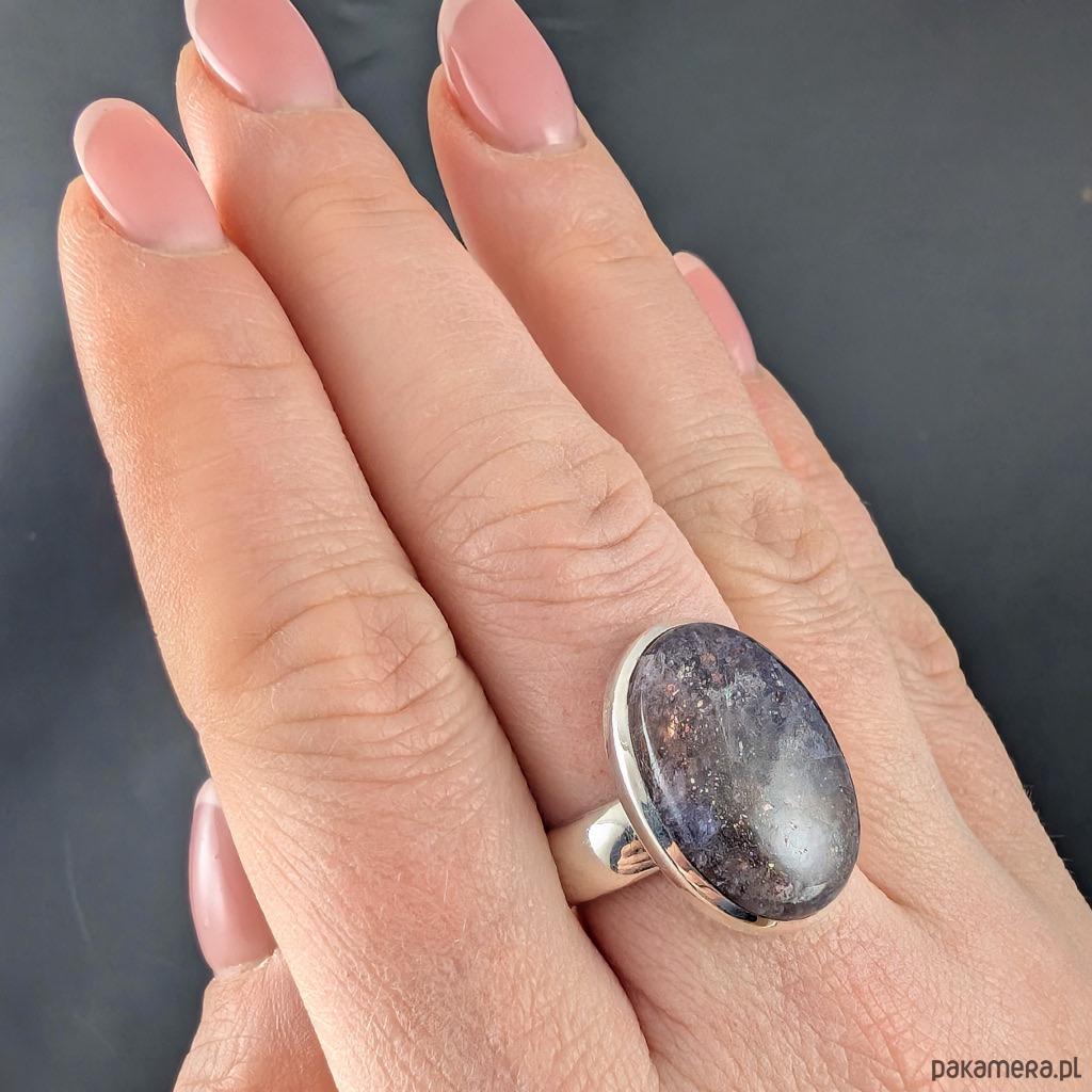 Pierścień wykonany ze srebra próby 925, który zdobi wyjątkowy okaz kamienia słonecznego w iolicie. Rzadki minerał wykazujący tzw.efekt awenturyzacji w postaci maleńkich mieniących się wrostów- łusek innych minerałów,np.hematytu. Niezwykle mienią się w słońcu i świetle maleńkimi różowo-czerwonawymi drobinami. Ciekawe i atrakcyjne połączenie dwóch minerałów. Okazały kamień ma oprawę 22 x 16 mm. Pierścionek w rozmiarze jubilerskim regulowanym w wąskim zakresie rozmiarów 16- 21. Proszę napisać na jaki dopasować. Waga 9,3 g Wykonany przez dostawcę kamieni.