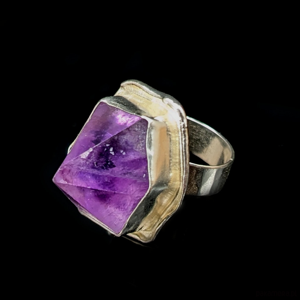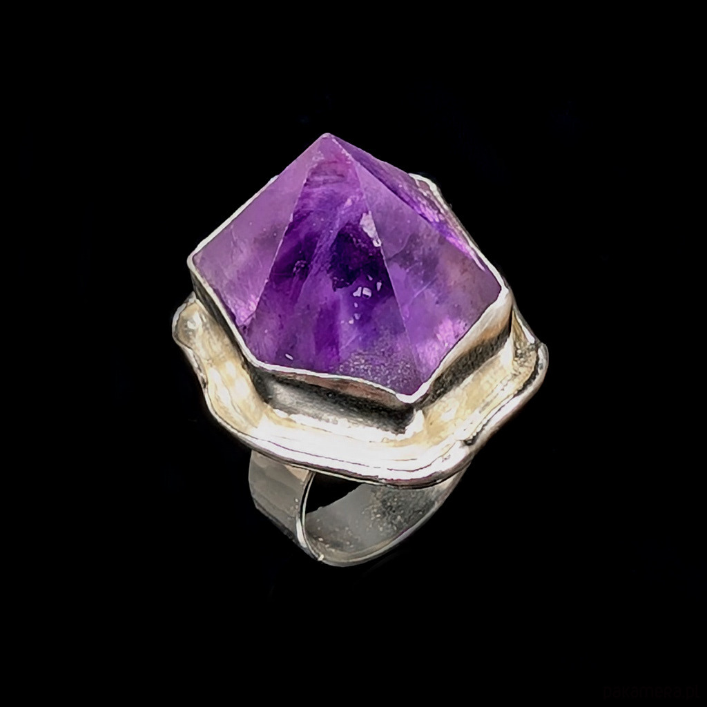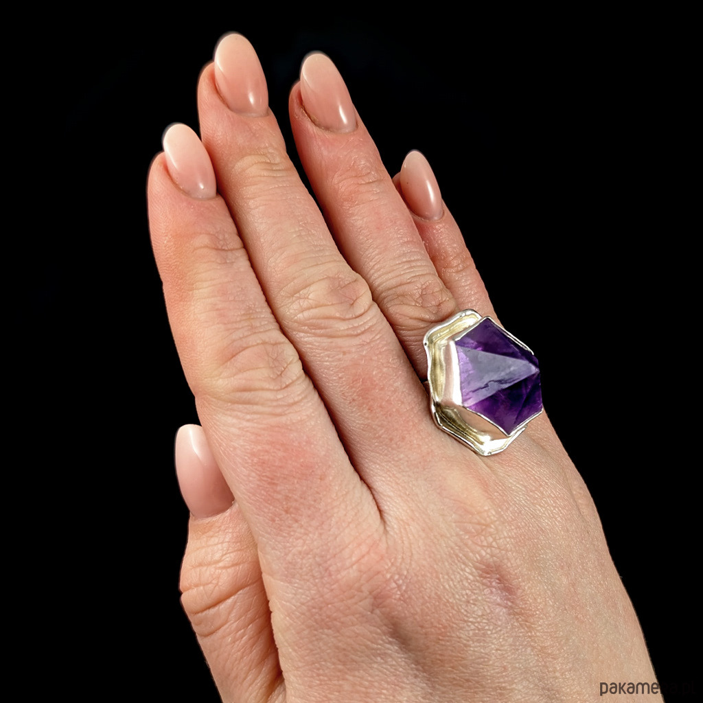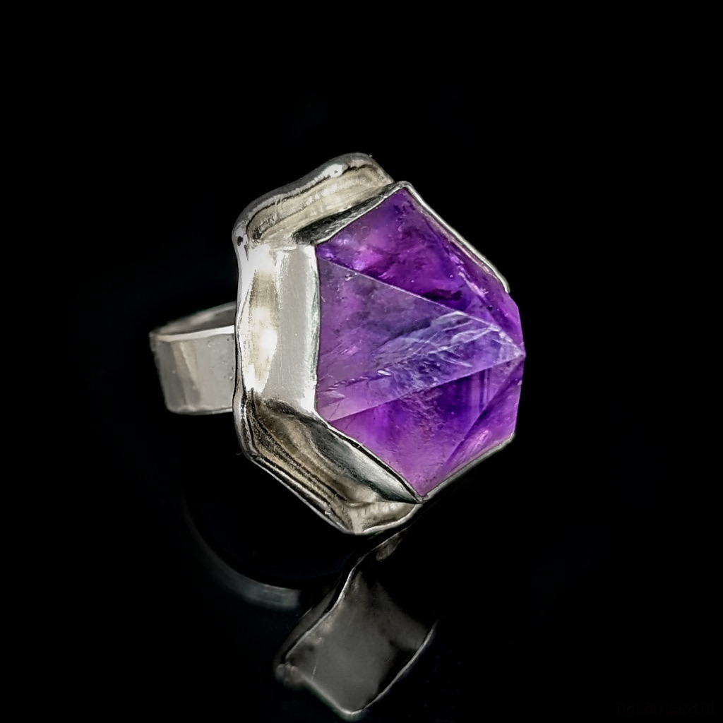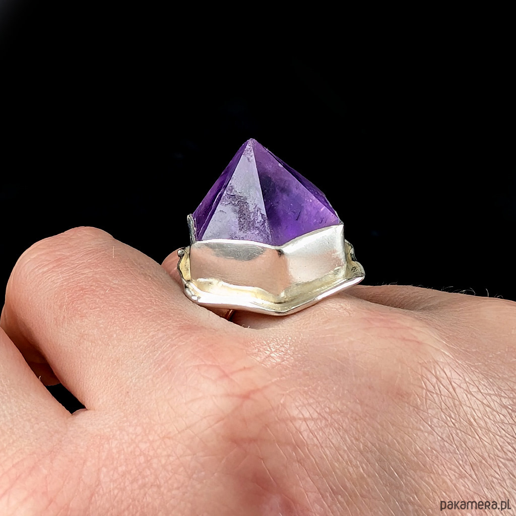 Okazały pierścień z oprawionym w oksydowane srebro pr.925 przepięknym ametystem o precyzyjnym szlifie, stożkowej bryle i niesamowitej barwie. Oprawa pierścienia średnica 27 x 23 mm. Wysokość 19 mm. Rozmiar jubilerski 14, moge powiększyć do max 15. Obrączka szeroka na 6 mm. Waga 14,8 grama. Pierścionek zapakowany w ozdobne pudełeczko.