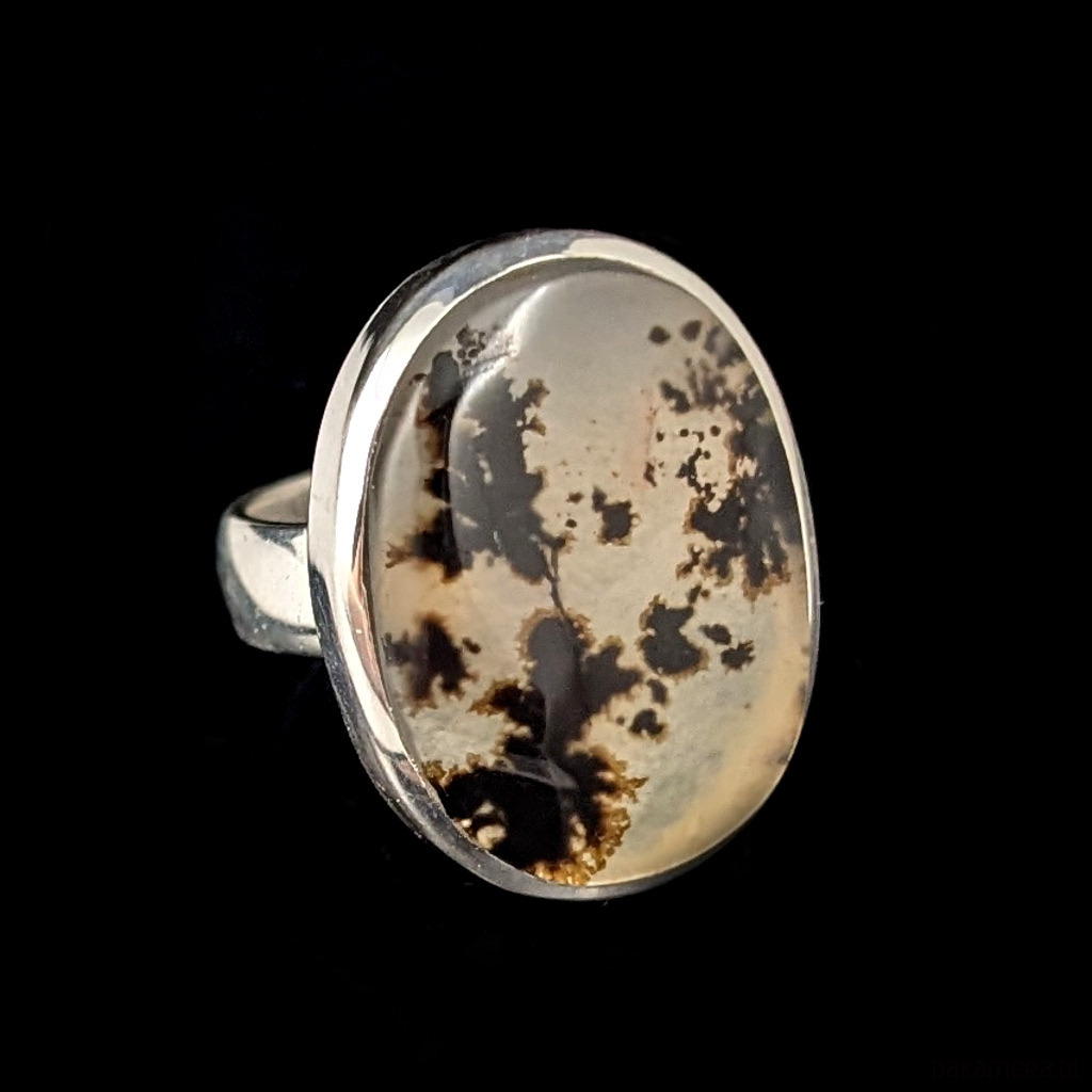 Pierścień z agatem montana oprawionym w srebro próby 925. Wymiary 23 x 17 mm, waga 8 g. Wewnątrz kamienia piękne, naturalne malunki dendrytowe. Rozmiar jubilerski regulowany w zakresie 15-19, proszę napisać, na jaki dopasować. Pierścień zostanie zapakowany w ozdobne pudełeczko. Polecam w komplecie z wisiorem. Wykonany przez dostawcę kamieni.