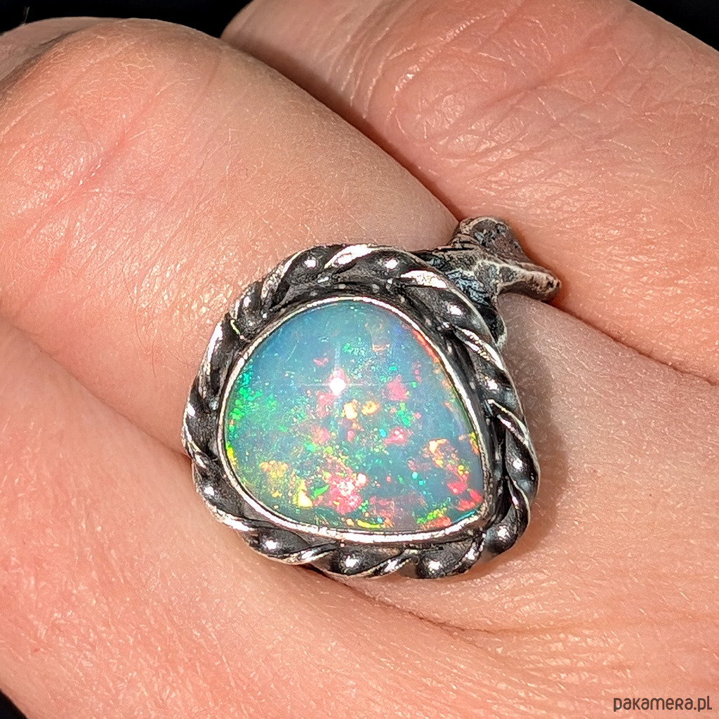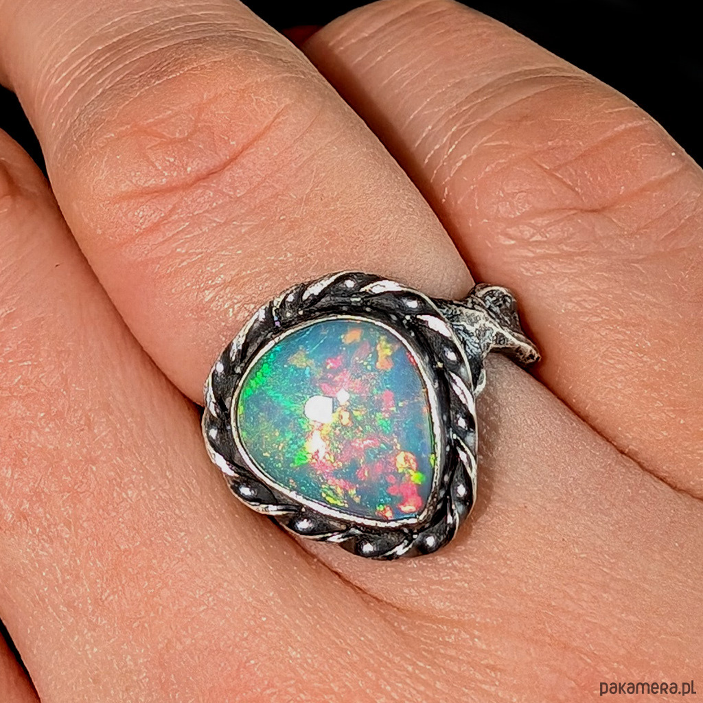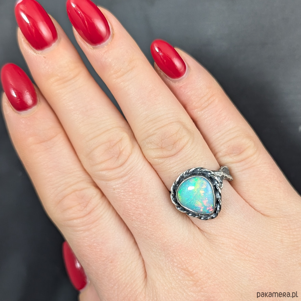 Pierścień wykonany z oksydowanego srebra pr 925 z pięknym okazem opalu z Etiopii. Rozmiar jubilerski 15, moge powiekszyc do 16, Obrączka asyetryczna, szerokość 5 mm. Oprawa kamienia 17 x 16 mm. Waga 6 g. Pierścień zostanie zapakowany w ozdobne pudełeczko.