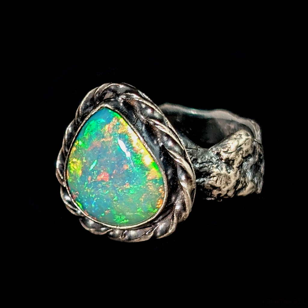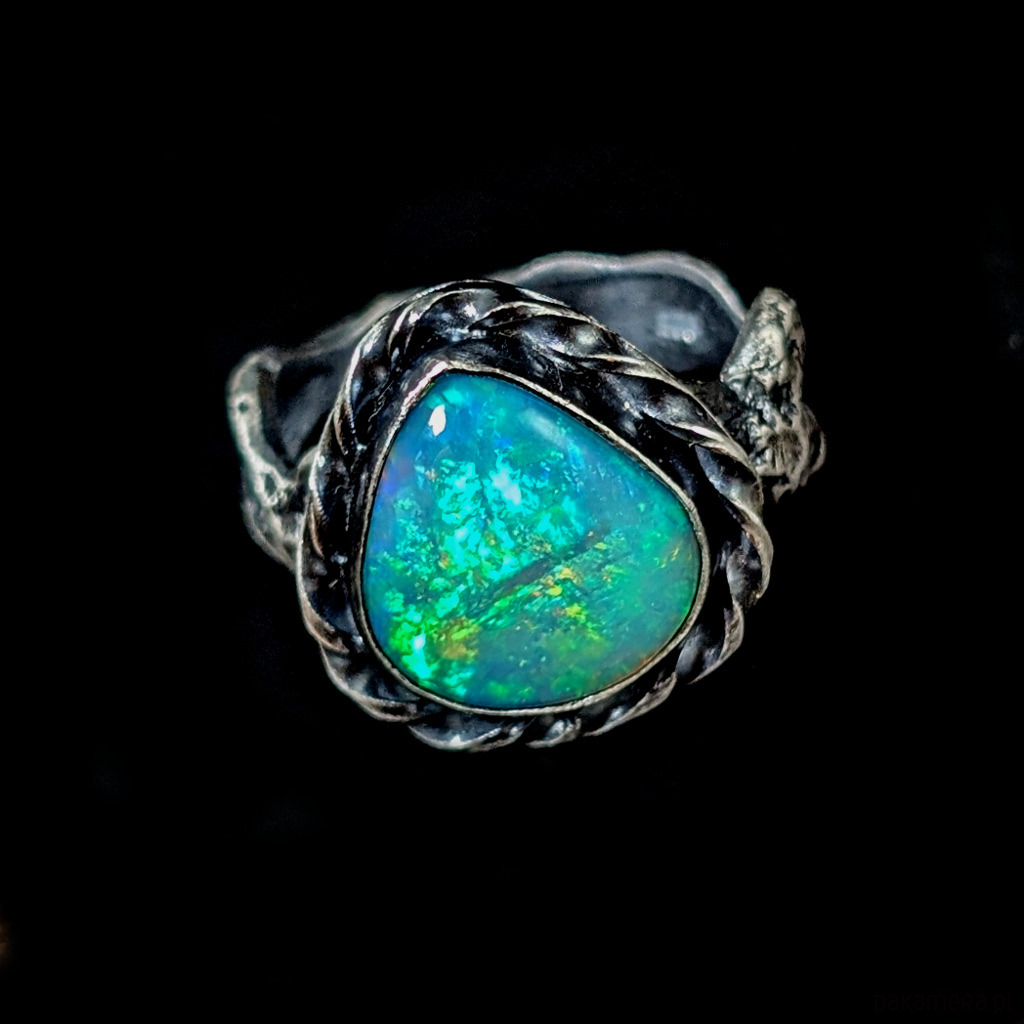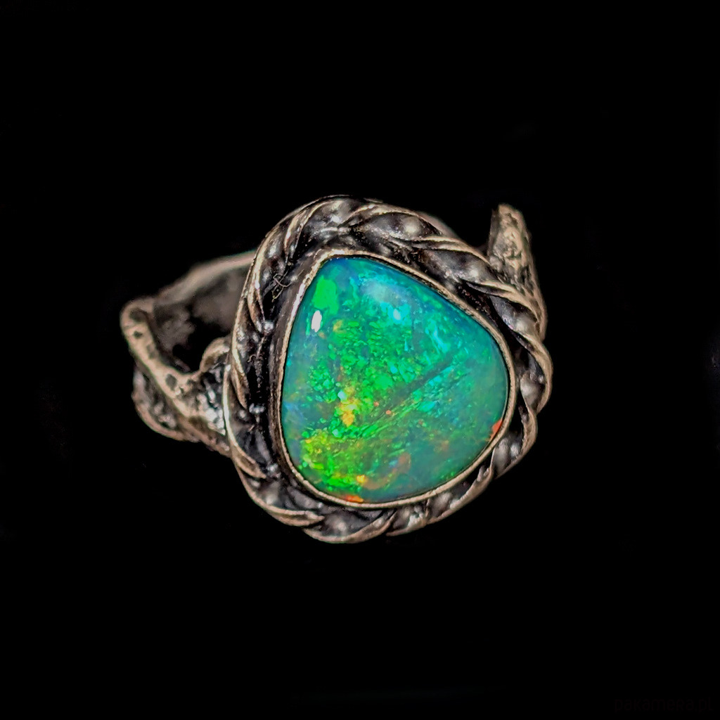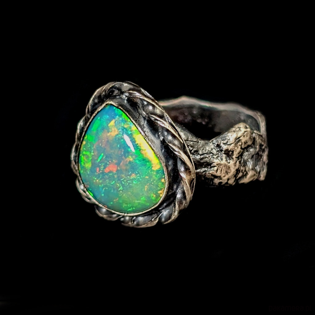 Pierścień wykonany z oksydowanego srebra pr 925 z pięknym okazem opalu z Etiopii. Rozmiar jubilerski 15, moge powiekszyc do 16, Obrączka asyetryczna, szerokość 5 mm. Oprawa kamienia 17 x 16 mm. Waga 6 g. Pierścień zostanie zapakowany w ozdobne pudełeczko.