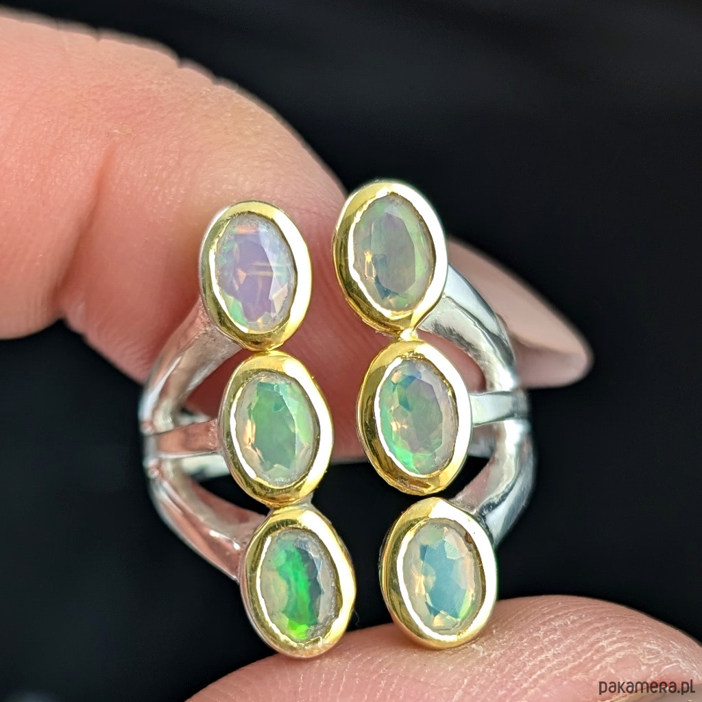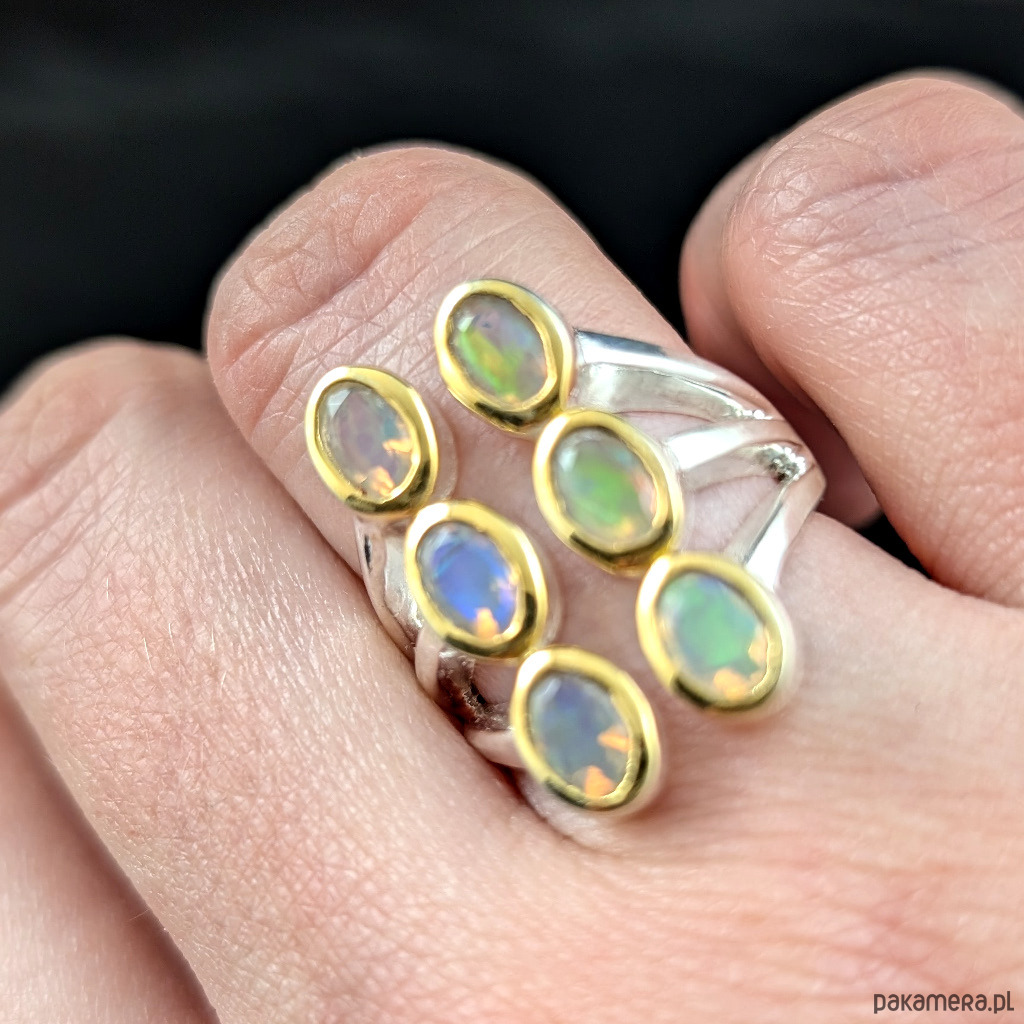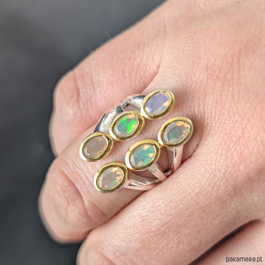 Pierścień z oprawionymi w srebro pr. 925 baśniowymi opalami etiopskimi o opalizacji dodatkowo spotęgowanej fasetowaniem. Wymiary pierścienia23 x 13 mm. Opale w oprawie 7 x 5 mm. Waga 8,5 g. Regulacjaw zakresie rozmiaru jubilerskiego 13- 18, proszę napisać na jaki dopasować. Wykonany przez dostawcę kamieni. Pierścień zostanie wysłany w ozdobnym pudełeczku.