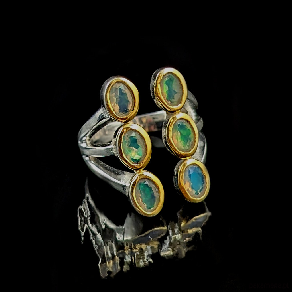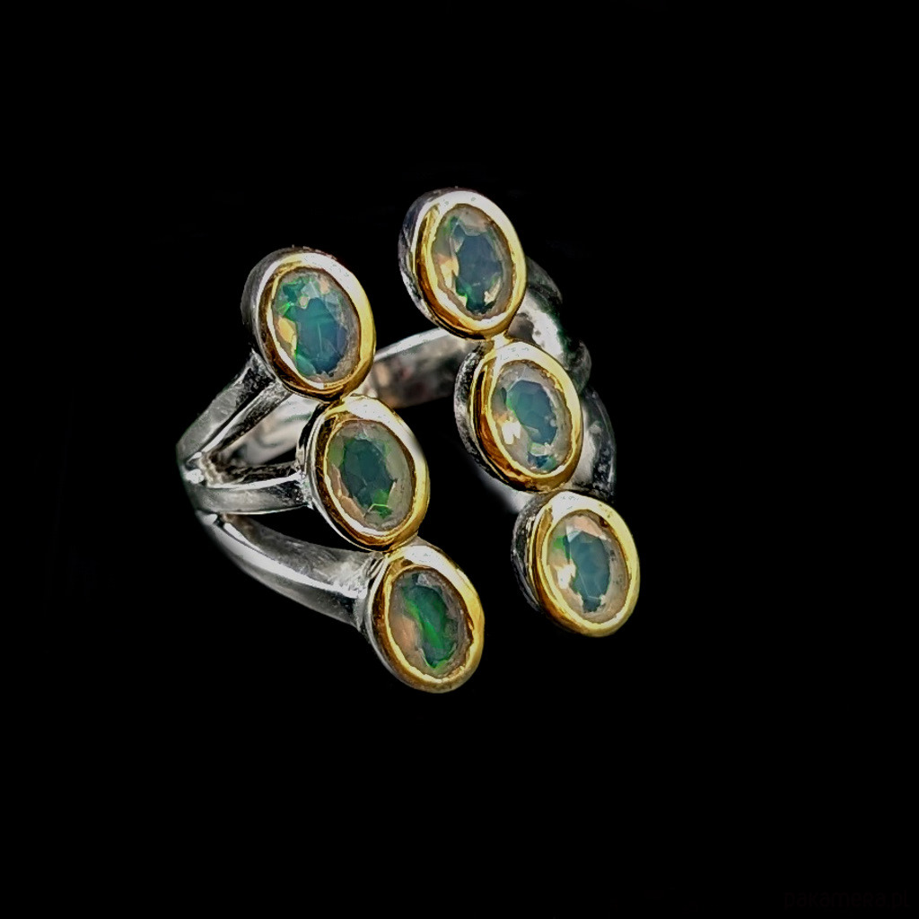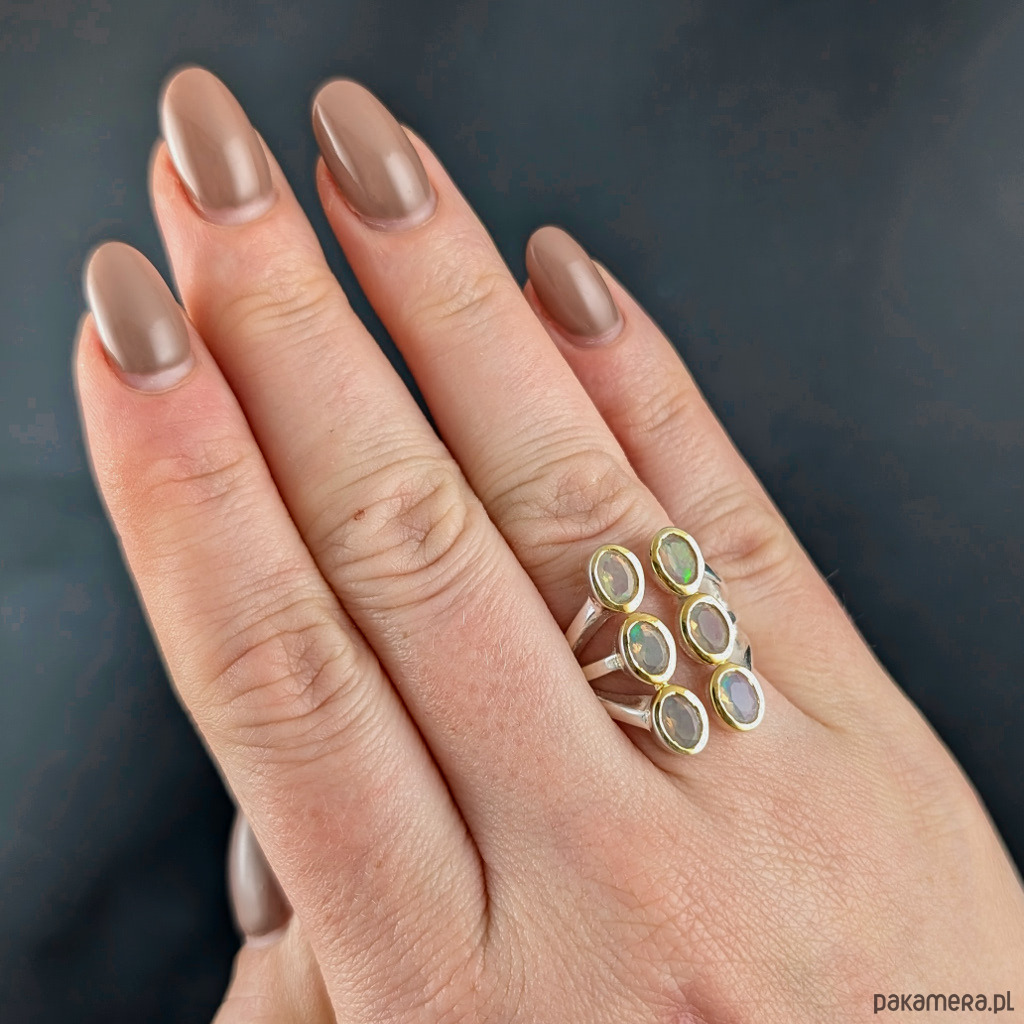 Pierścień z oprawionymi w srebro pr. 925 baśniowymi opalami etiopskimi o opalizacji dodatkowo spotęgowanej fasetowaniem. Wymiary pierścienia23 x 13 mm. Opale w oprawie 7 x 5 mm. Waga 8,5 g. Regulacjaw zakresie rozmiaru jubilerskiego 13- 18, proszę napisać na jaki dopasować. Wykonany przez dostawcę kamieni. Pierścień zostanie wysłany w ozdobnym pudełeczku.