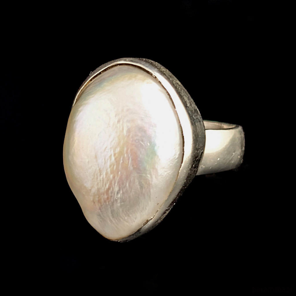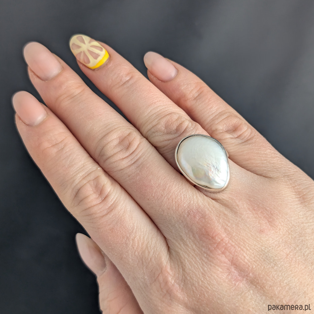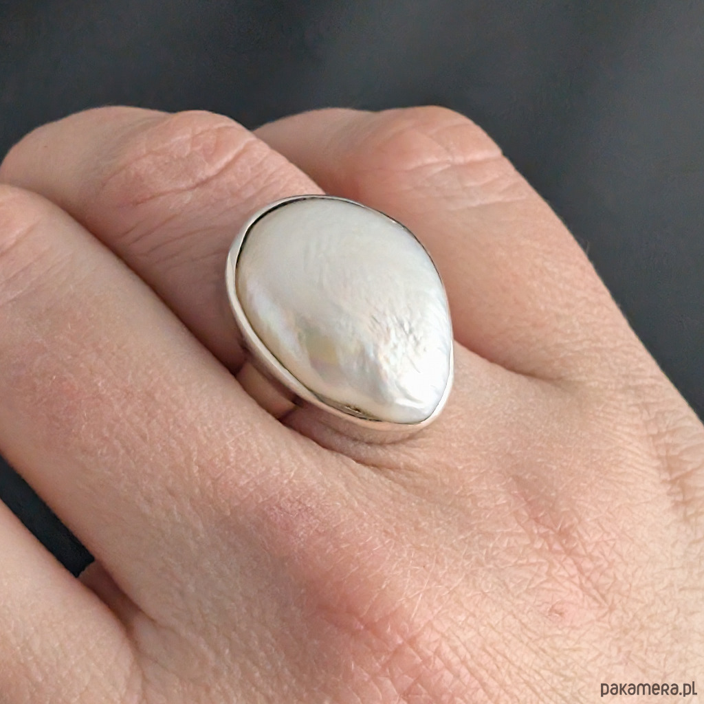Pierścień wykonany ze srebra próby 925 z oprawioną okazałą, piękną naturalną perłą. Ponadczasowa elegancja, klasyka z nutą awangardy. Wymiary 23 x 16 mm, waga pierścienia 10,2 g. Rozmiar jubilerski 13, mogę powiększyć na max 14. Szerokość obrączki to 6 mm. Wykonany przez dostawcę kamieni.