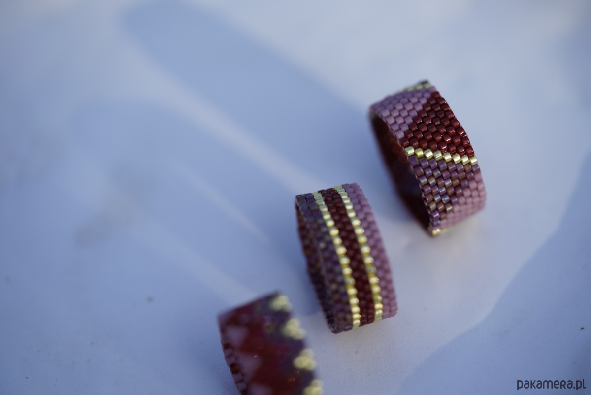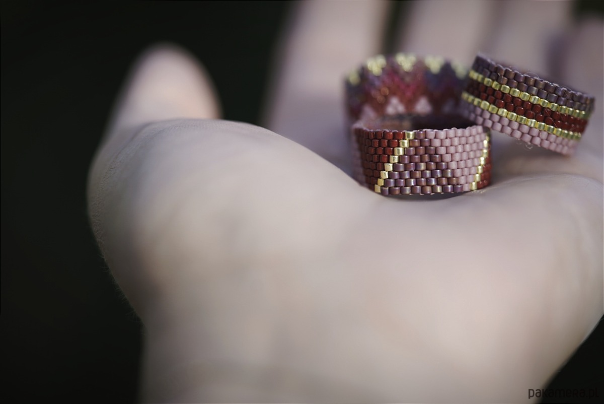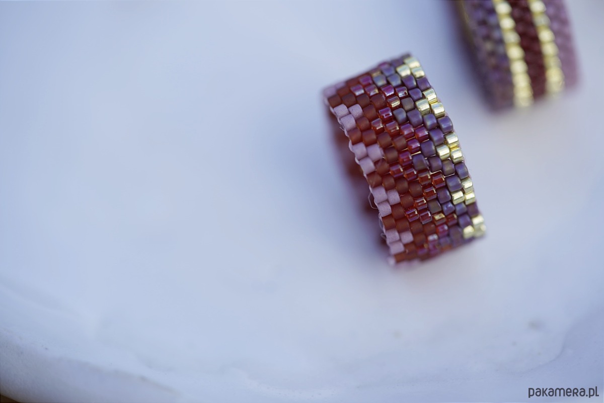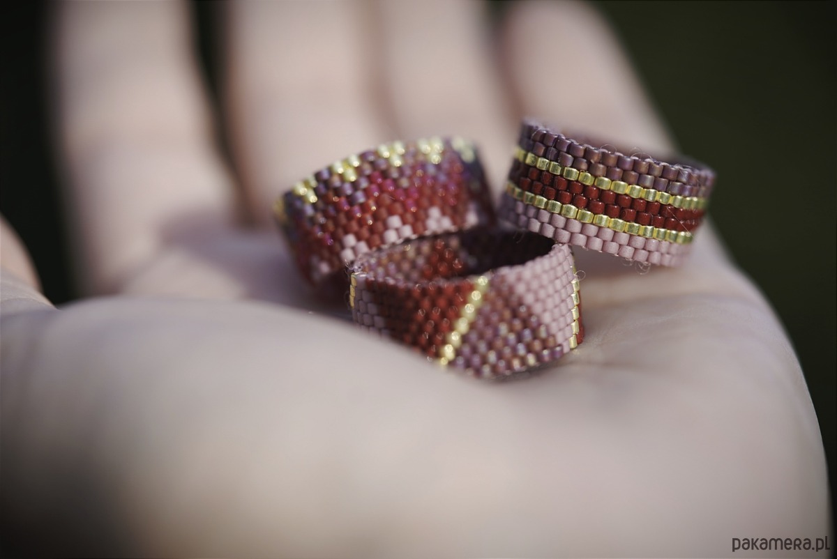 Wykonane z ceramicznych, japońskich, maleńkich koralików, przyszywanych jeden do drugiego bardzo cienką, precyzyjną igłą.