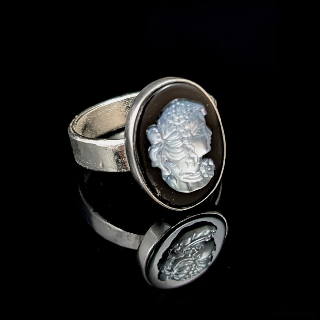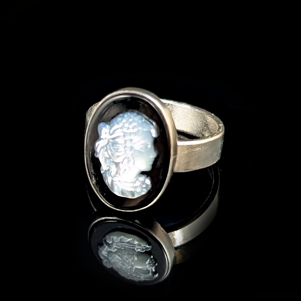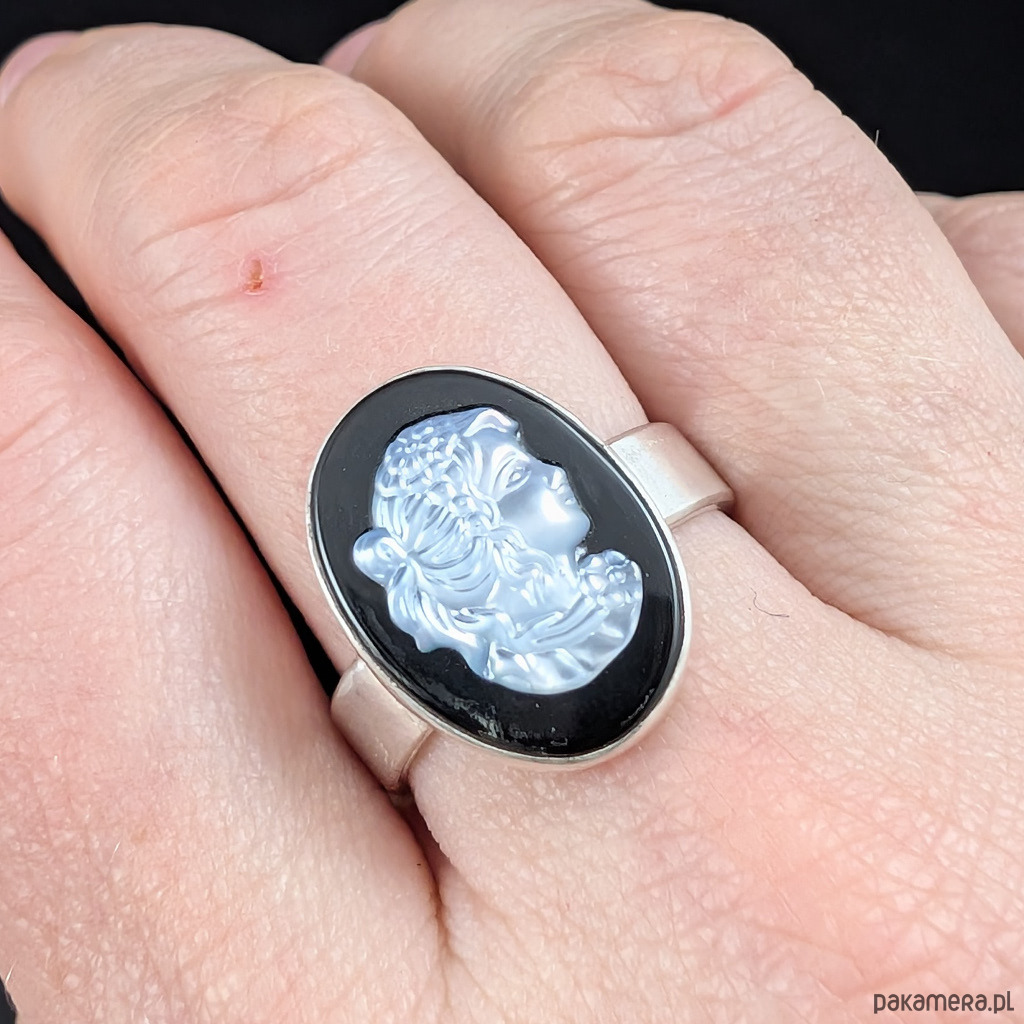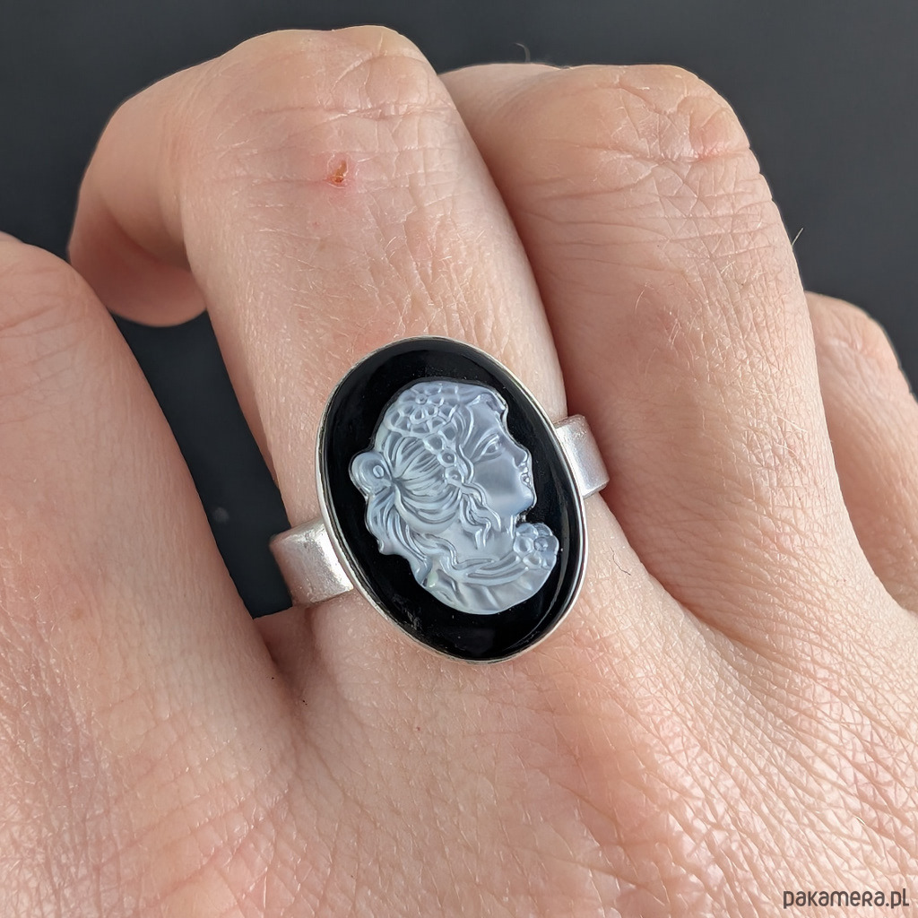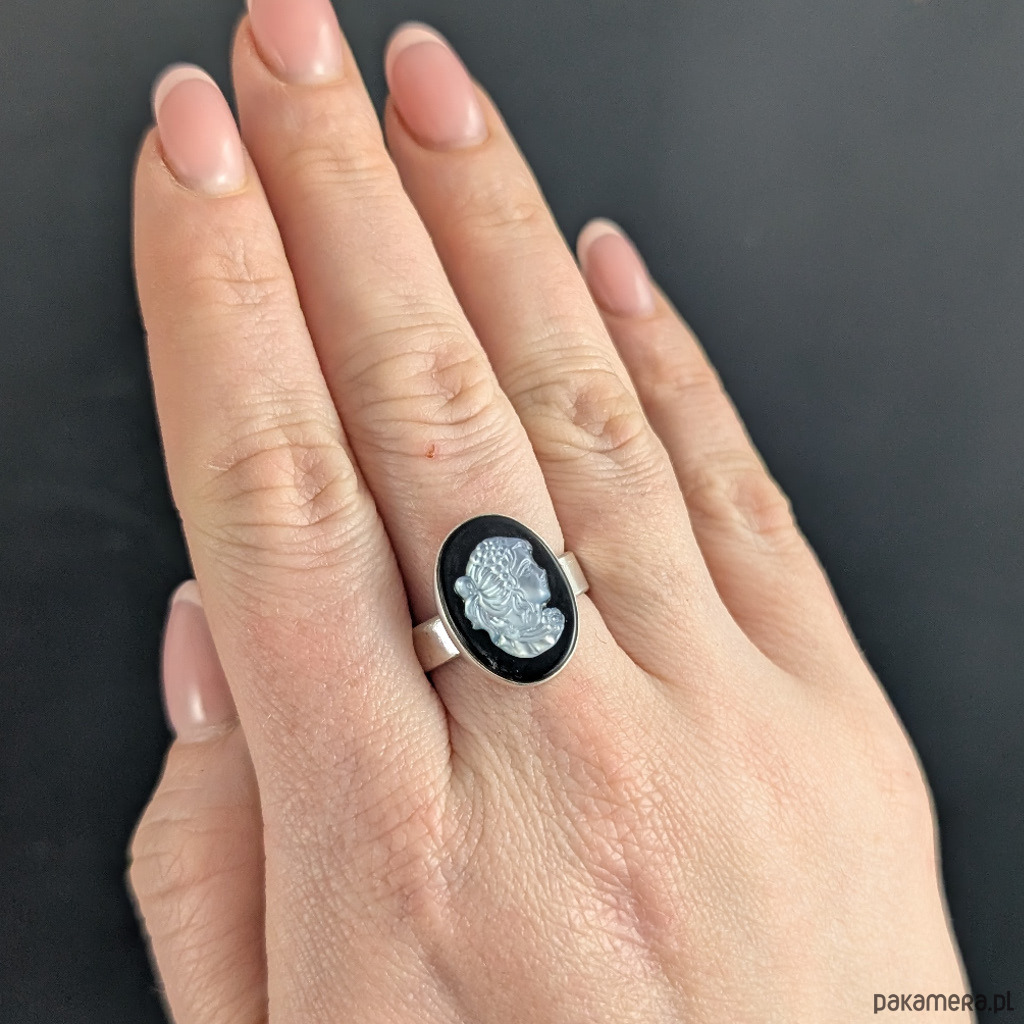 Sercem pierścienia jest piękna kamea z frezowanej muszli na podstawie z onyksu.