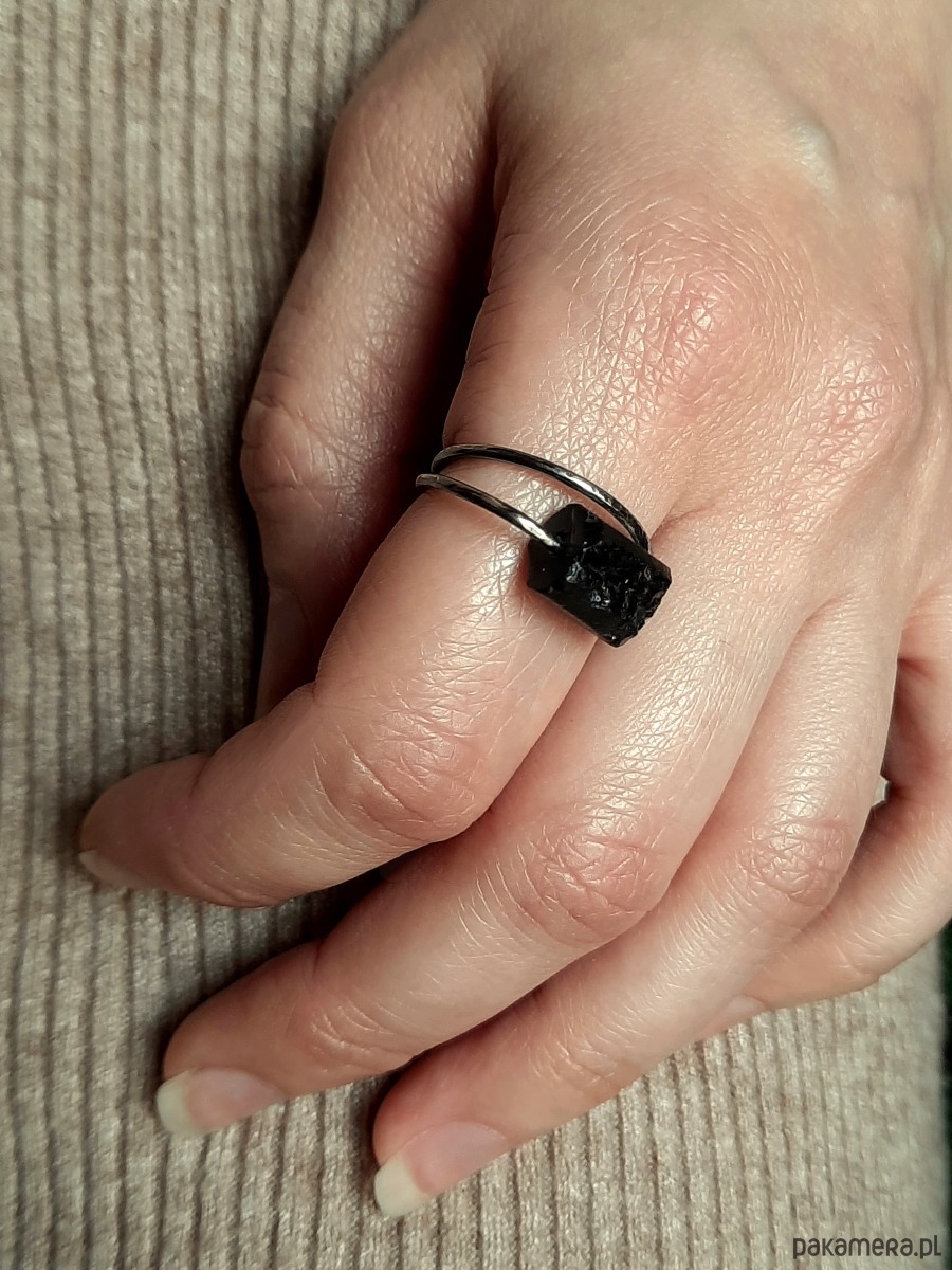 Pierścionek BLACK jest surowy, prosty, czarujący. Górę pierścionka zdobi matowy naturalny czarny turmalin - silny kamień ochronny. Blokuje on złe energie, uroki, zaprowadza harmonię wewnętrzną, intensywnie wpływa na kreatywność.