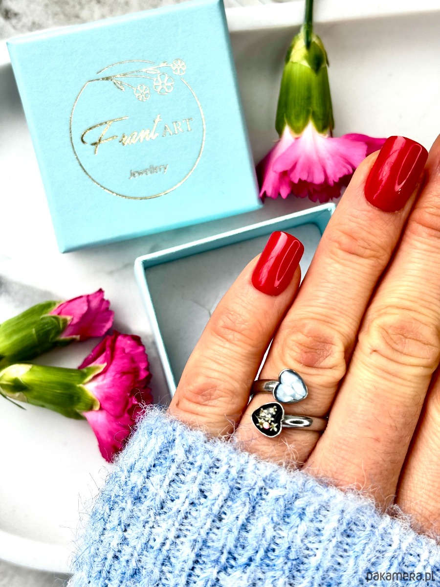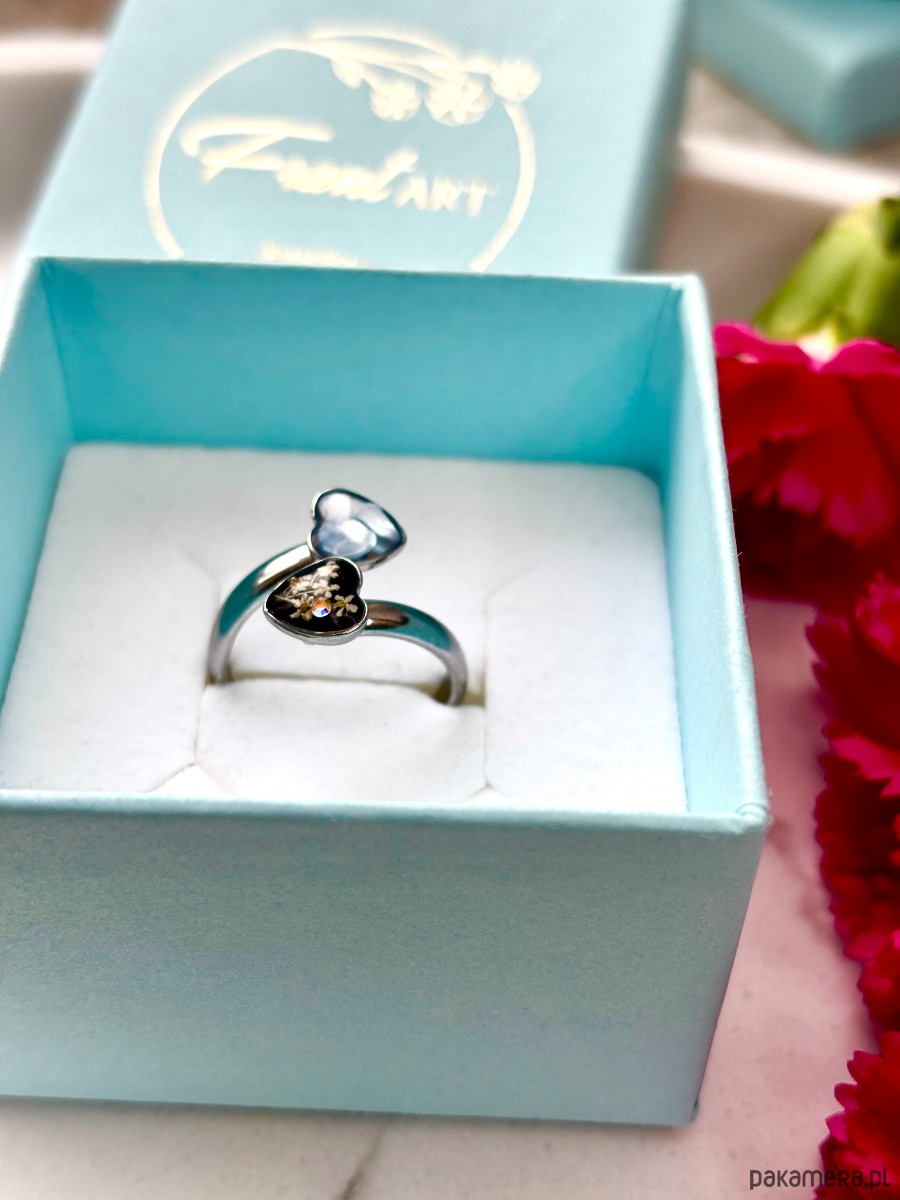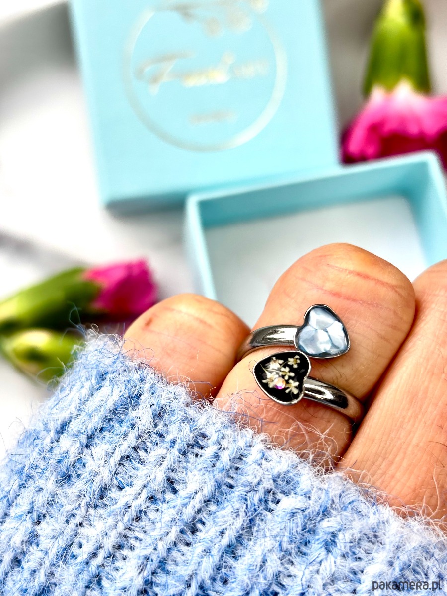 Ręcznie wykonany pierścionek dwoma oczkami w kształcie serca. Biżuteria wykonana jest z wyselekcjonowanych kawałków muszli, drobinek szkła w odcieniu niebieskim, czerni oraz suszonych kwiatów dzikiej marchwi. Pierścionek pięknie prezentuje się na dłoni, dzięki możliwości regulacji można dopasować go do większości placów.