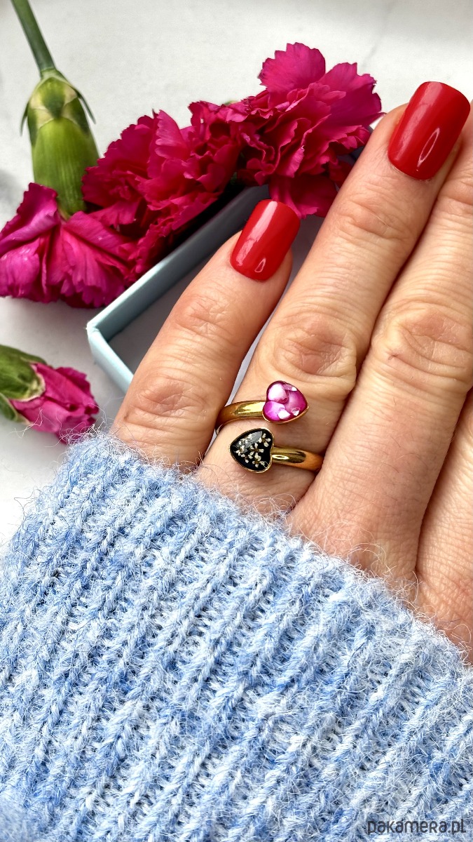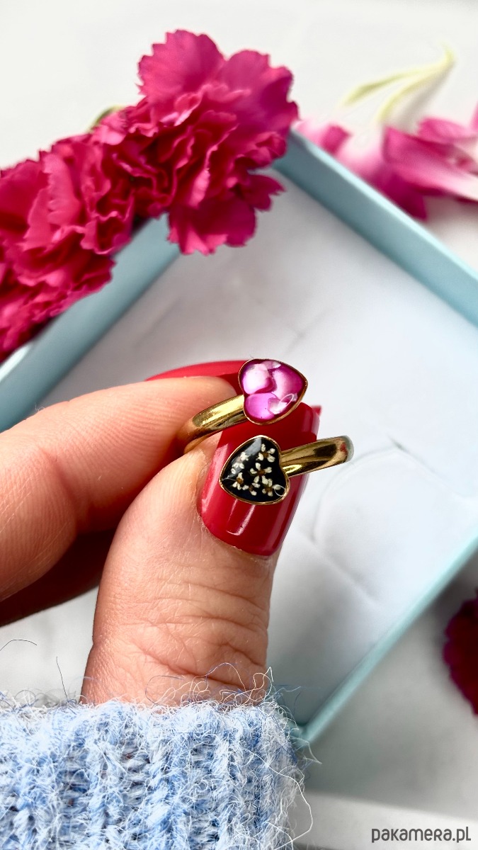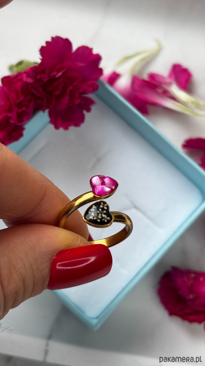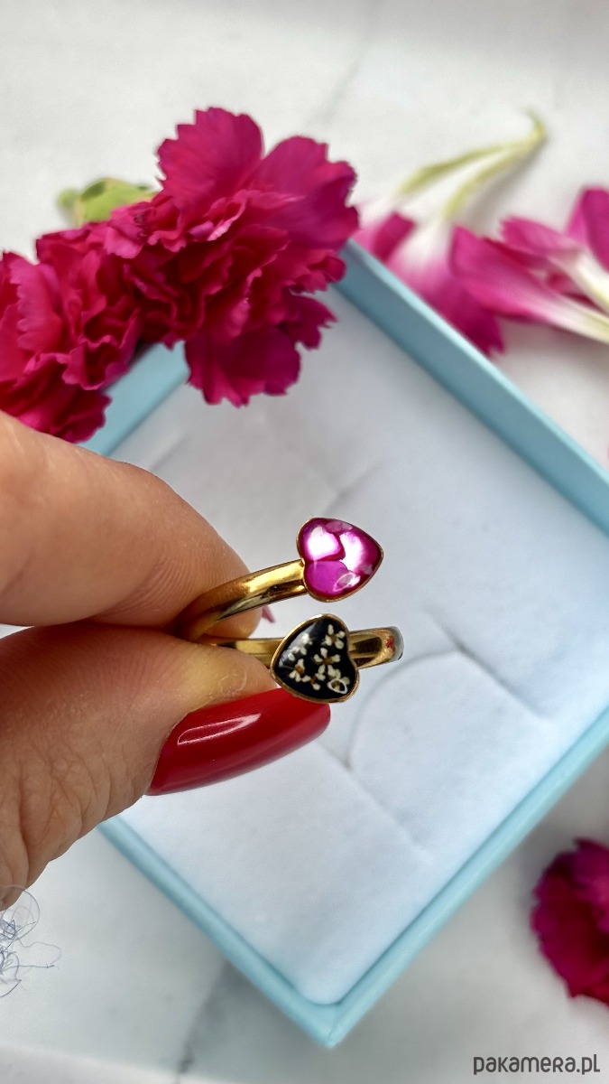 Ręcznie wykonany pierścionek dwoma oczkami w kształcie serca. Biżuteria wykonana jest z wyselekcjonowanych kawałków muszli, drobinek szkła w odcieniach różu, czerni oraz suszonych kwiatów dzikiej marchwi. Pierścionek pięknie prezentuje się na dłoni, dzięki możliwości regulacji można dopasować go do większości placów.