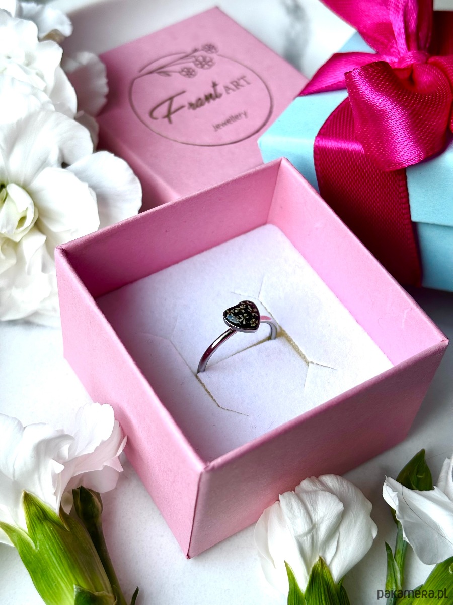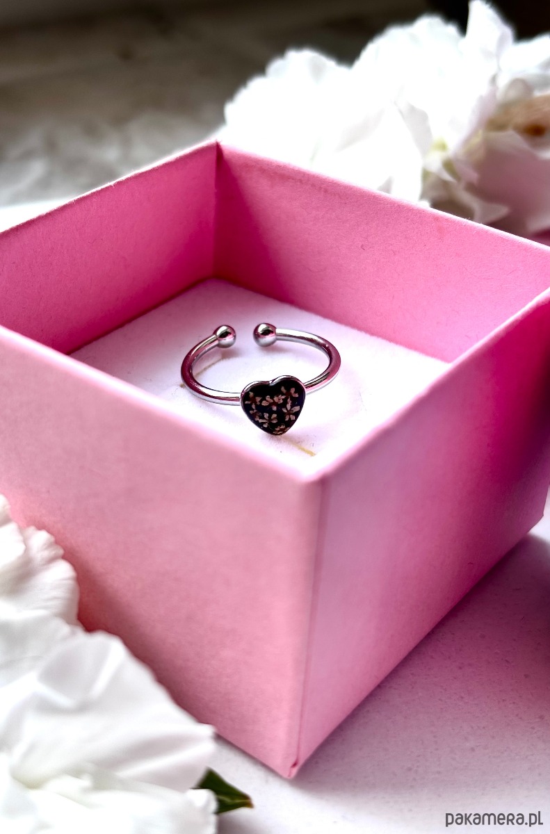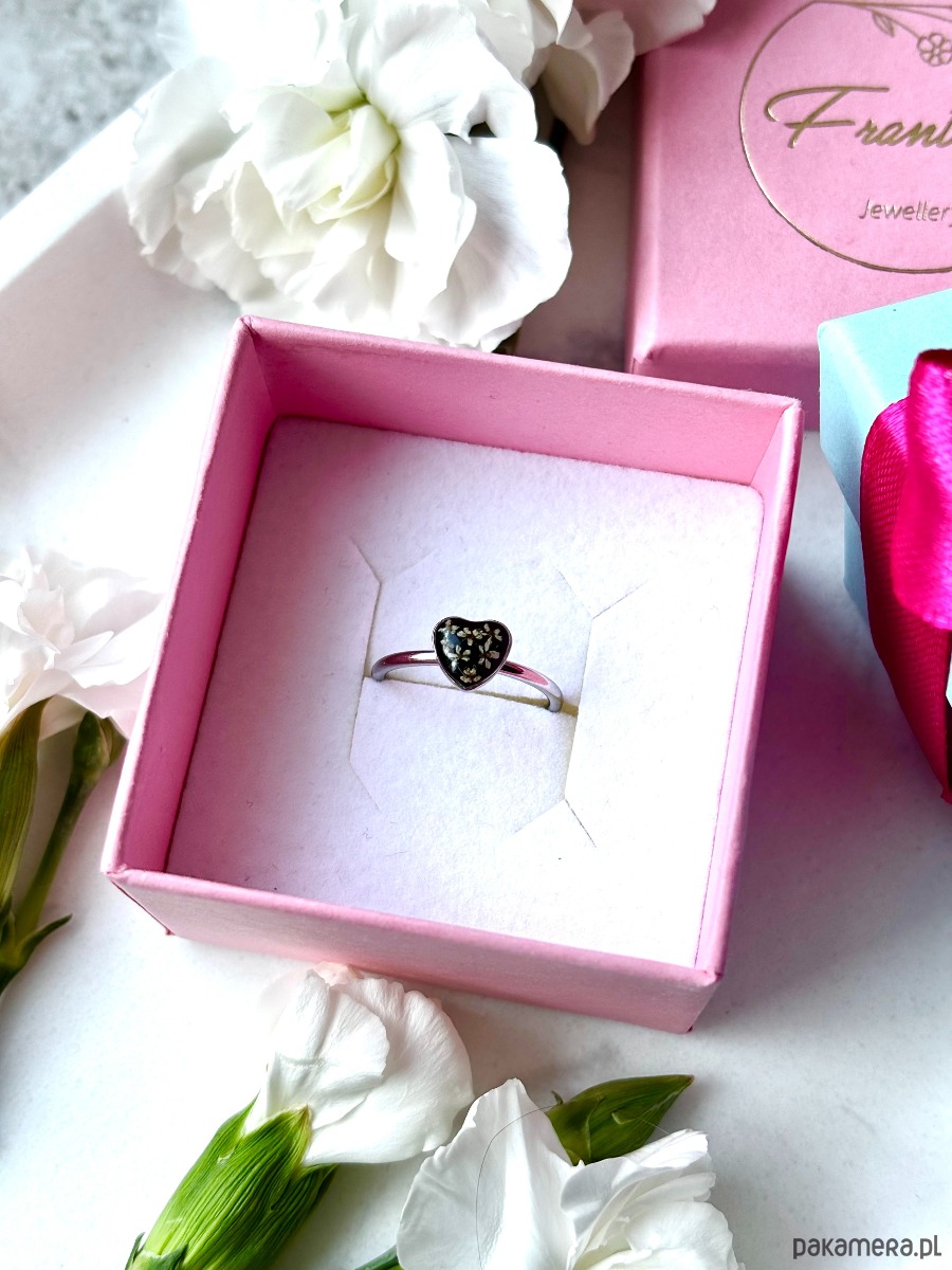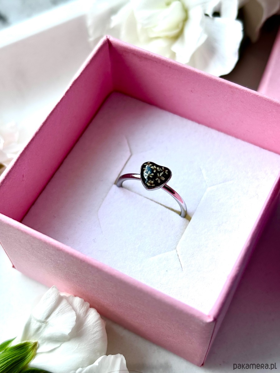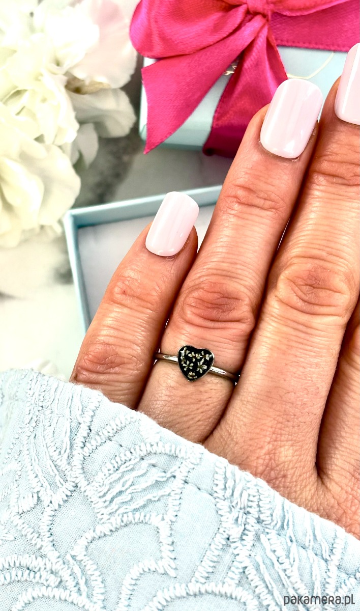 Ręcznie wykonany pierścionek z oczkiem w kształcie serca. Biżuteria wykonana jest z wyselekcjonowanych kawałków szkła w kolorze czerni oraz suszonych kwiatów dzikiej marchwi. Pierścionek pięknie prezentuje się na dłoni, dzięki możliwości regulacji można dopasować go do większości placów.