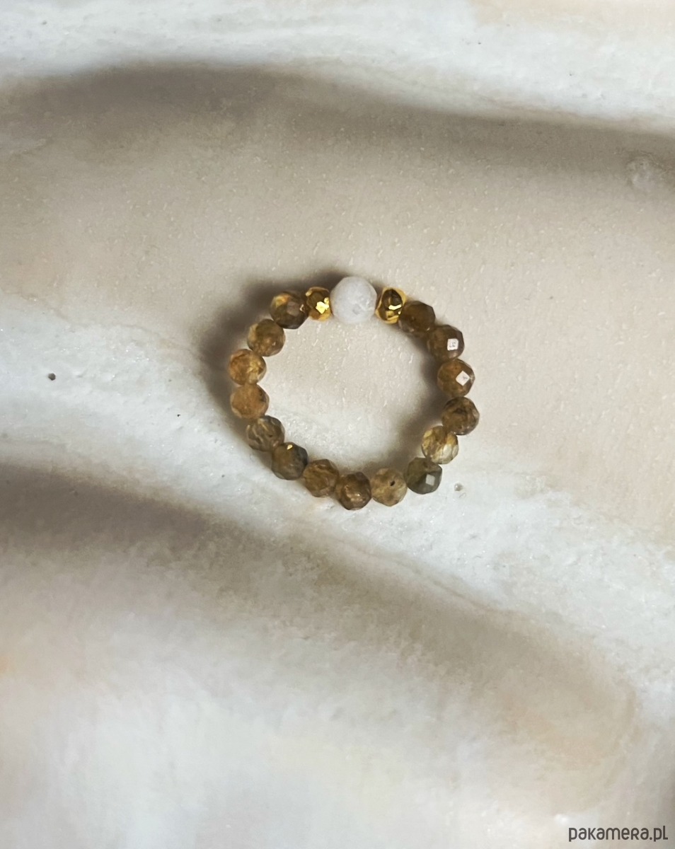 Bardzo subtelny i delikatny pierścionek elastyczny BLAIR z kamieni naturalnych: szarego labradorytu 3 mm, wykończony koralikiem kamienia księżycowego 4mm i dwoma złotymi hematytami.