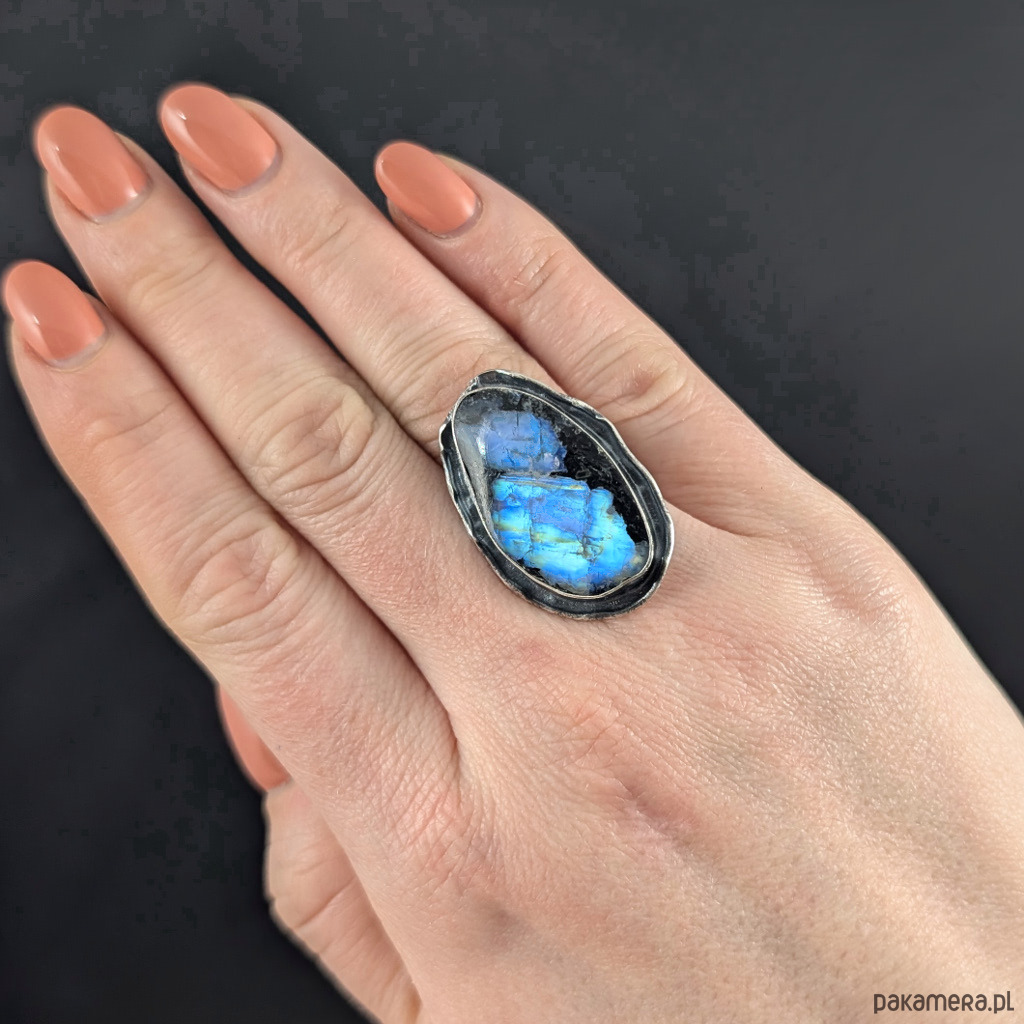 Pierścień z oprawionym w oksydowane srebro próby 925 pięknym kamieniem księżycowym o błękitnej poświecie . Szerokość potrójnej obrączki max 13 mm. Kamień ma oprawę 33 x 22 mm. Rozmiar jubilerski 13, mogę powiększyć na max 14. Waga 11 gramów. Pierścień zapakowany zostanie w ozdobne pudełeczko.