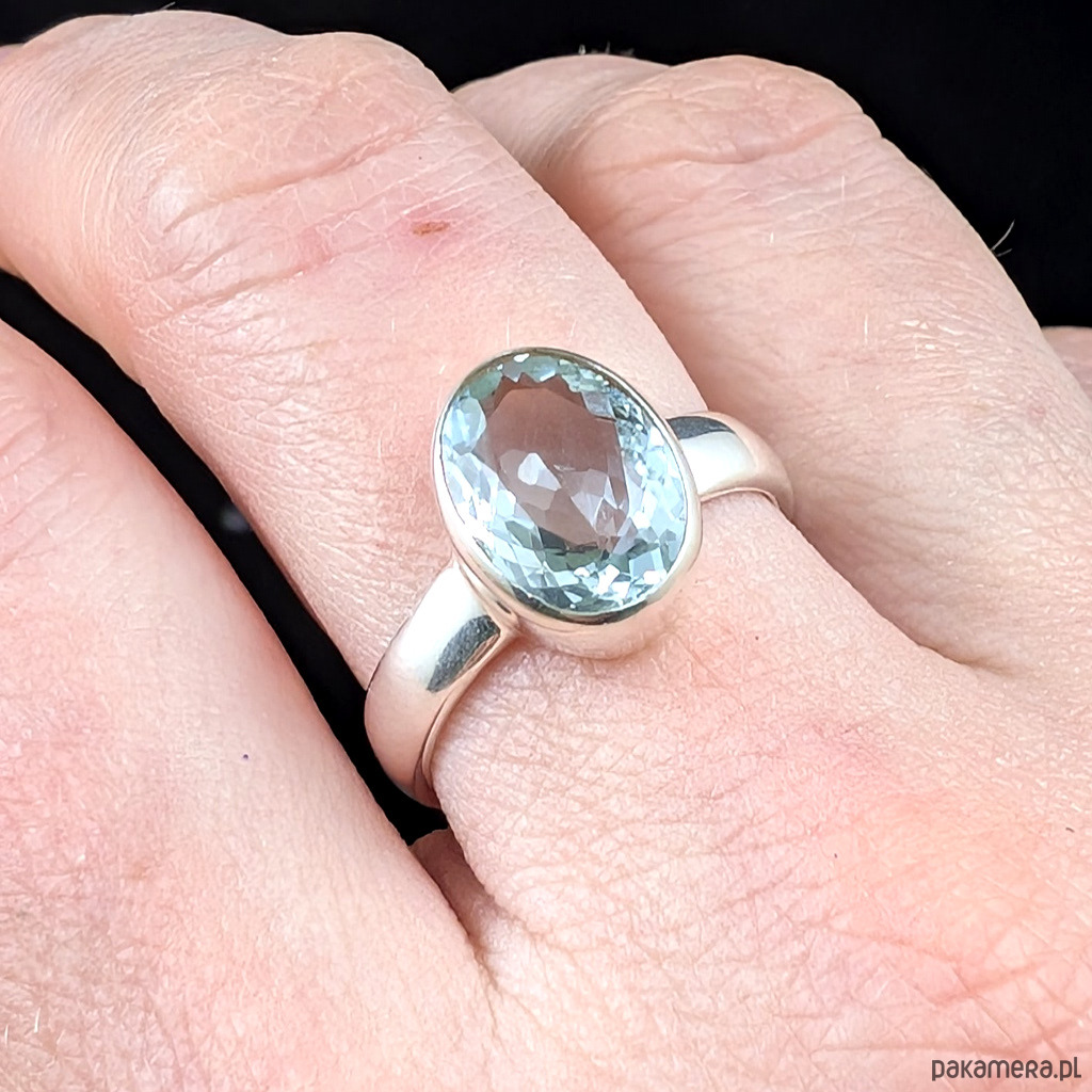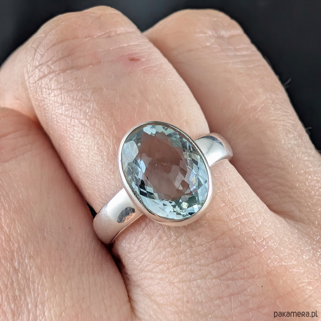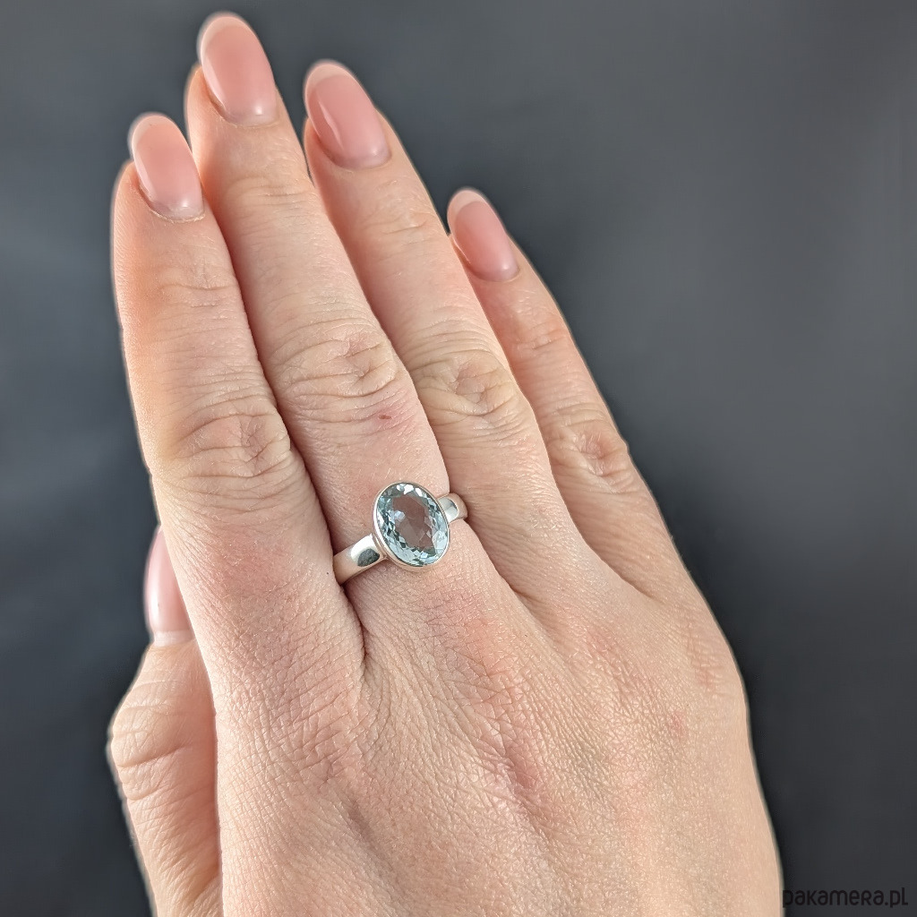 Pierścień z oprawionym w srebro próby 925 pięknym, dostojnym akwamarynem. Szerokość obrączki 4 mm. Okazały, niezwykle przejrzysty kamień o precyzyjnym szlifie ma oprawę 12 x 9mm. Rozmiar jubilerski 14. Mogę powiększyć na max 15. Proszę pytać w sprawie innych rozmiarów. Polecam, jest przepiękny. Oprawa z tyłu otwarta co potęguje przejrzystość kamienia. Waga 5 gramów. Wykonany przez dostawcę kamieni. Pierścień zapakowany zostanie w ozdobne pudełeczko.