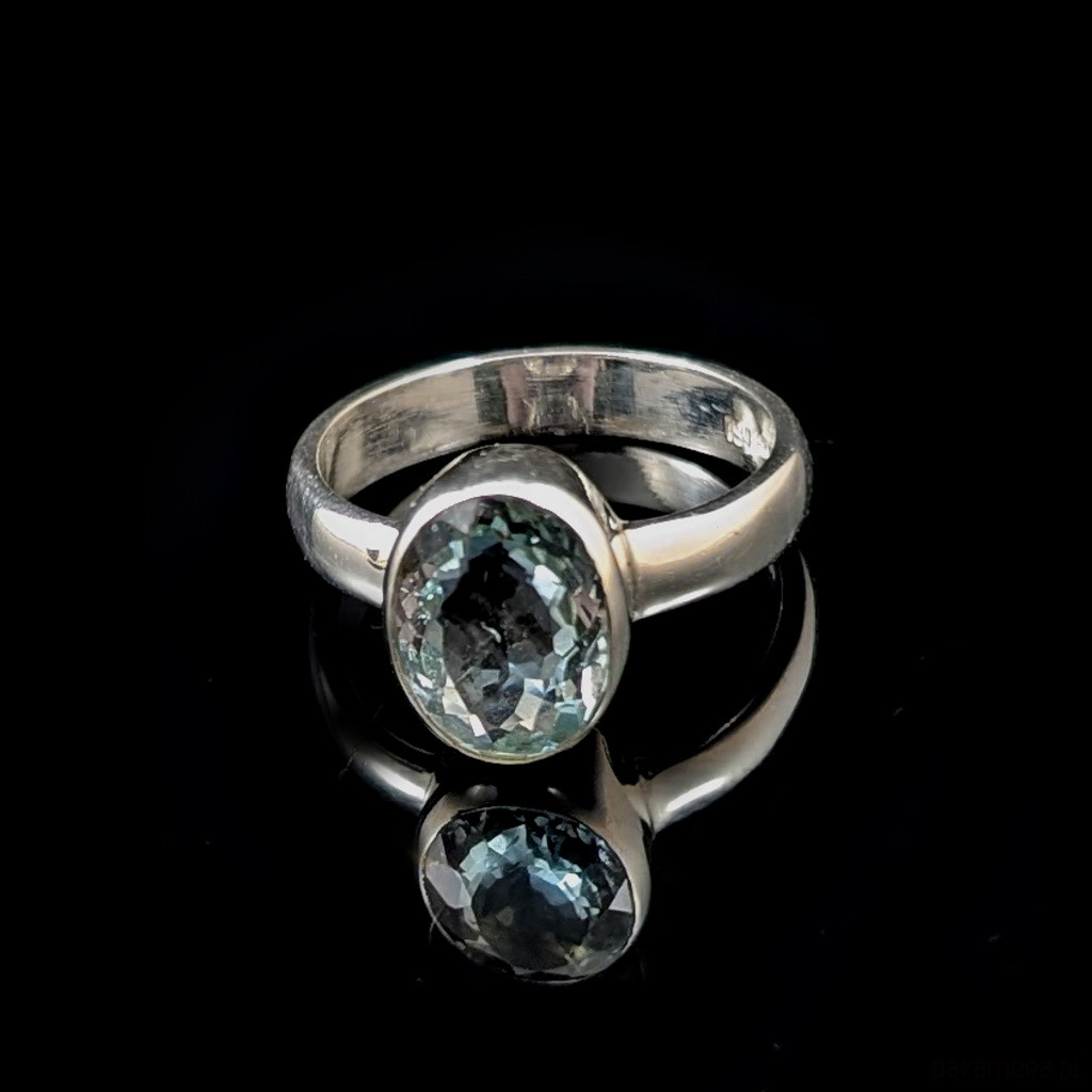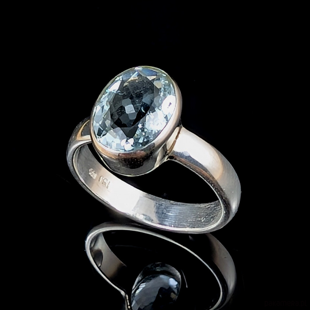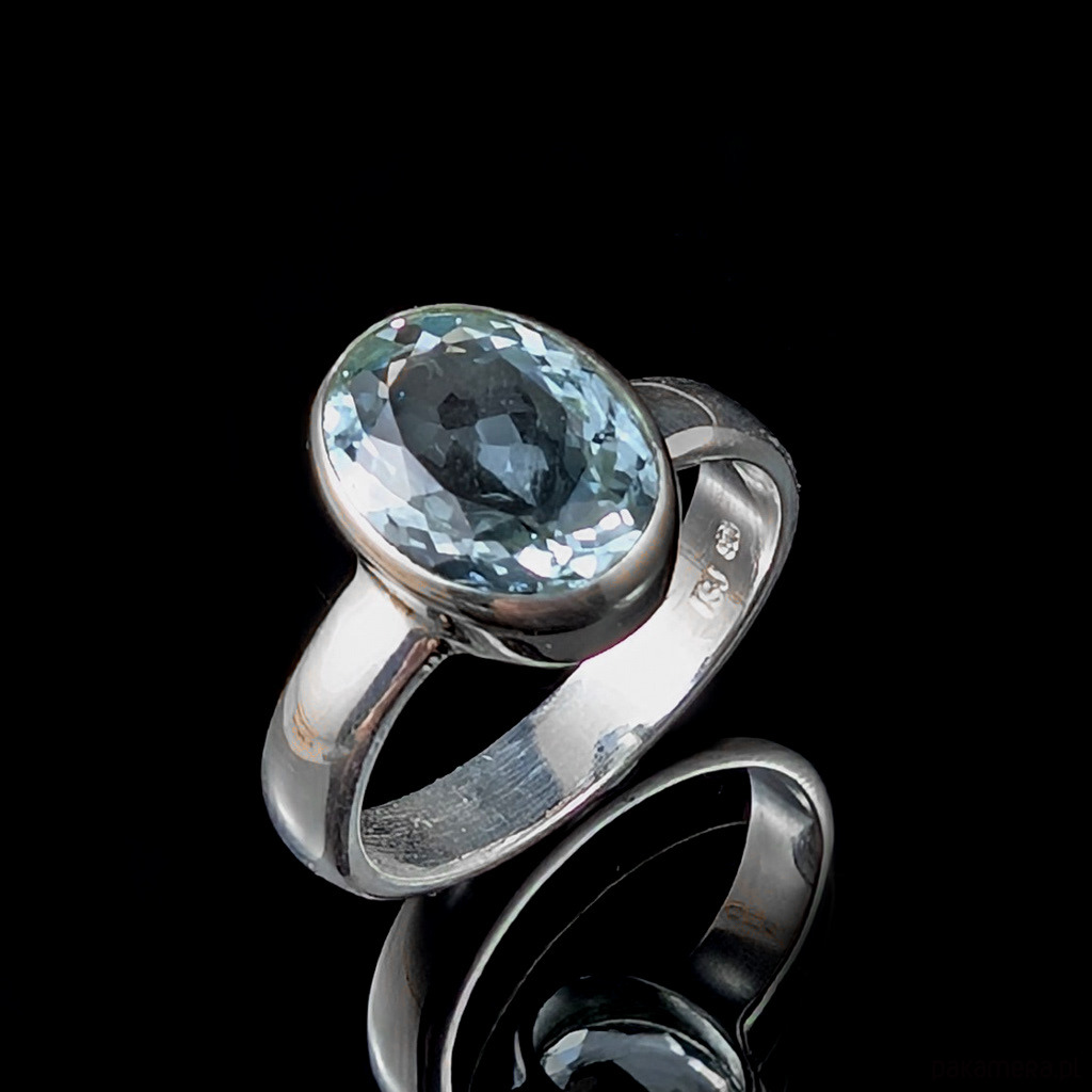 Pierścień z oprawionym w srebro próby 925 pięknym, dostojnym akwamarynem. Szerokość obrączki 4 mm. Okazały, niezwykle przejrzysty kamień o precyzyjnym szlifie ma oprawę 12 x 9mm. Rozmiar jubilerski 14. Mogę powiększyć na max 15. Proszę pytać w sprawie innych rozmiarów. Polecam, jest przepiękny. Oprawa z tyłu otwarta co potęguje przejrzystość kamienia. Waga 5 gramów. Wykonany przez dostawcę kamieni. Pierścień zapakowany zostanie w ozdobne pudełeczko.