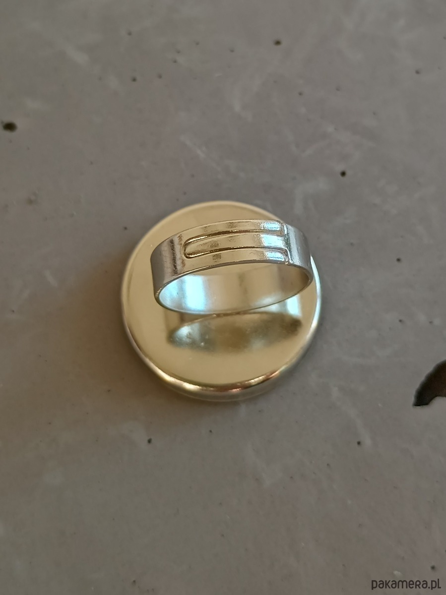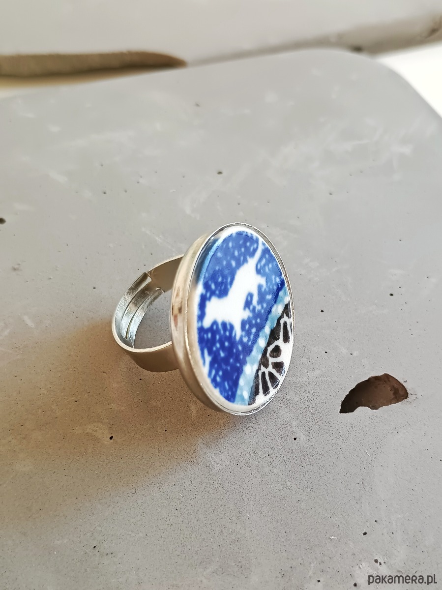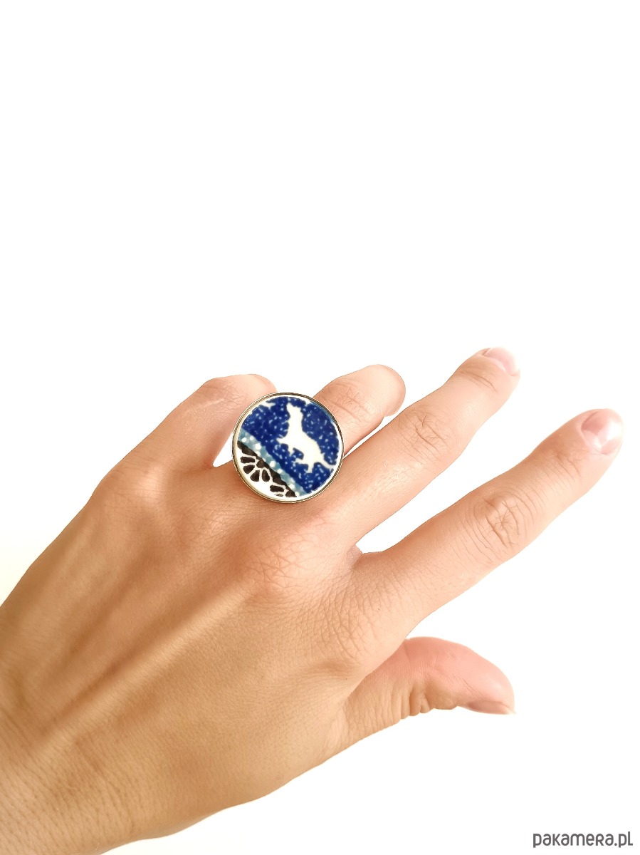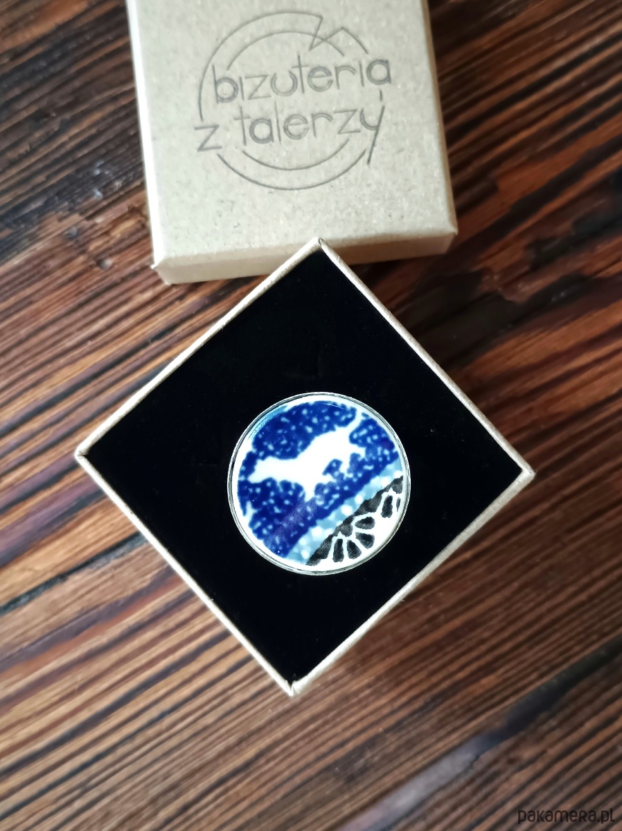 Ceramika w Bolesławcu i jego okolicach produkowana była już w XIV wieku. Do dziś najważniejszy surowiec, czyli glina wydobywany jest na miejscu, a tradycja wyrobu naczyń ceramicznych, rozwijana i kultywowana przez wieki - trwa. Bolesławiec jako marka, tworzona przez kilkadziesiąt różnych manufaktur, znana jest na całym świecie, a charakterystycznego wzoru w kobaltowe kropki nie sposób pomylić z żadnym innym. Co najbardziej wyróżnia Bolesławiec, to że szkliwo nakładane jest ręcznie, za pomocą stempelków z gąbki. Oto pierścionek, który wykonałam z fragmentu stłuczonego talerza z motywem jamników, wykonanego właśnie w Bolesławcu. Kawałek stłuczki oszlifowałam w okrągły kształt i połączyłam z metalową bazą w kolorze srebrnym. Baza jest regulowana - będzie pasowała na każdy rozmiar. Ceramikę zeszlifowałam również z grubości - jest cieńsza niż pierwotnie, dzięki czemu pierścionek nie jest ciężki. Brzegi pokryłam lakierem, co sprawia, że nie brudzą się i nie chłoną wilgoci. Średnica elementu ceramicznego: 25 mm. Unikat - każdy z moich wyrobów występuje w jednym egzemplarzu. Upcykling - nie reprodukuję wykorzystywanych wzorów, niczego nie domalowuję - wykorzystuję wyłącznie oryginalne naczynia i motywy, które się na nich znajdują. Tym samym, stłuczce z odzysku nadaję nowe życie.