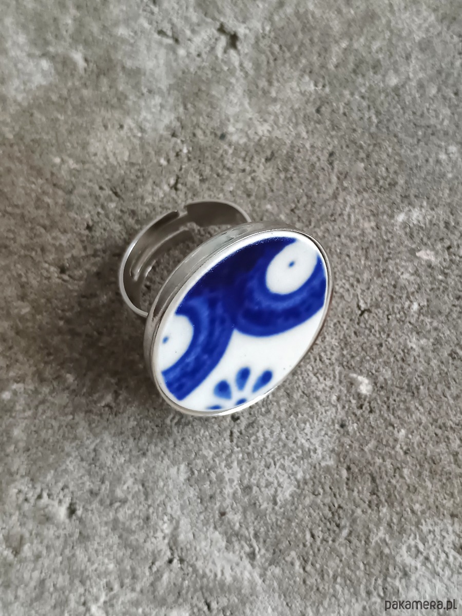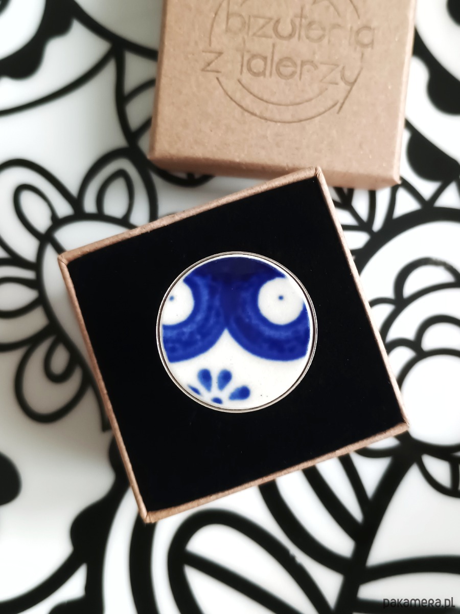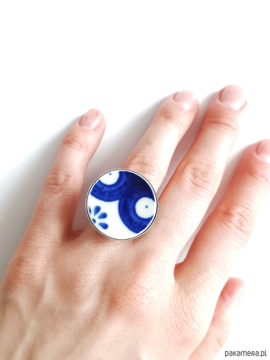 Ceramika w Bolesławcu i jego okolicach produkowana była już w XIV wieku. Do dziś najważniejszy surowiec, czyli glina wydobywany jest na miejscu, a tradycja wyrobu naczyń ceramicznych, rozwijana i kultywowana przez wieki - trwa. Bolesławiec jako marka, tworzona przez kilkadziesiąt różnych manufaktur, znana jest na całym świecie, a charakterystycznego wzoru w kobaltowe kropki nie sposób pomylić z żadnym innym. Co najbardziej wyróżnia Bolesławiec, to że szkliwo nakładane jest ręcznie, za pomocą stempelków z gąbki. Oto pierścionek, który wykonałam z fragmentu stłuczonego talerza, wykonanego właśnie w Bolesławcu. Kawałek stłuczki oszlifowałam w okrągły kształt i połączyłam z metalową bazą w kolorze srebrnym. Baza jest regulowana - będzie pasowała na każdy rozmiar. Ceramikę zeszlifowałam również z grubości - jest cieńsza niż pierwotnie, dzięki czemu pierścionek nie jest ciężki. Brzegi pokryłam lakierem, co sprawia, że nie brudzą się i nie chłoną wilgoci. Średnica elementu ceramicznego: 25 mm. Unikat - każdy z moich wyrobów występuje w jednym egzemplarzu. Upcykling - nie reprodukuję wykorzystywanych wzorów, niczego nie domalowuję - wykorzystuję wyłącznie oryginalne naczynia i motywy, które się na nich znajdują. Tym samym, stłuczce z odzysku nadaję nowe życie.