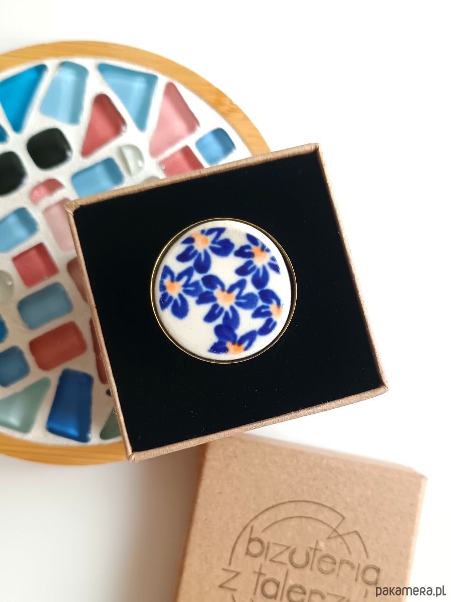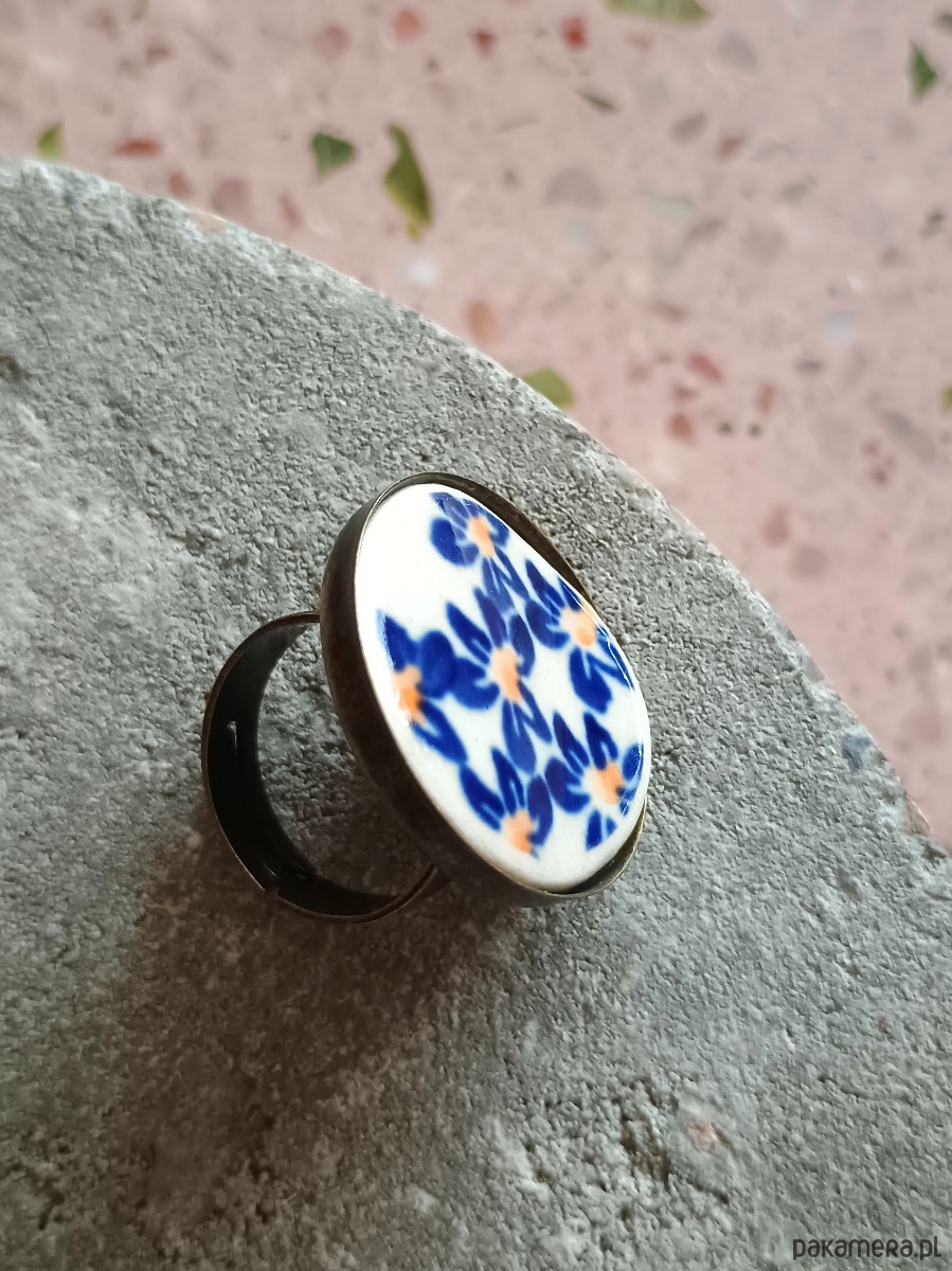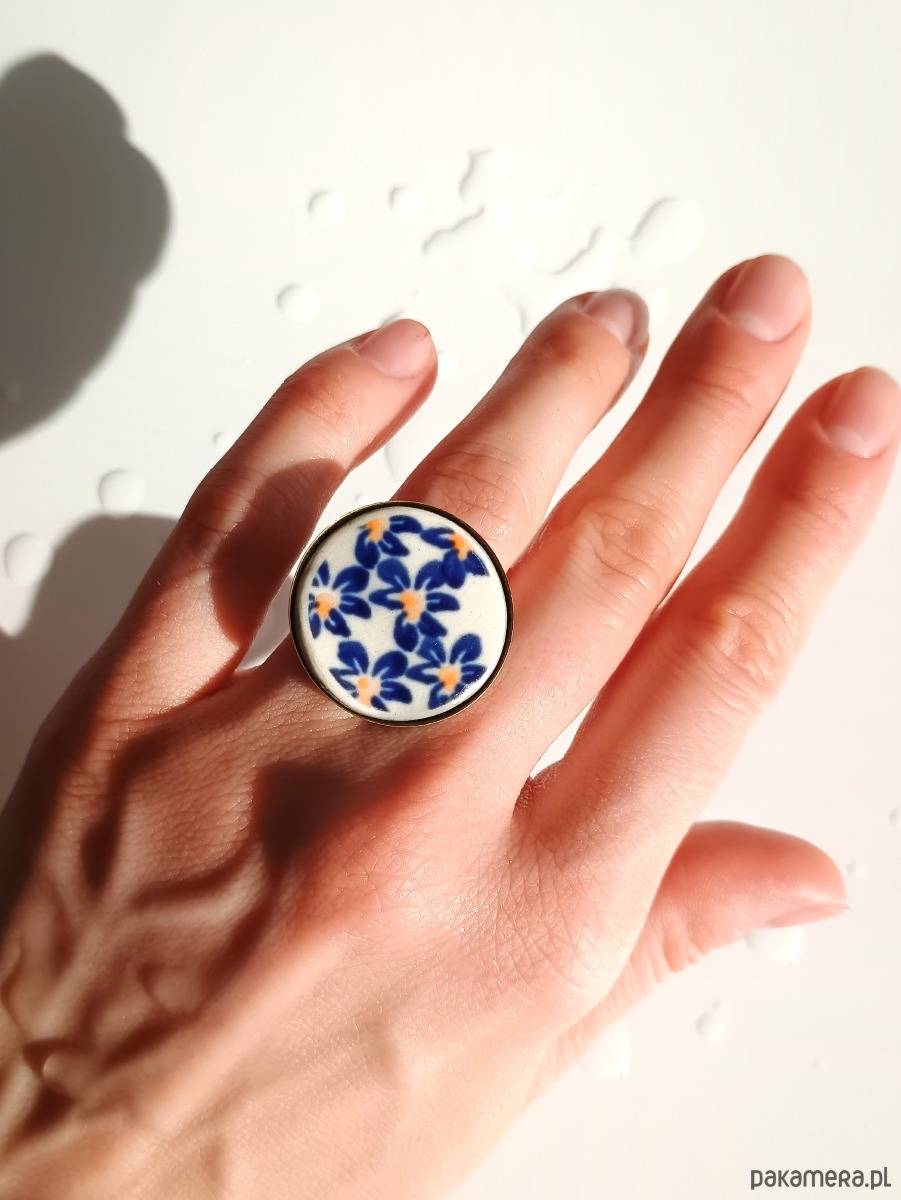Ceramika w Bolesławcu i jego okolicach produkowana była już w XIV wieku. Do dziś najważniejszy surowiec, czyli glina wydobywany jest na miejscu, a tradycja wyrobu naczyń ceramicznych, rozwijana i kultywowana przez wieki - trwa. Bolesławiec jako marka, tworzona przez kilkadziesiąt różnych manufaktur, znana jest na całym świecie, a charakterystycznego wzoru w kobaltowe kropki nie sposób pomylić z żadnym innym. Co najbardziej wyróżnia Bolesławiec, to że szkliwo nakładane jest ręcznie, za pomocą stempelków z gąbki. Oto pierścionek, który wykonałam z fragmentu stłuczonego talerza, wykonanego właśnie w Bolesławcu. Kawałek stłuczki oszlifowałam w okrągły kształt i połączyłam z metalową bazą w kolorze mosiądzu. Baza jest regulowana - będzie pasowała na każdy rozmiar. Ceramikę zeszlifowałam również z grubości - jest cieńsza niż pierwotnie, dzięki czemu pierścionek nie jest ciężki. Brzegi pokryłam lakierem, co sprawia, że nie brudzą się i nie chłoną wilgoci. Średnica elementu ceramicznego: 26 mm. Unikat - każdy z moich wyrobów występuje w jednym egzemplarzu. Upcykling - nie reprodukuję wykorzystywanych wzorów, niczego nie domalowuję - wykorzystuję wyłącznie oryginalne naczynia i motywy, które się na nich znajdują. Tym samym, stłuczce z odzysku nadaję nowe życie.