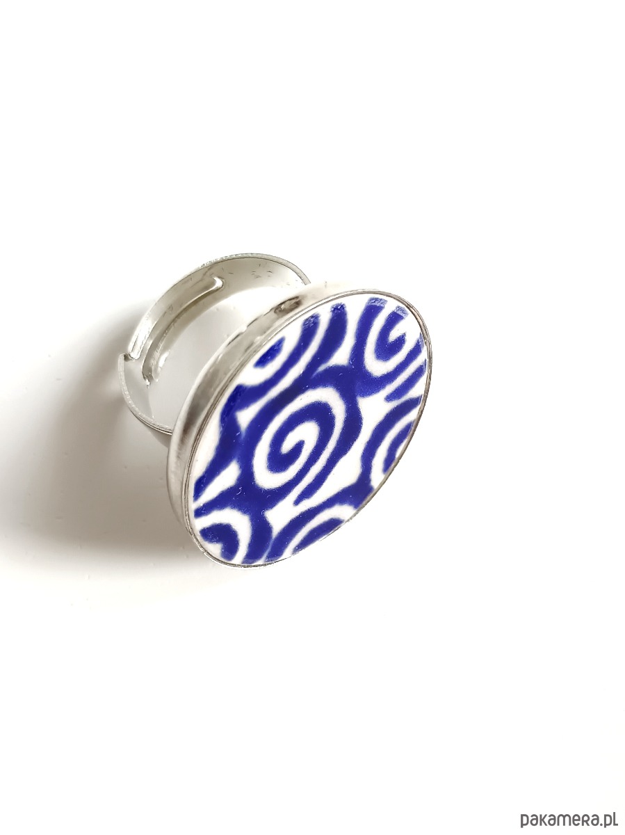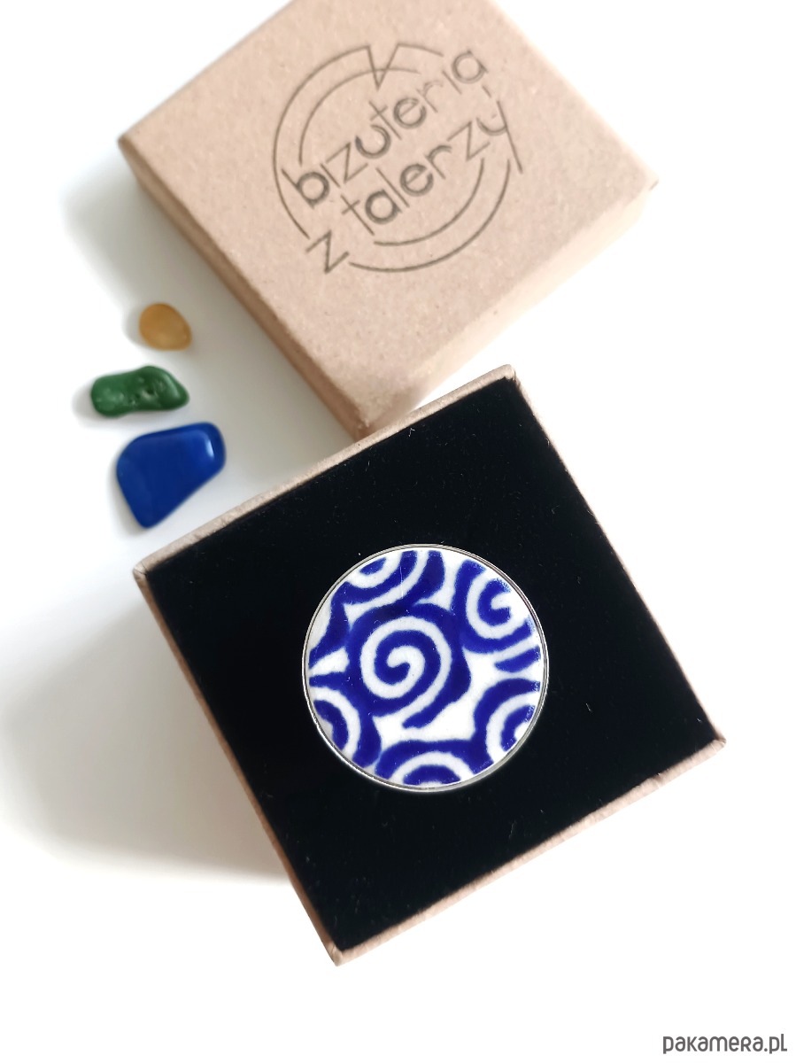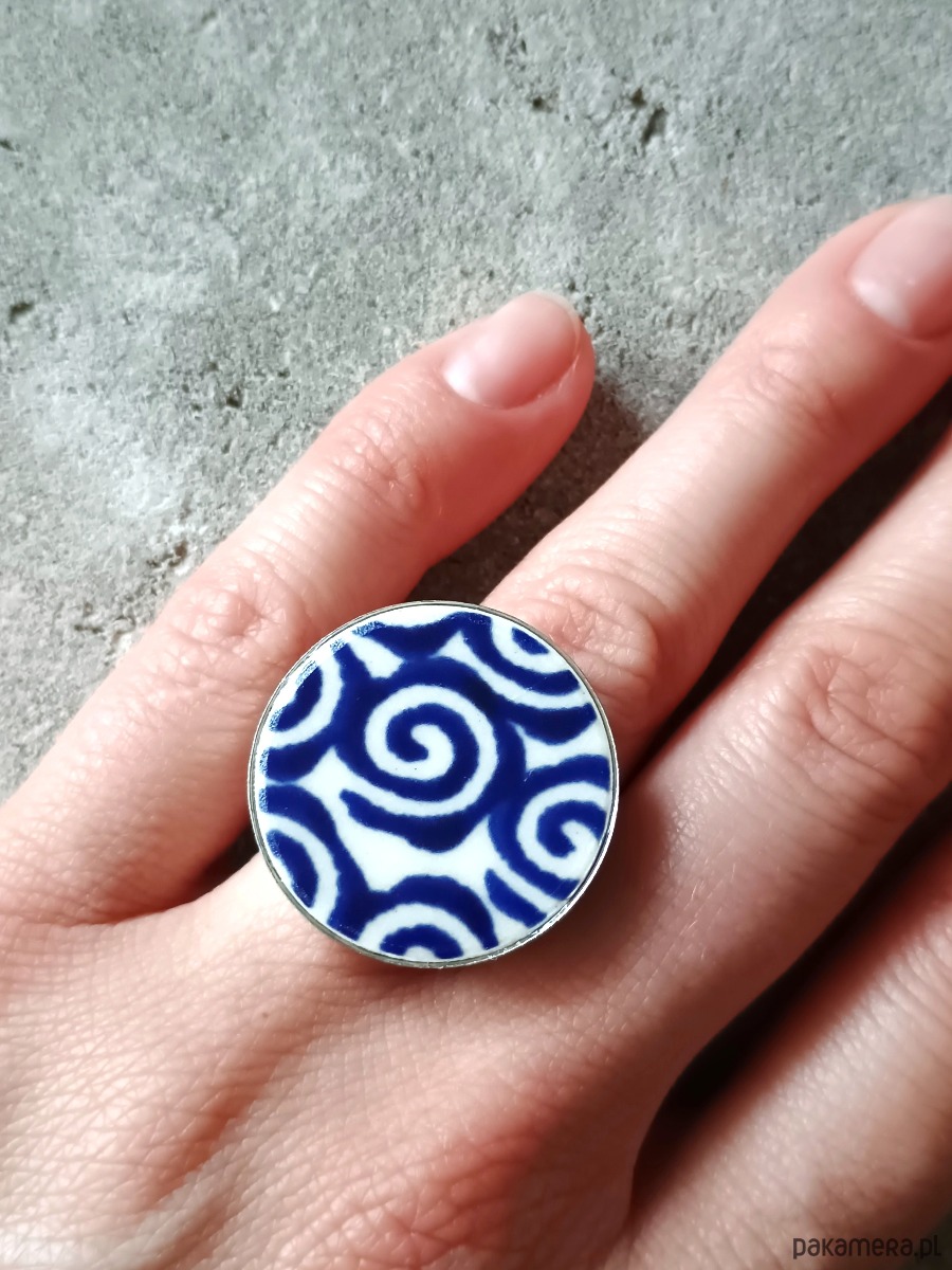 Ceramika w Bolesławcu i jego okolicach produkowana była już w XIV wieku. Do dziś najważniejszy surowiec, czyli glina wydobywany jest na miejscu, a tradycja wyrobu naczyń ceramicznych, rozwijana i kultywowana przez wieki - trwa. Bolesławiec jako marka, tworzona przez kilkadziesiąt różnych manufaktur, znana jest na całym świecie, a charakterystycznego wzoru w kobaltowe kropki nie sposób pomylić z żadnym innym. Co najbardziej wyróżnia Bolesławiec, to że szkliwo nakładane jest ręcznie, za pomocą stempelków z gąbki. Oto pierścionek, który wykonałam z fragmentu stłuczonego talerza, wykonanego właśnie w Bolesławcu. Kawałek stłuczki oszlifowałam w okrągły kształt i połączyłam z metalową bazą w kolorze srebrnym. Baza jest regulowana - będzie pasowała na każdy rozmiar. Ceramikę zeszlifowałam również z grubości - jest cieńsza niż pierwotnie, dzięki czemu pierścionek nie jest ciężki. Brzegi pokryłam lakierem, co sprawia, że nie brudzą się i nie chłoną wilgoci. Średnica elementu ceramicznego: 26 mm. Unikat - każdy z moich wyrobów występuje w jednym egzemplarzu. Upcykling - nie reprodukuję wykorzystywanych wzorów, niczego nie domalowuję - wykorzystuję wyłącznie oryginalne naczynia i motywy, które się na nich znajdują. Tym samym, stłuczce z odzysku nadaję nowe życie.