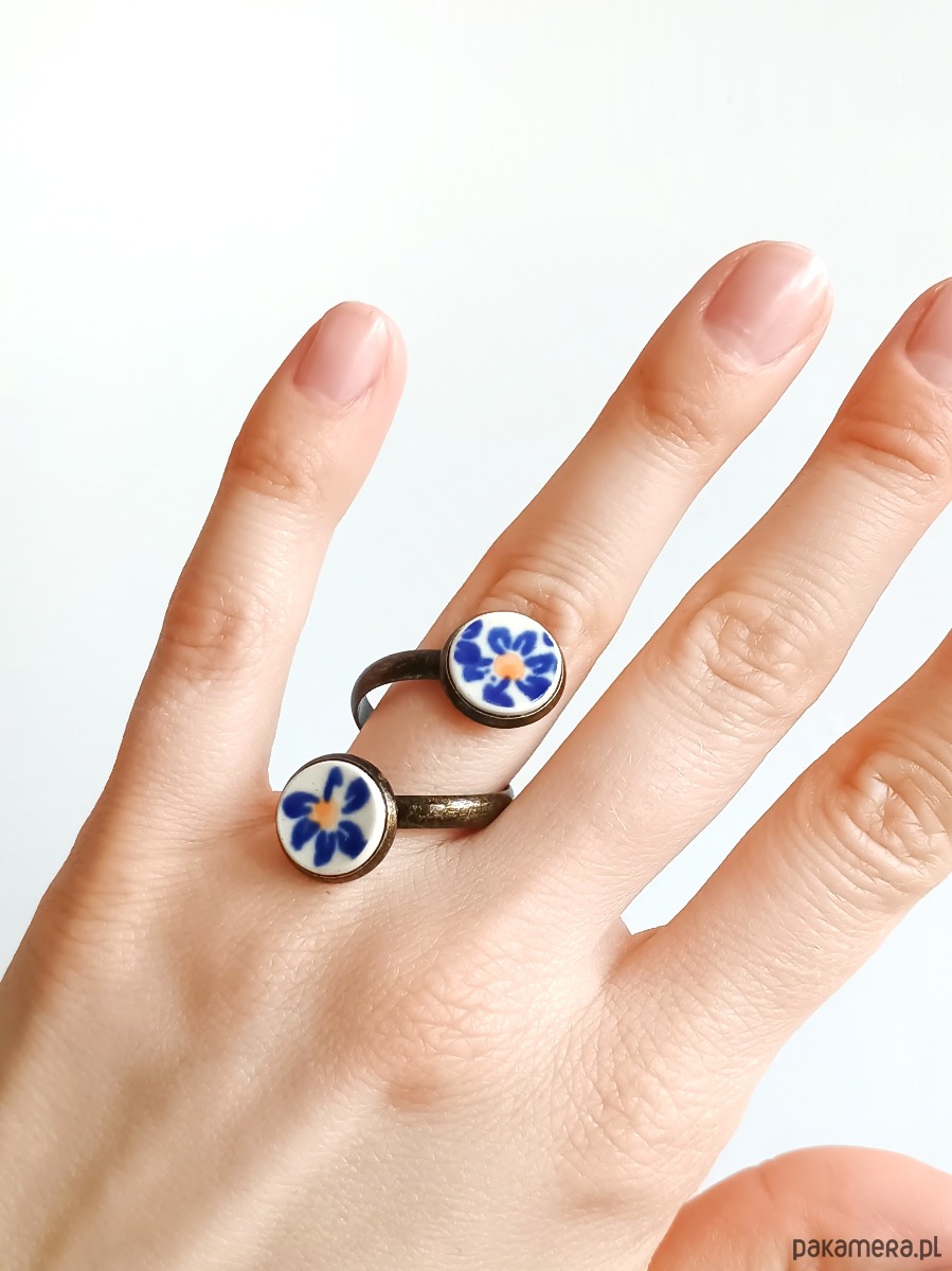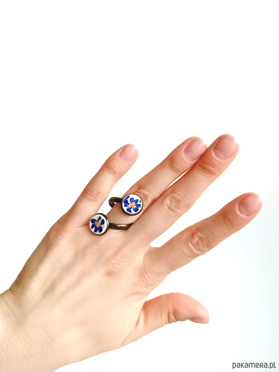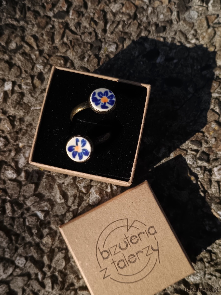 Ceramika w Bolesławcu i jego okolicach produkowana była już w XIV wieku. Do dziś najważniejszy surowiec, czyli glina wydobywany jest na miejscu, a tradycja wyrobu naczyń ceramicznych, rozwijana i kultywowana przez wieki - trwa. Bolesławiec jako marka, tworzona przez kilkadziesiąt różnych manufaktur, znana jest na całym świecie, a charakterystycznego wzoru w kobaltowe kropki nie sposób pomylić z żadnym innym. Co najbardziej wyróżnia Bolesławiec, to że szkliwo nakładane jest ręcznie, za pomocą stempelków z gąbki. Oto pierścionek z dwoma oczkami, które wykonałam z fragmentów ceramiki bolesławieckiej w kwiaty. Kawałki stłuczki oszlifowałam w okrągłe kształty i połączyłam z metalową bazą w kolorze mosiądzu. Baza jest regulowana - będzie pasowała na każdy rozmiar. Ceramikę zeszlifowałam również z grubości - jest cieńsza niż pierwotnie, dzięki czemu pierścionek nie jest ciężki. Brzegi pokryłam lakierem, co sprawia, że nie brudzą się i nie chłoną wilgoci. Średnica elementów ceramicznych: 12 mm. Unikat - każdy z moich wyrobów występuje w jednym egzemplarzu. Upcykling - nie reprodukuję wykorzystywanych wzorów, niczego nie domalowuję - wykorzystuję wyłącznie oryginalne naczynia i motywy, które się na nich znajdują. Tym samym, stłuczce z odzysku nadaję nowe życie.