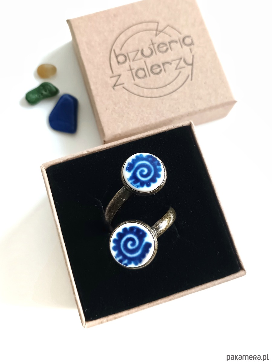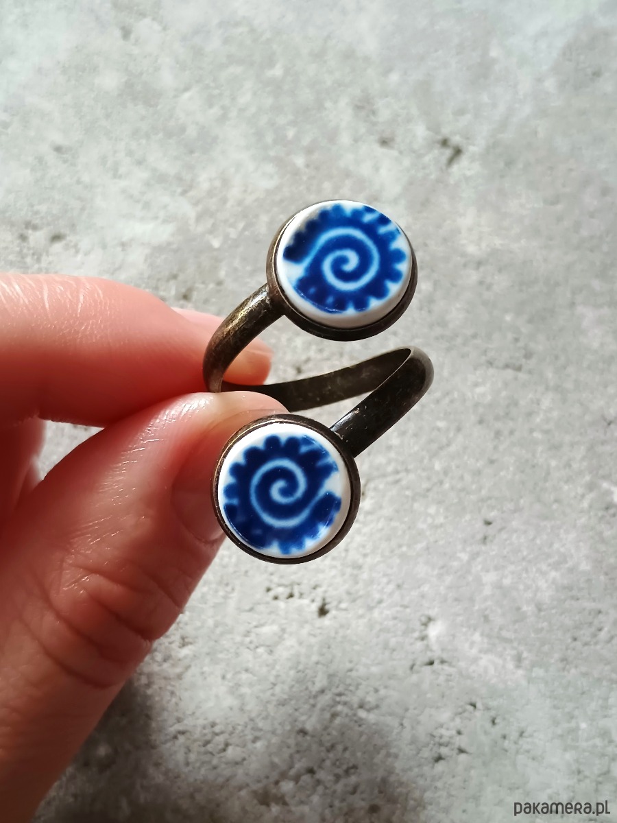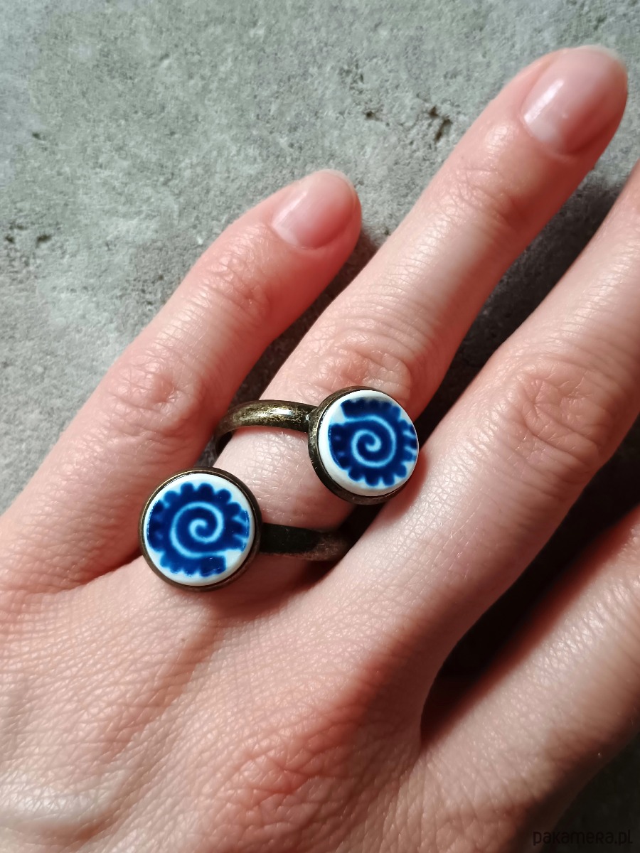 Ceramika w Bolesławcu i jego okolicach produkowana była już w XIV wieku. Do dziś najważniejszy surowiec, czyli glina wydobywany jest na miejscu, a tradycja wyrobu naczyń ceramicznych, rozwijana i kultywowana przez wieki - trwa. Bolesławiec jako marka, tworzona przez kilkadziesiąt różnych manufaktur, znana jest na całym świecie, a charakterystycznego wzoru w kobaltowe kropki nie sposób pomylić z żadnym innym. Co najbardziej wyróżnia Bolesławiec, to że szkliwo nakładane jest ręcznie, za pomocą stempelków z gąbki. Oto pierścionek z dwoma oczkami, które wykonałam z fragmentów ceramiki bolesławieckiej. Kawałki stłuczki oszlifowałam w okrągłe kształty i połączyłam z metalową bazą w kolorze mosiądzu. Baza jest regulowana - będzie pasowała na każdy rozmiar. Ceramikę zeszlifowałam również z grubości - jest cieńsza niż pierwotnie, dzięki czemu pierścionek nie jest ciężki. Brzegi pokryłam lakierem, co sprawia, że nie brudzą się i nie chłoną wilgoci. Średnica elementów ceramicznych: 12 mm. Unikat - każdy z moich wyrobów występuje w jednym egzemplarzu. Upcykling - nie reprodukuję wykorzystywanych wzorów, niczego nie domalowuję - wykorzystuję wyłącznie oryginalne naczynia i motywy, które się na nich znajdują. Tym samym, stłuczce z odzysku nadaję nowe życie.