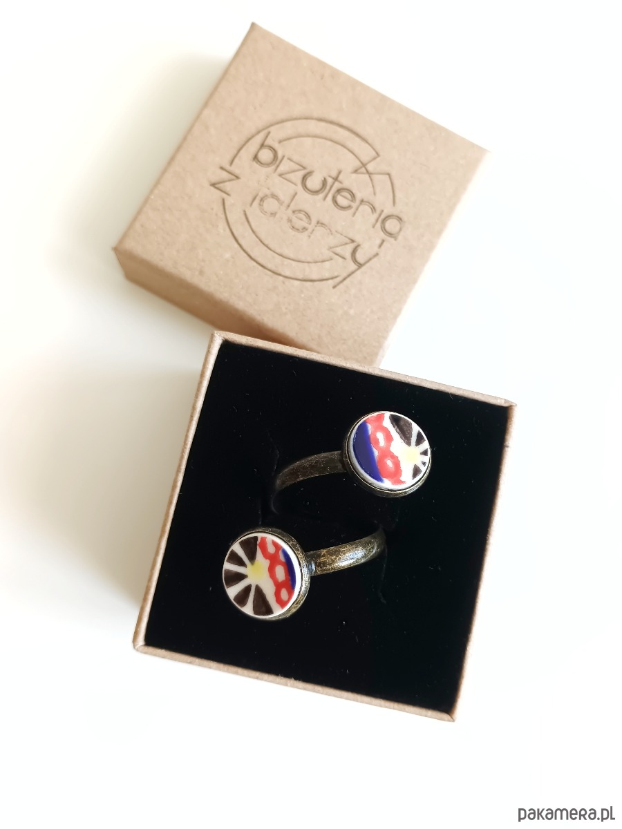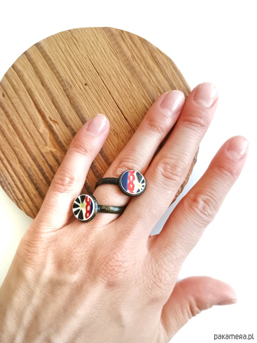 Ceramika w Bolesławcu i jego okolicach produkowana była już w XIV wieku. Do dziś najważniejszy surowiec, czyli glina wydobywany jest na miejscu, a tradycja wyrobu naczyń ceramicznych, rozwijana i kultywowana przez wieki - trwa. Bolesławiec jako marka, tworzona przez kilkadziesiąt różnych manufaktur, znana jest na całym świecie, a charakterystycznego wzoru w kobaltowe kropki nie sposób pomylić z żadnym innym. Co najbardziej wyróżnia Bolesławiec, to że szkliwo nakładane jest ręcznie, za pomocą stempelków z gąbki. Oto pierścionek z dwoma oczkami, które wykonałam z fragmentów ceramiki bolesławieckiej. Kawałki stłuczki oszlifowałam w okrągłe kształty i połączyłam z metalową bazą w kolorze mosiądzu. Baza jest regulowana - będzie pasowała na każdy rozmiar. Ceramikę zeszlifowałam również z grubości - jest cieńsza niż pierwotnie, dzięki czemu pierścionek nie jest ciężki. Brzegi pokryłam lakierem, co sprawia, że nie brudzą się i nie chłoną wilgoci. Średnica elementów ceramicznych: 12 mm. Unikat - każdy z moich wyrobów występuje w jednym egzemplarzu. Upcykling - nie reprodukuję wykorzystywanych wzorów, niczego nie domalowuję - wykorzystuję wyłącznie oryginalne naczynia i motywy, które się na nich znajdują. Tym samym, stłuczce z odzysku nadaję nowe życie.