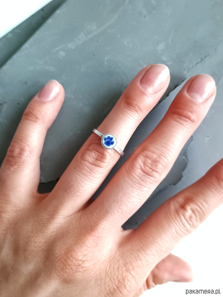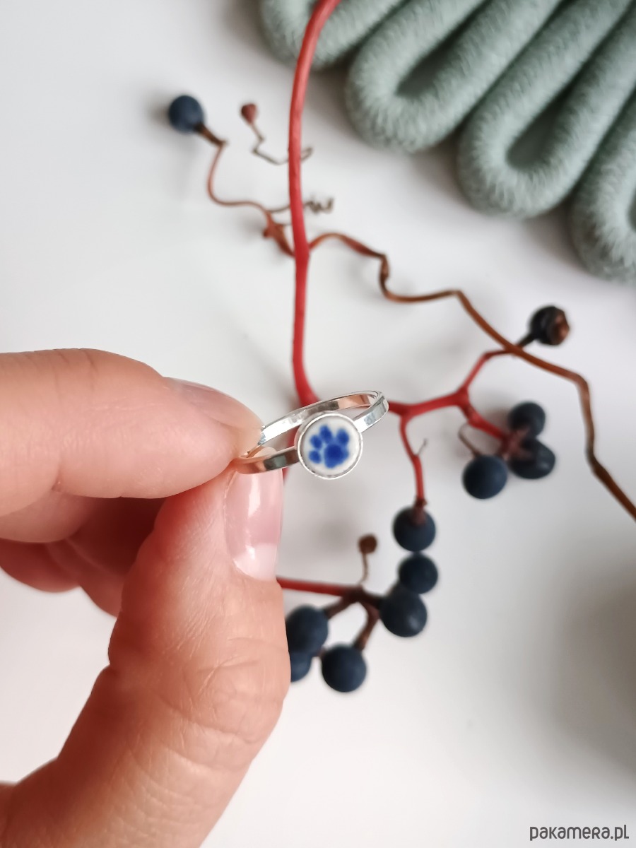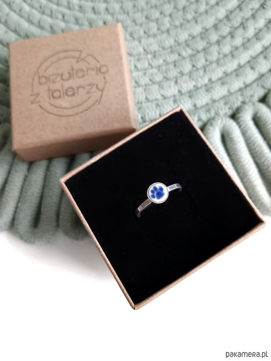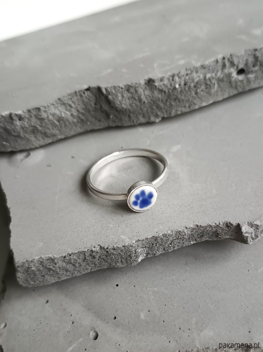 Ceramika w Bolesławcu i jego okolicach produkowana była już w XIV wieku. Do dziś najważniejszy surowiec, czyli glina wydobywany jest na miejscu, a tradycja wyrobu naczyń ceramicznych, rozwijana i kultywowana przez wieki - trwa. Bolesławiec jako marka, tworzona przez kilkadziesiąt różnych manufaktur, znana jest na całym świecie, a charakterystycznego wzoru w kobaltowe kropki nie sposób pomylić z żadnym innym. Co najbardziej wyróżnia Bolesławiec, to że szkliwo nakładane jest ręcznie, za pomocą stempelków z gąbki. Oto pierścionek, który wykonałam z fragmentu stłuczonego talerza z Bolesławca z motywem zwierzęcych łapek. Kawałek stłuczki oszlifowałam w okrągły kształt i połączyłam z bazą wykonaną ze srebra próby 925 w rozmiarze 10. Średnica "oczka" - elementu ceramicznego: 6 mm. Unikat - każdy z moich wyrobów występuje w jednym egzemplarzu. Upcykling - nie reprodukuję wykorzystywanych wzorów, niczego nie domalowuję - wykorzystuję wyłącznie oryginalne naczynia i motywy, które się na nich znajdują. Tym samym, stłuczce z odzysku nadaję nowe życie.
