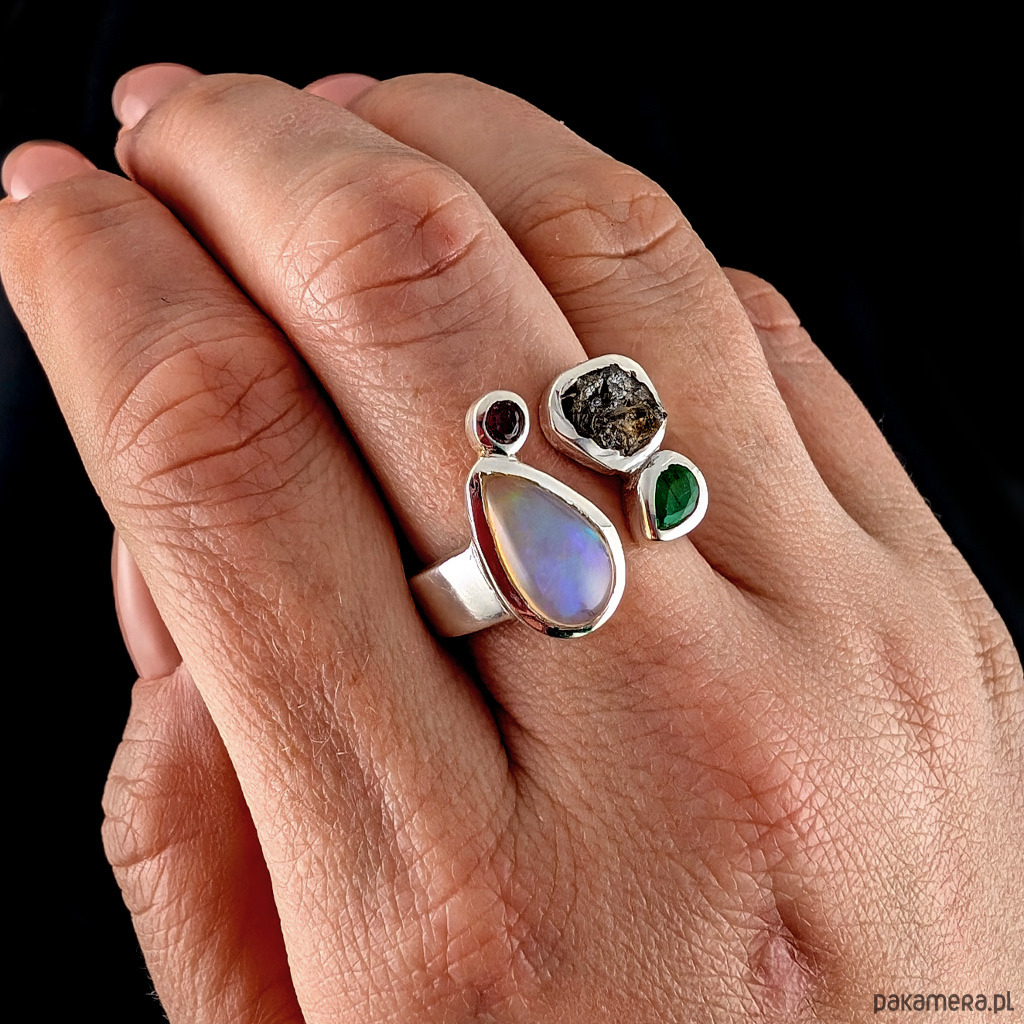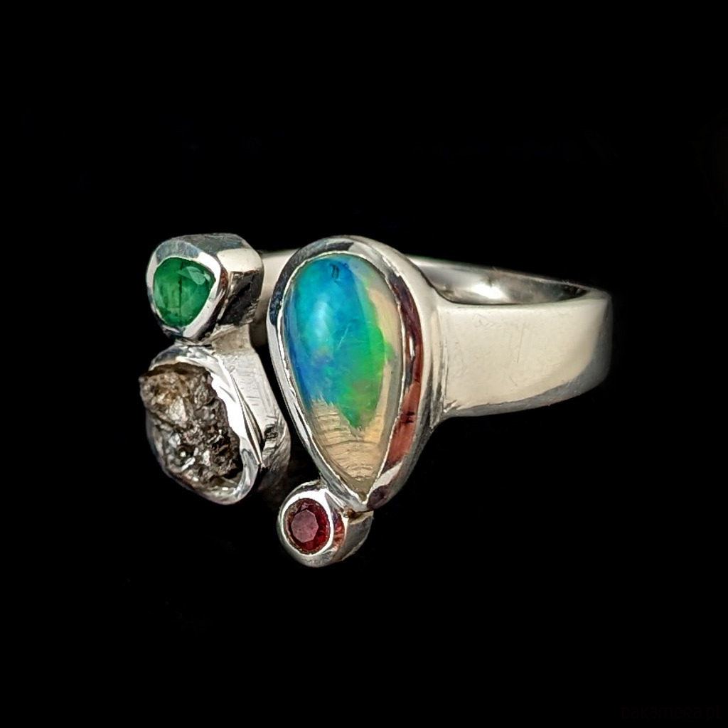 Pierścień niczym bombonierka z cukiereczkami :) Wykonany ze srebra pr. 925 oraz okazałego opalu z Etiopii, diamentu surowego, maleńskiego turmalinu i kropelki szmaragdu. Przepięny. Wymiary całej kompozycji ok 18 x 17 mm. Rozmiar jubilerski 14, mogę powiększyć na max 20. Ustawię odpowiedni, proszę o wiadomość. Waga 9,36 g. Wykonany przez dostawcę kamieni. Pierścień zostanie zapakowany w ozdobne pudełeczko.