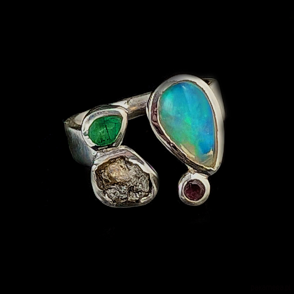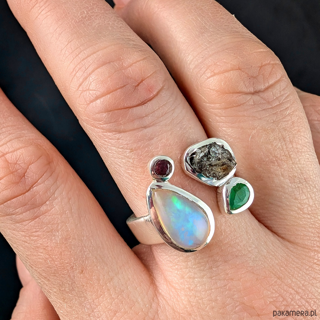 Pierścionek Bombonierka- opal szmaragd diament i turmalin