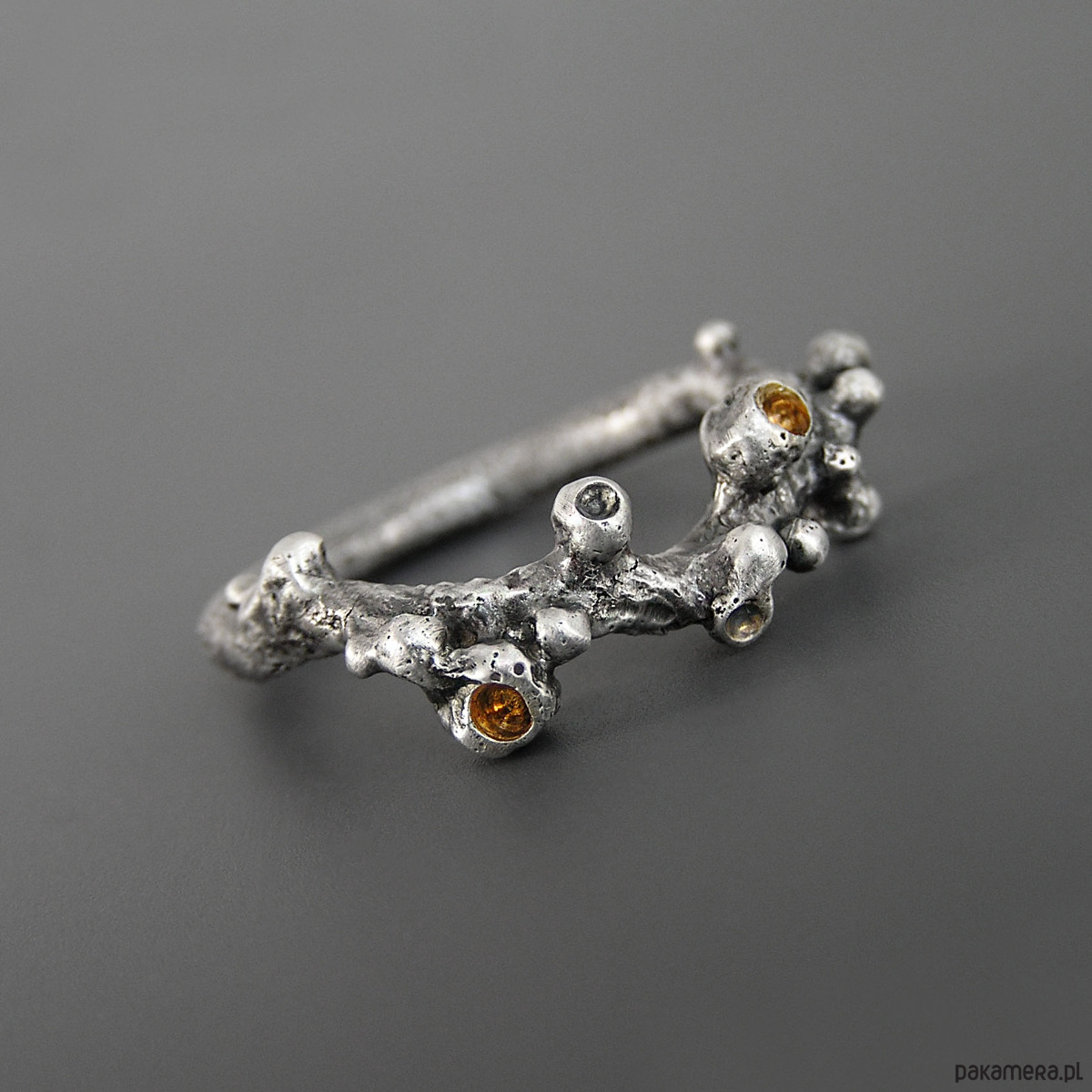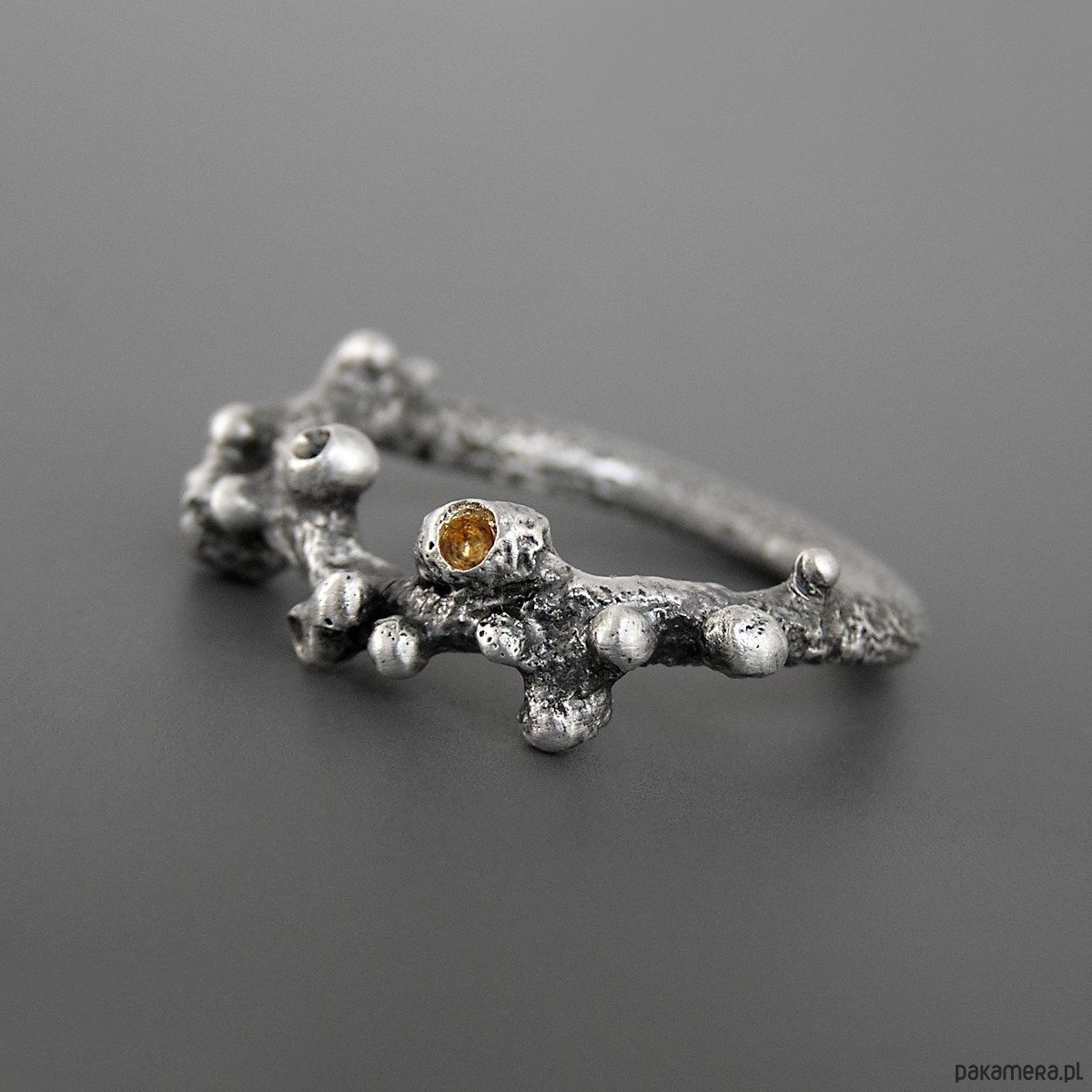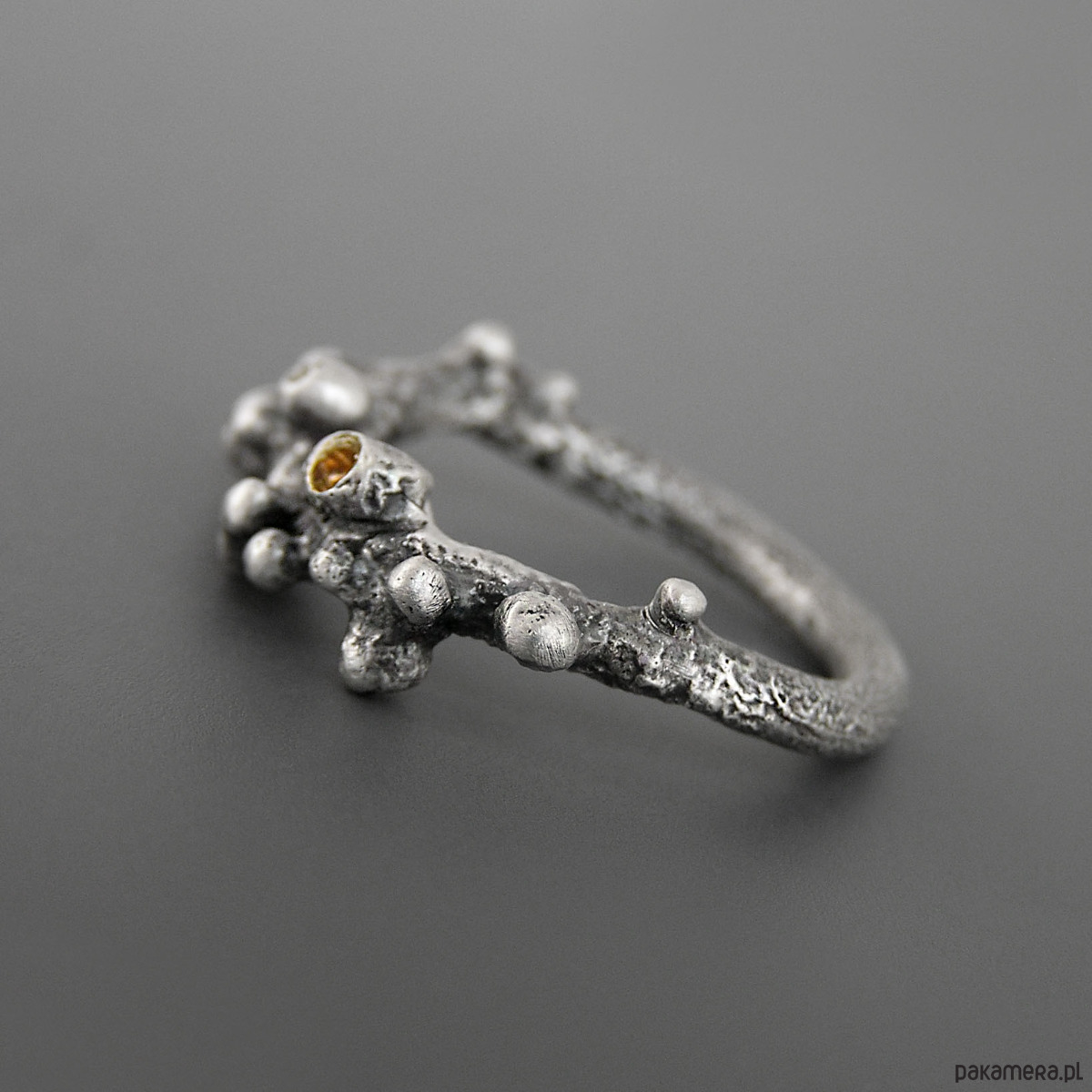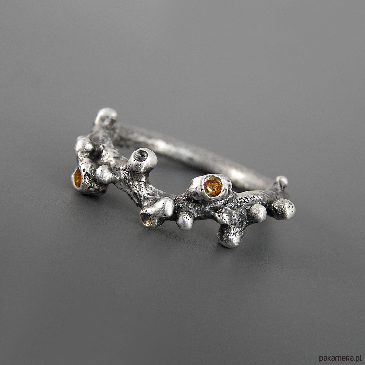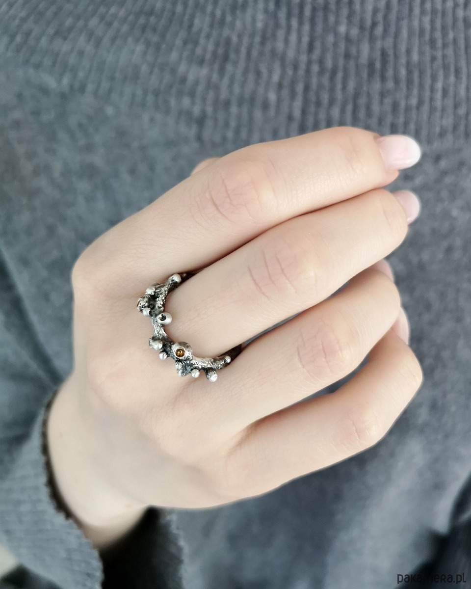 Unikatowy pierścionek wykonany ze srebra 925, z detalami złoconymi warstwą 2 mikronów 24 karatowego złota.